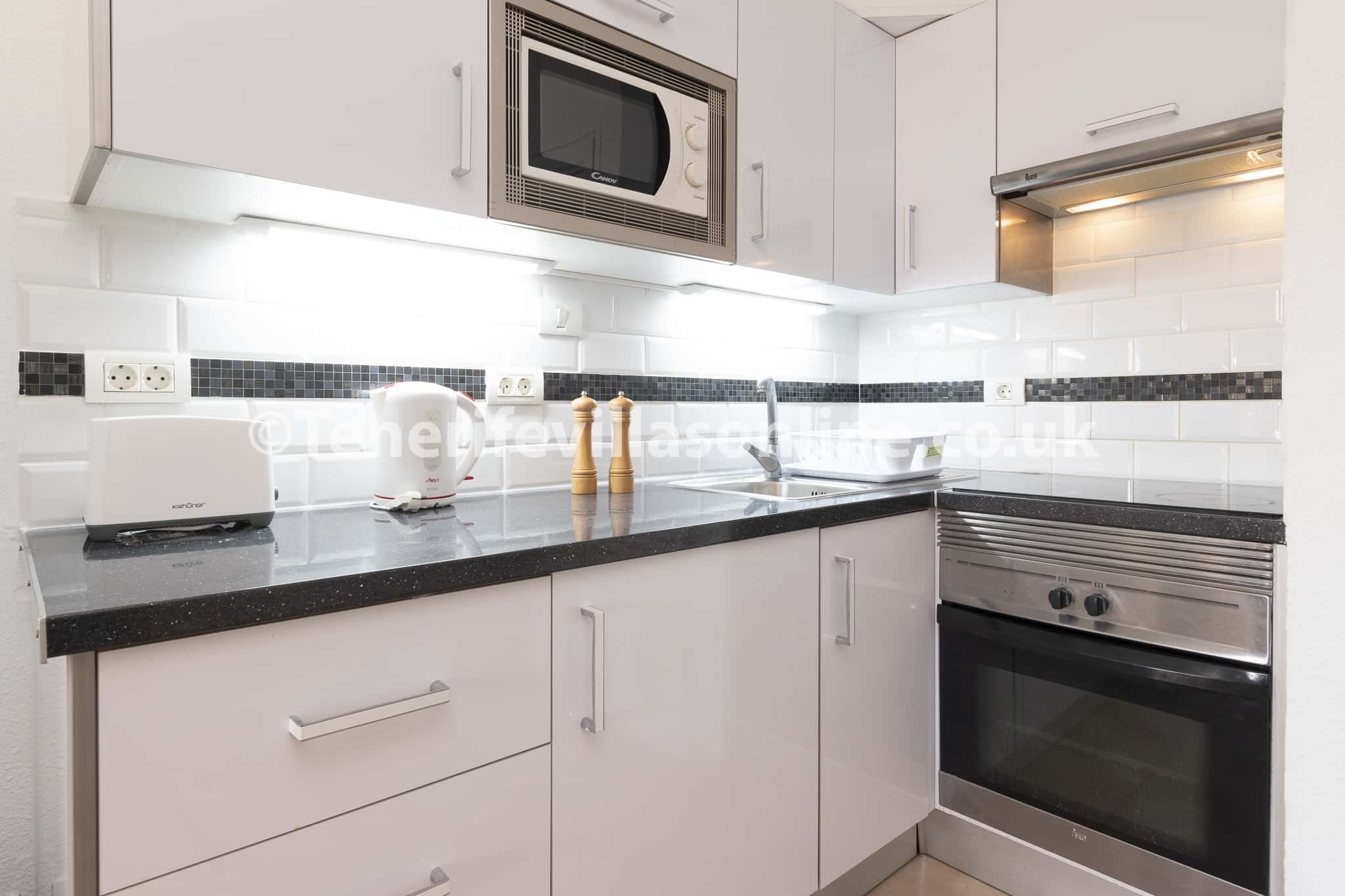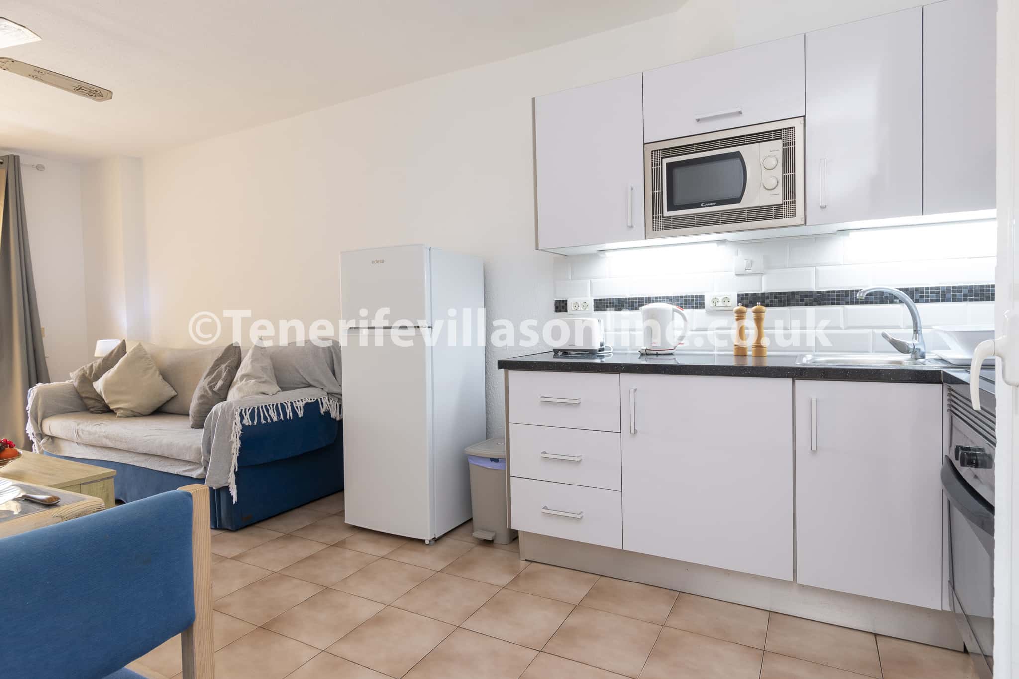 Kitchen: oven/hob, fridge/freezer, microwave, kettle, toaster
