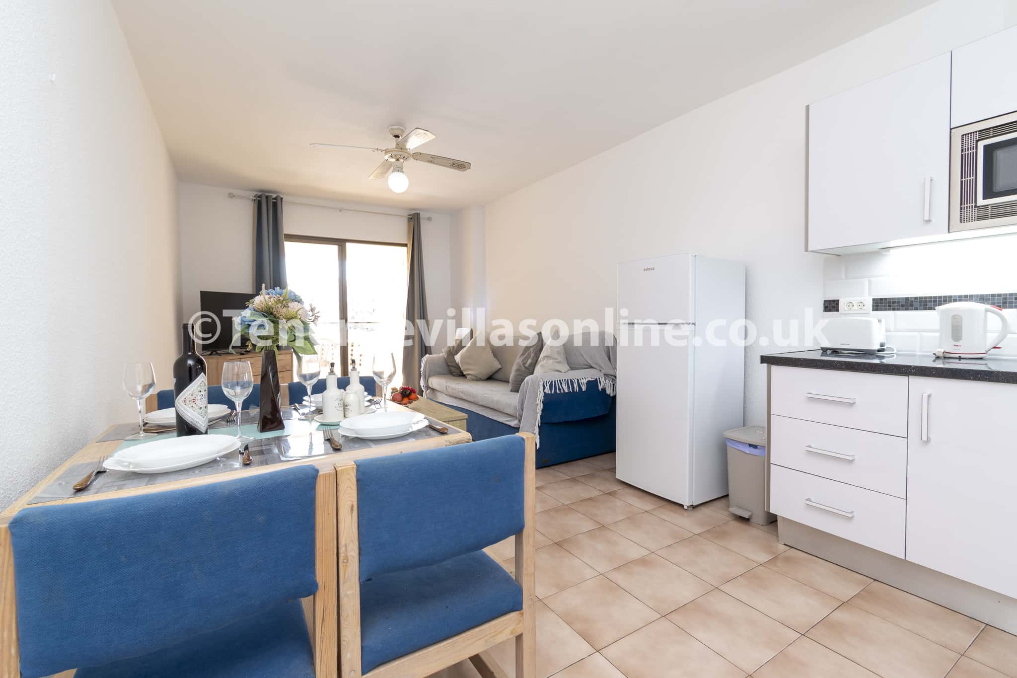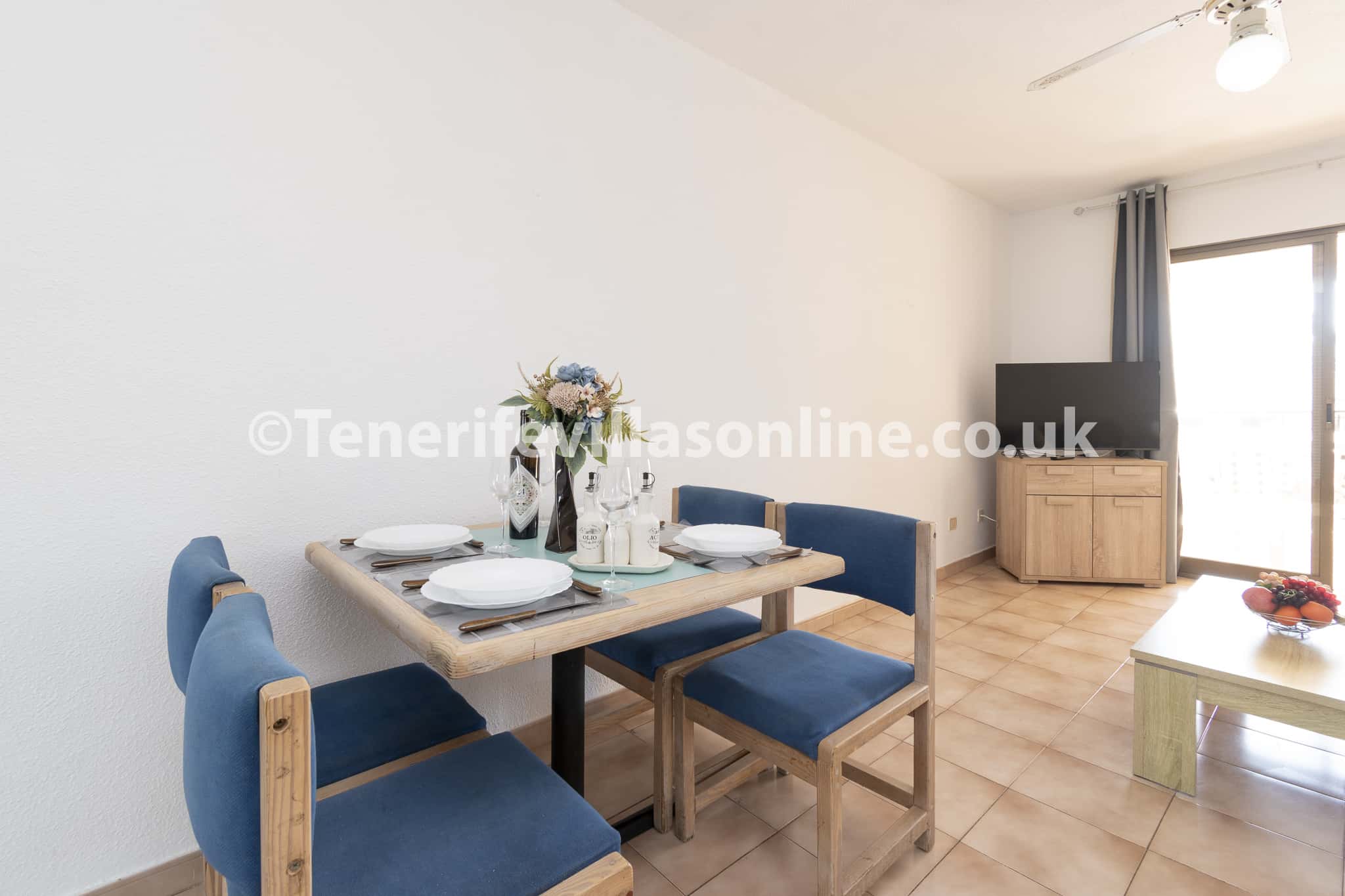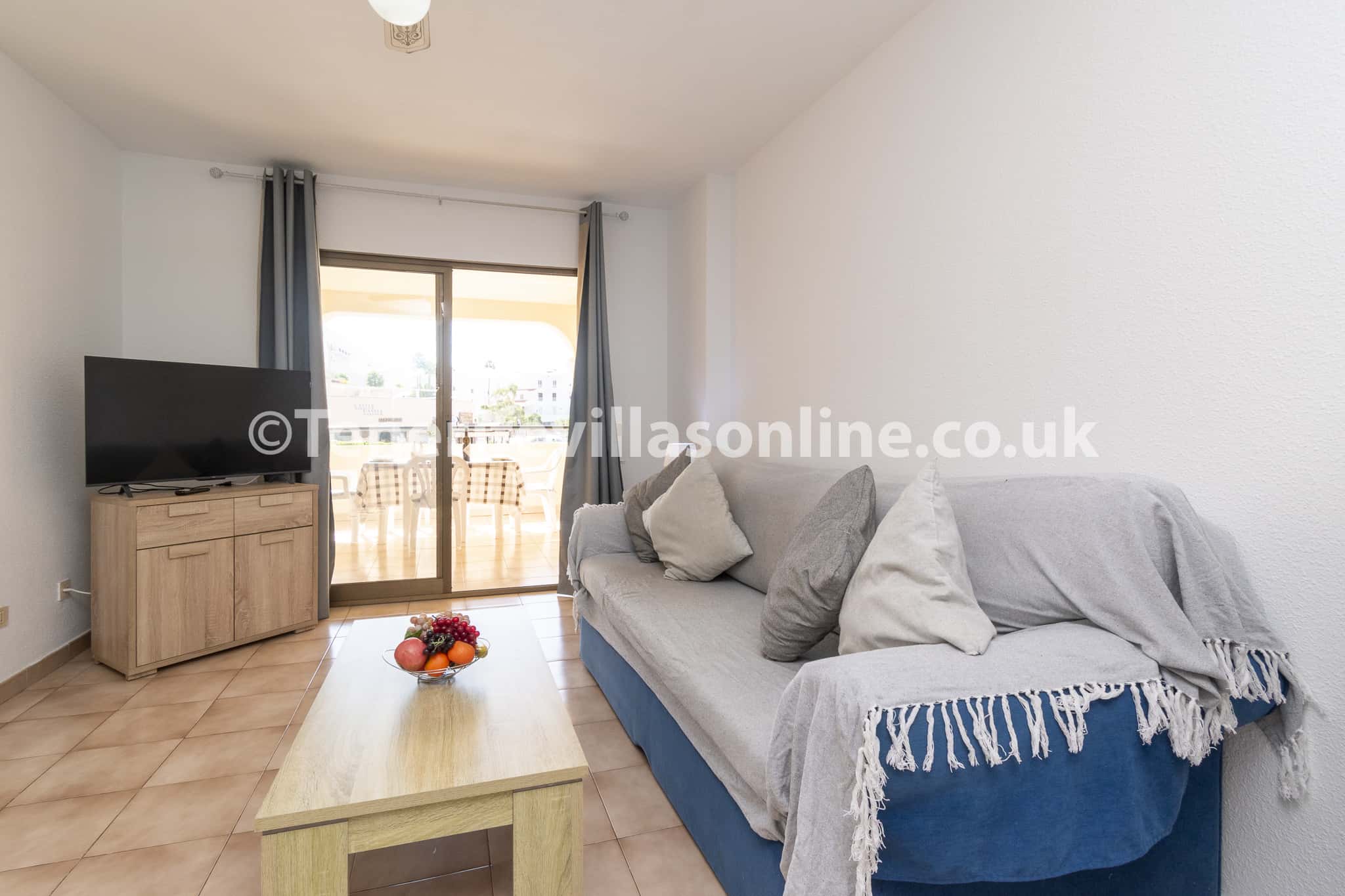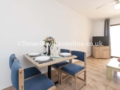 Living area: 3 seater sofa bed, flat screen smart TV, patio doors to balcony, dining table, ceiling fan