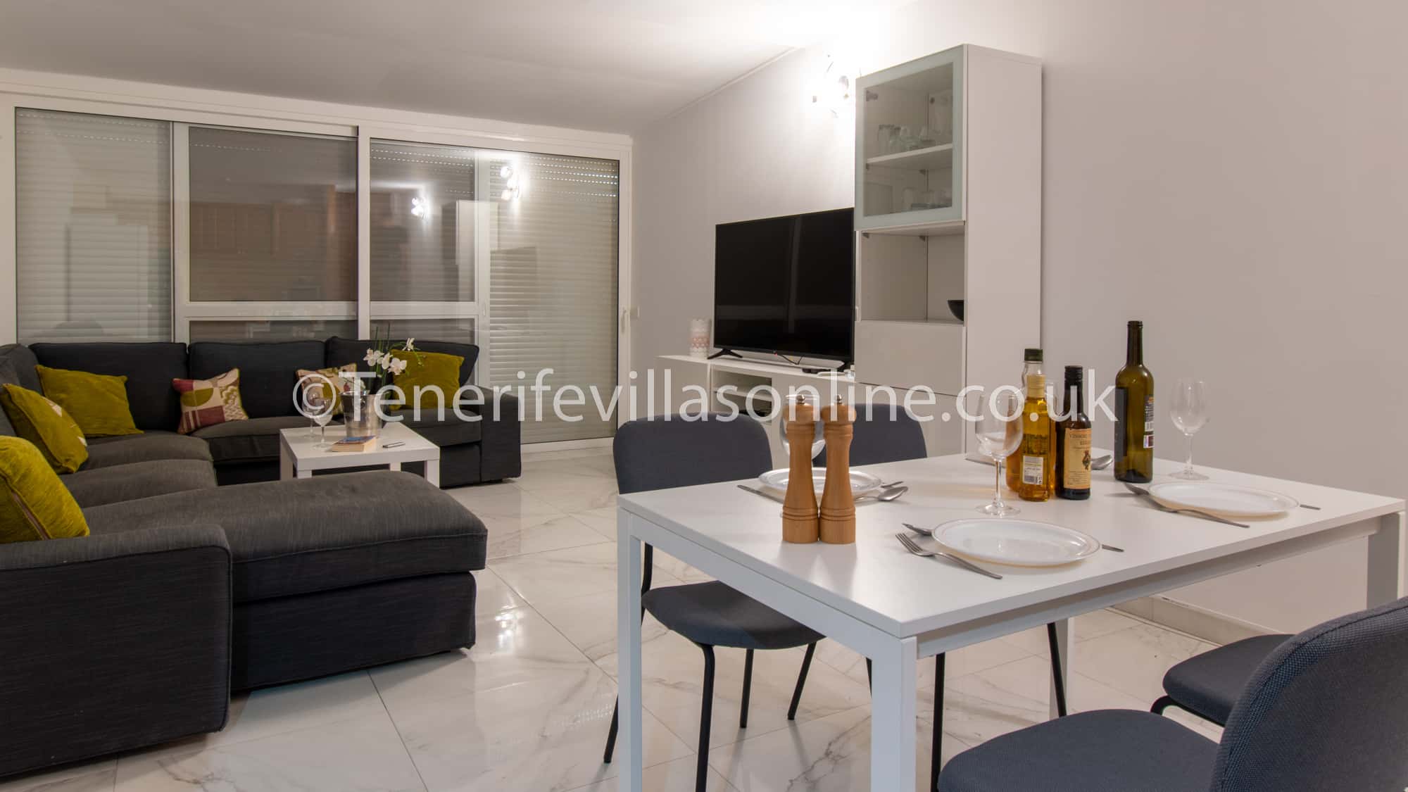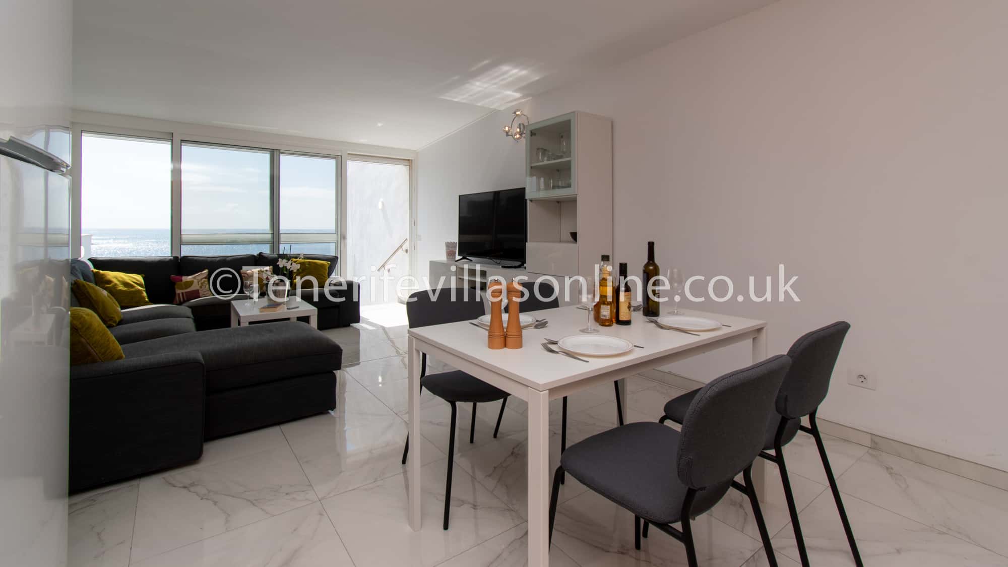 Lounge: 2 x 2 seater sofa, table and chairs for 4, flat screen TV, offers all UK channels including Sky movies, Sports, children TV, 6 live premiership football channels, over 2000 films, box sets & catch up, patio doors to balcony