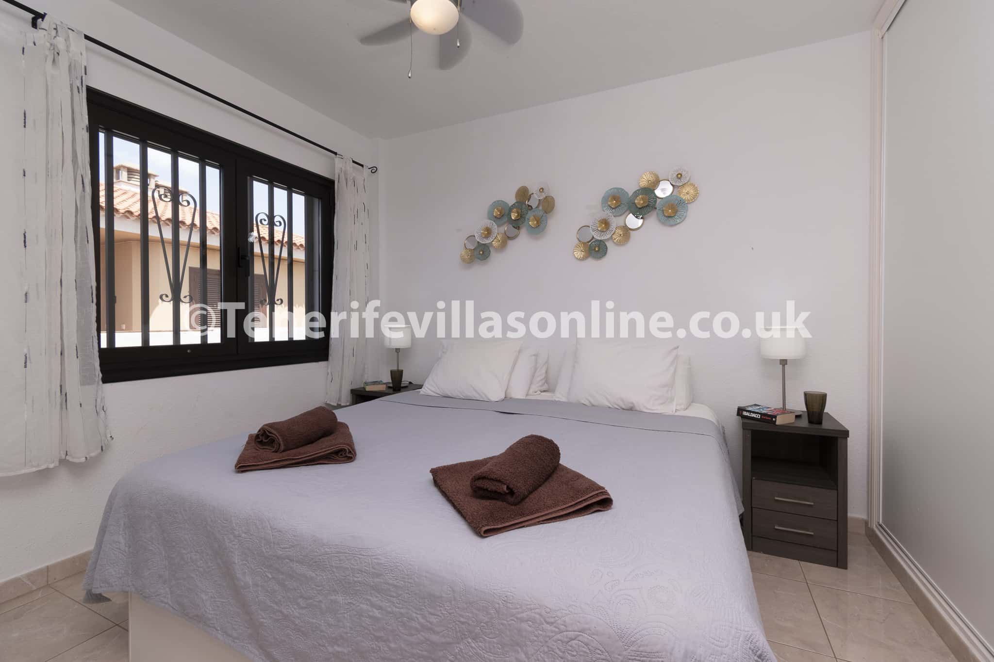 Bedroom 1: single beds (x2), fitted wardrobes, ceiling fan