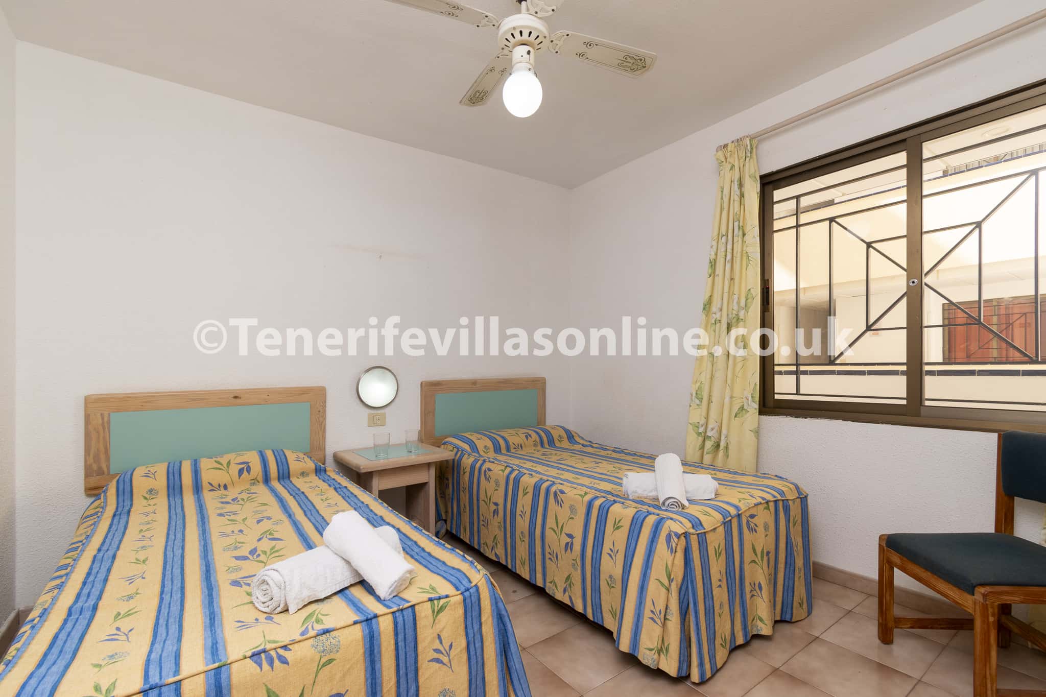 Bedroom 2: single bed (x2), fitted wardrobes, ceiling fan