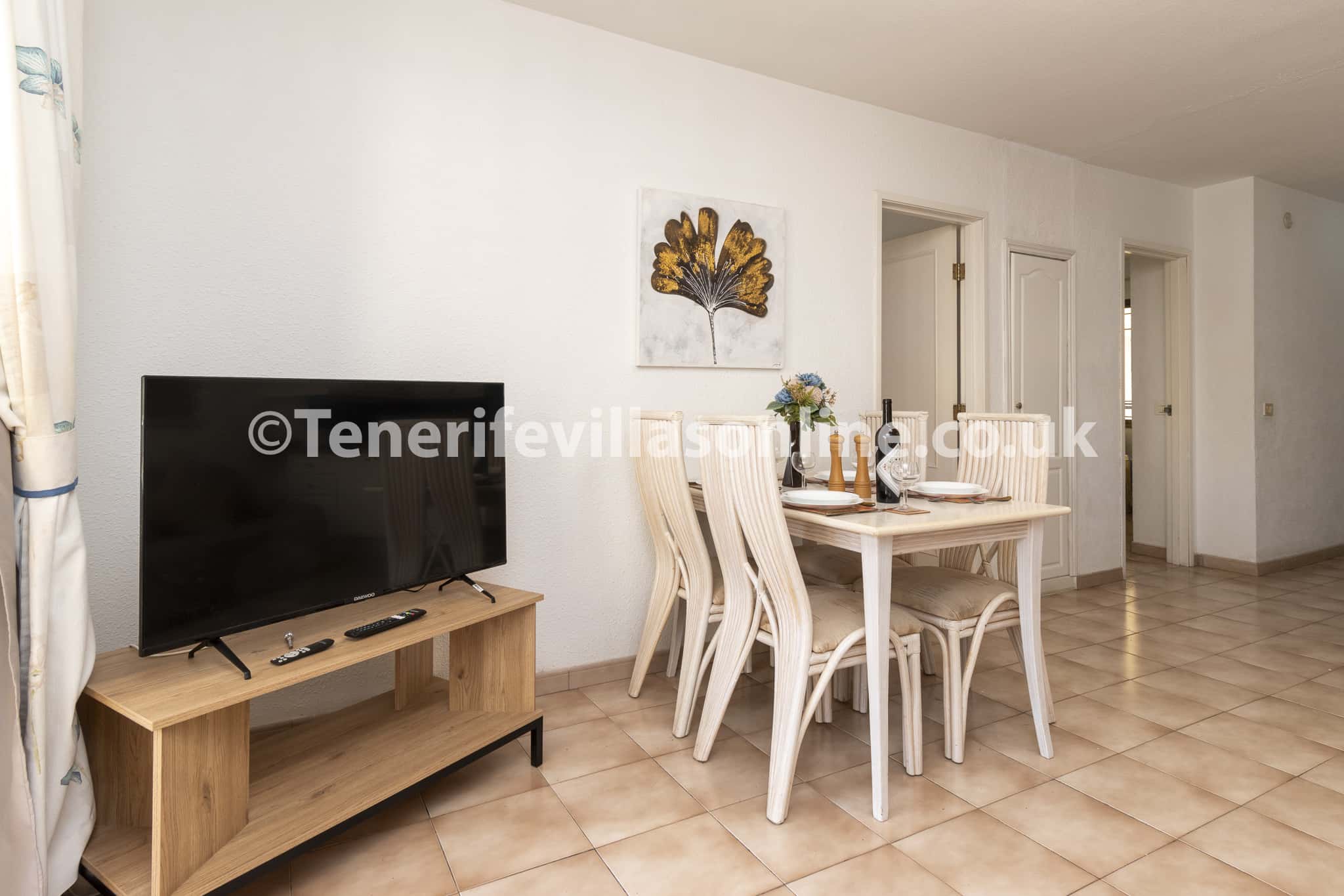 Living area: 3 seater sofa, table and chairs for 4, 48 inch flat screen TV, ceiling fan, patio doors to shared balcony