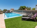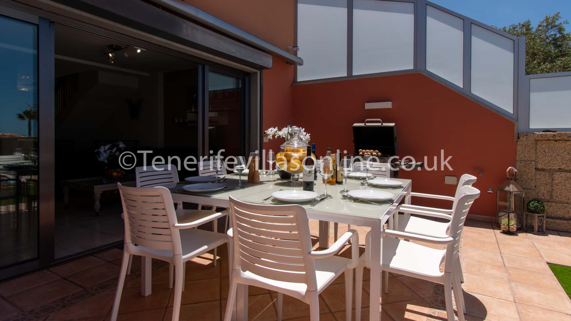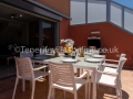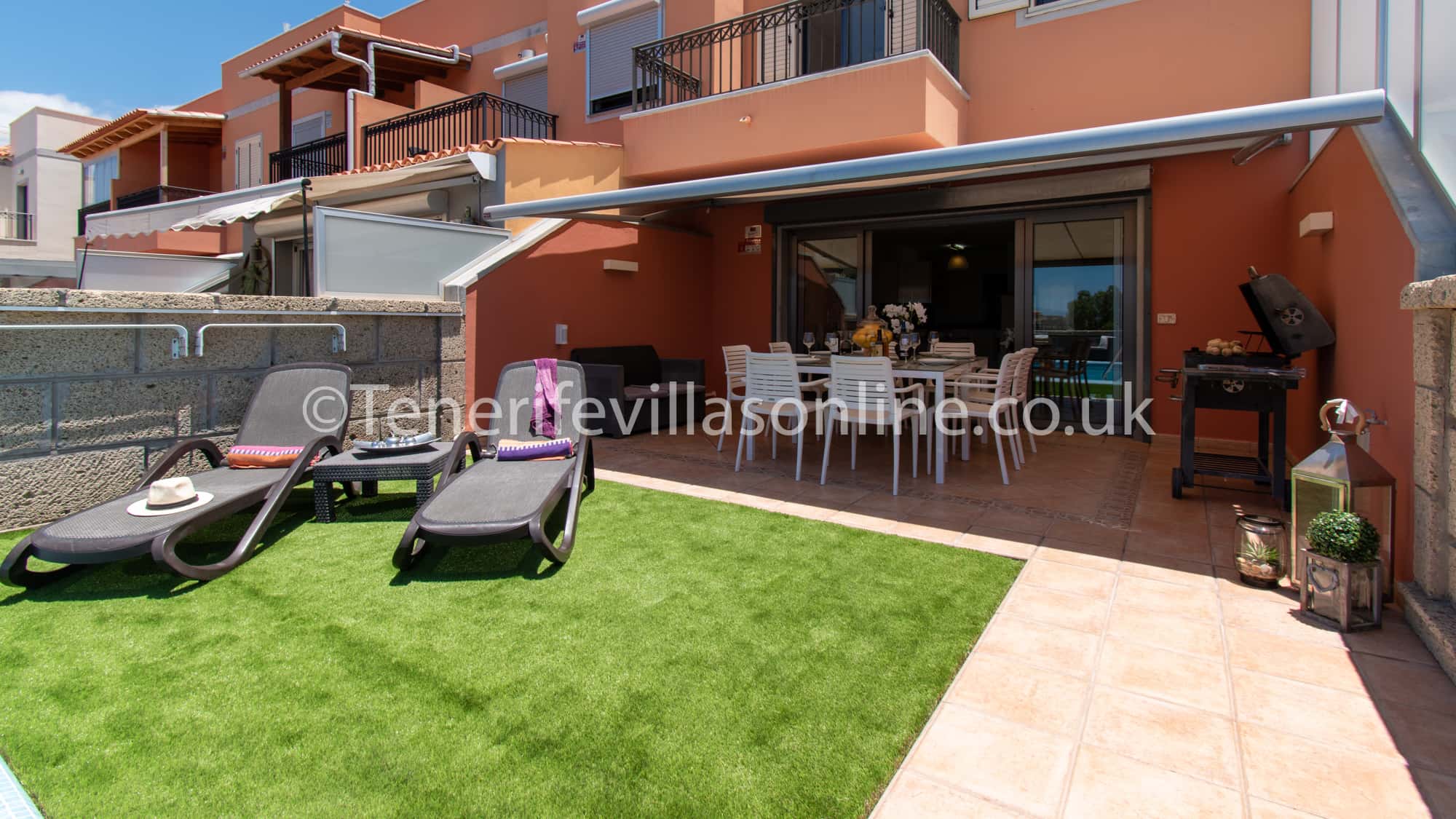 Exterior: artificial grass, dining table for 8, shaded pergola, BBQ, parasol, sun loungers, comfortable seating area