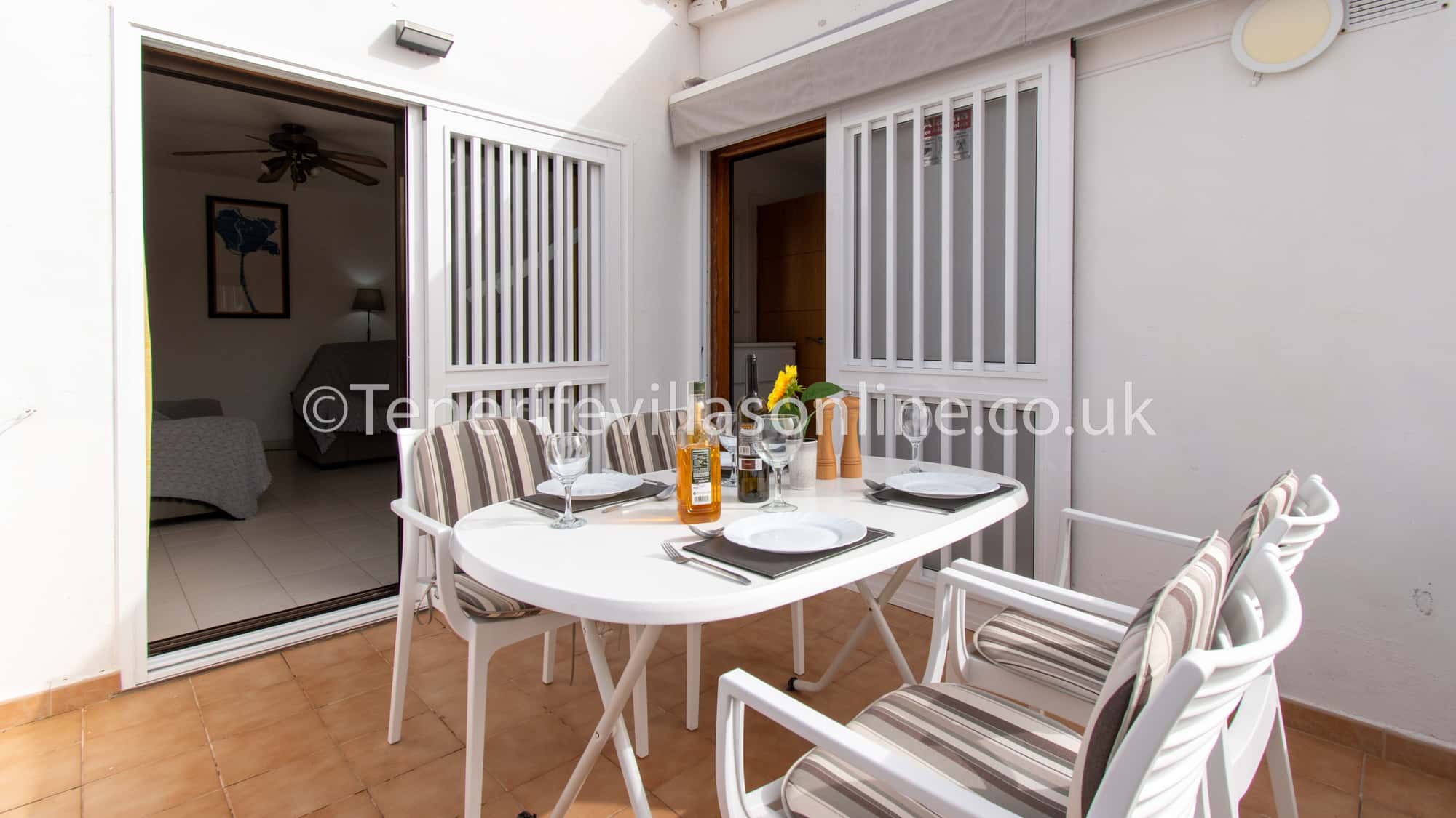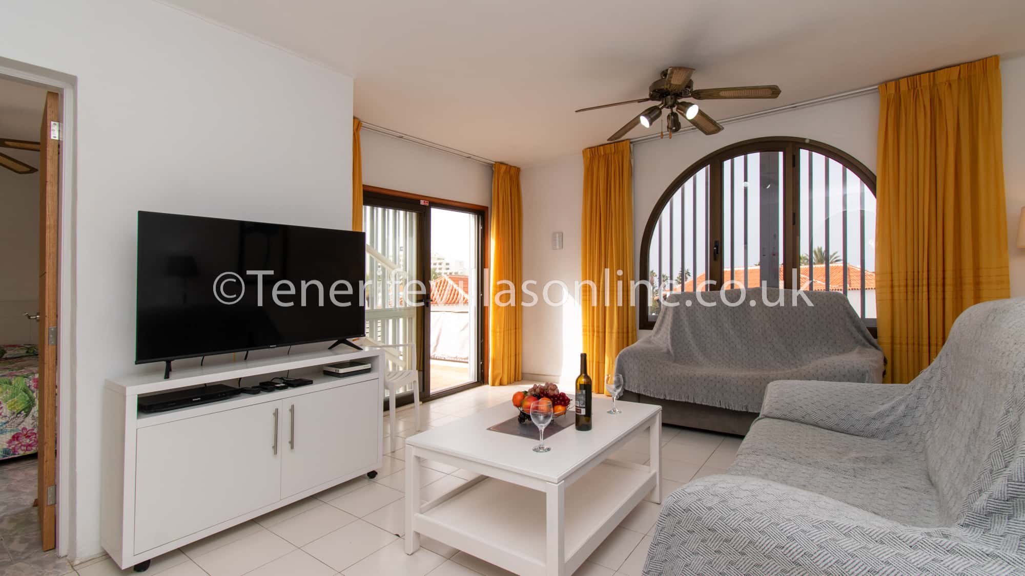 Lounge: 2 seater + 3 seater sofa, ceiling fan, flat screen TV, offers all UK channels including movies, Sports, children’s TV, live premiership football channels, films etc. Patio doors to balcony