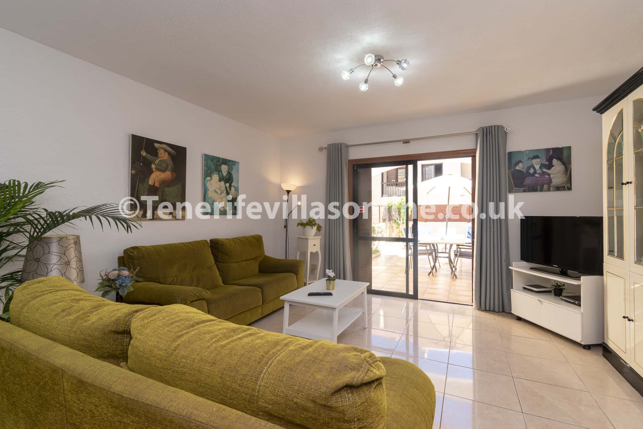 Lounge: 3 seater sofa, 2 seater sofa 42 inch flat screen TV, ceiling fan, patio door to terrace