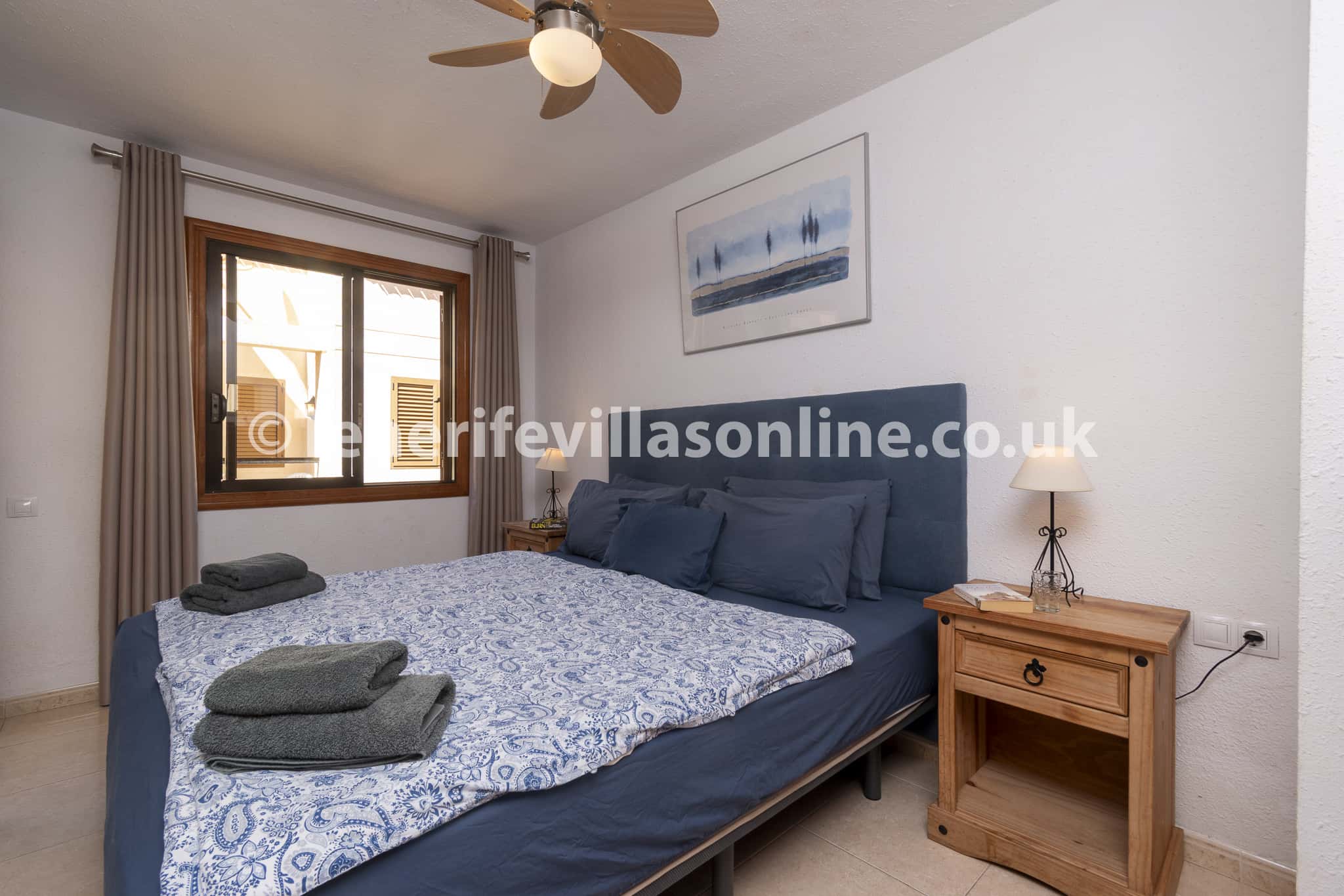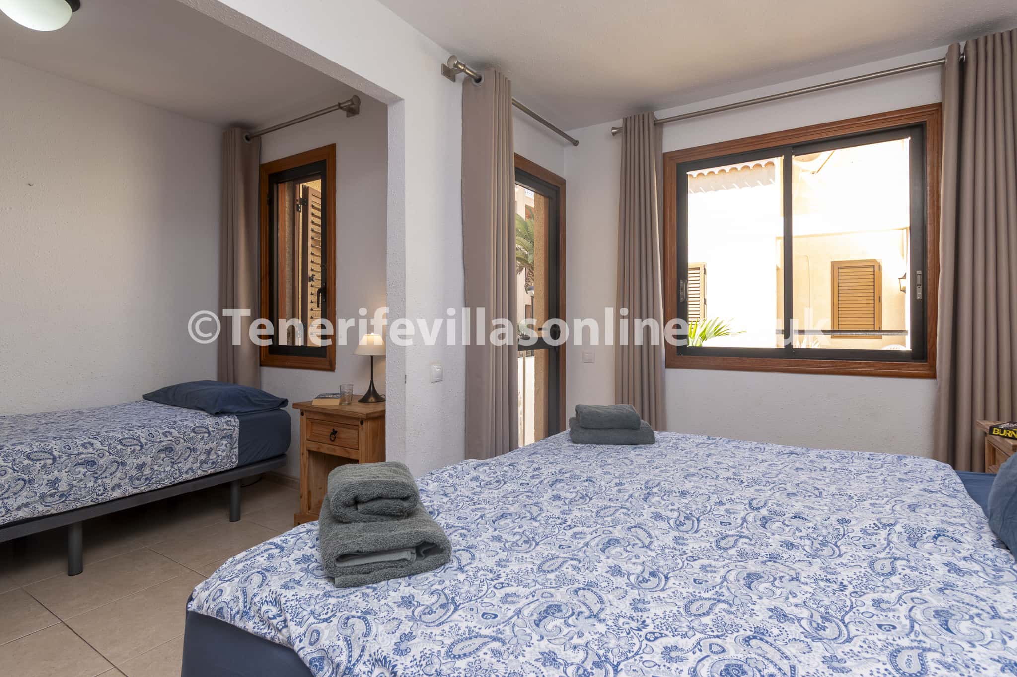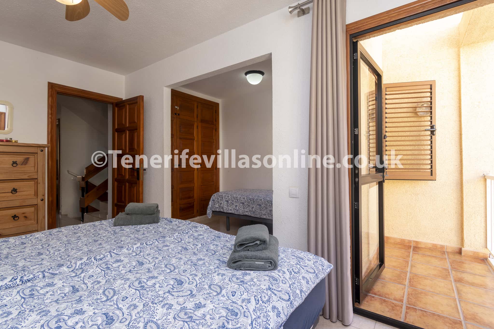 Bedroom 3: king size bed, single bed, fitted wardrobes, ceiling fan, patio doors to balcony