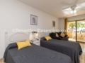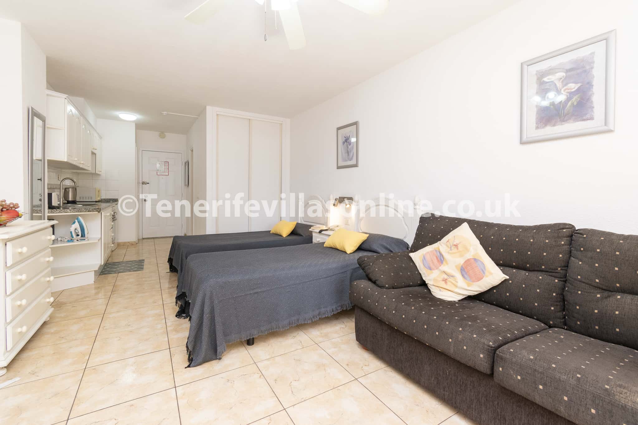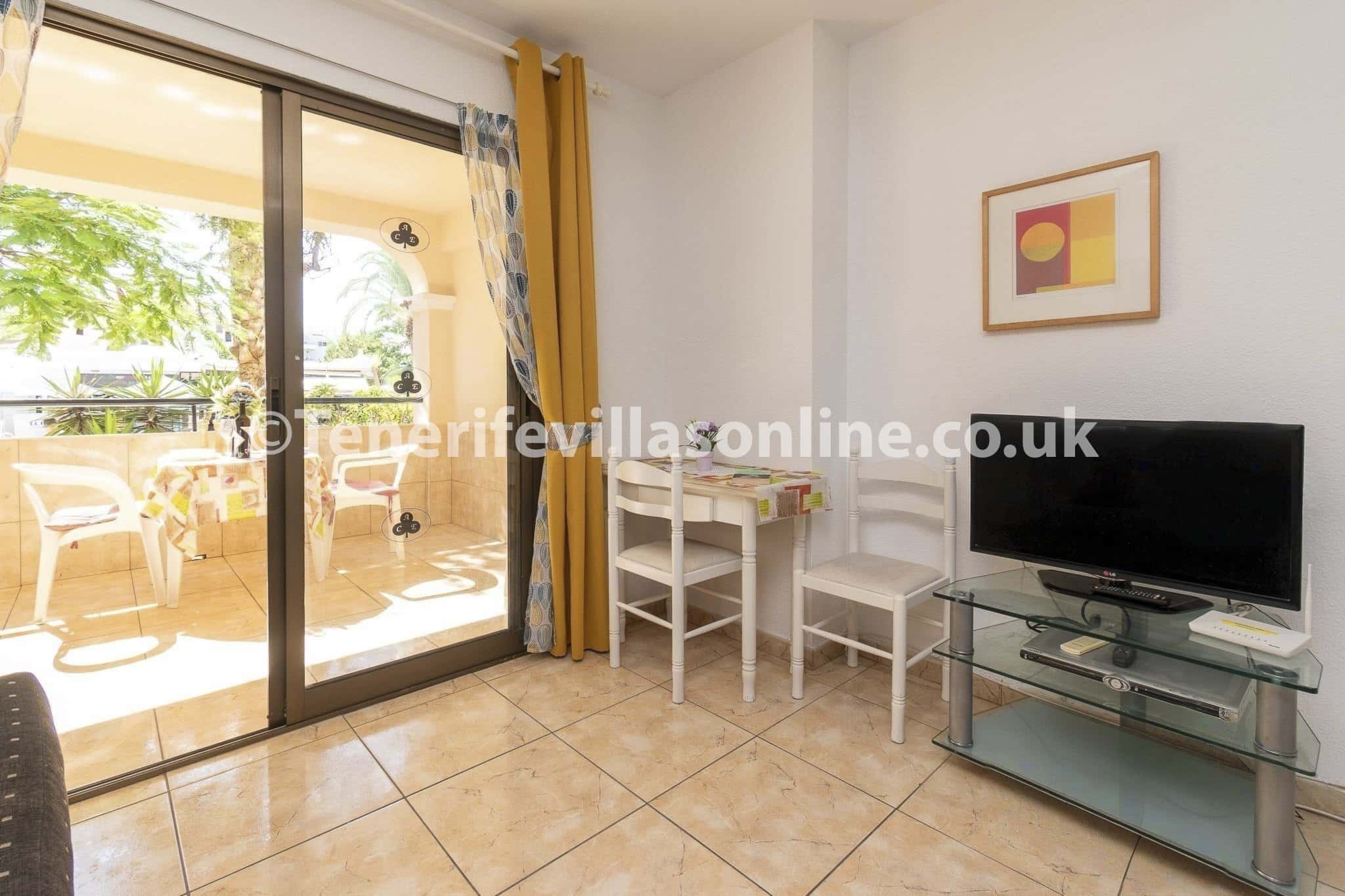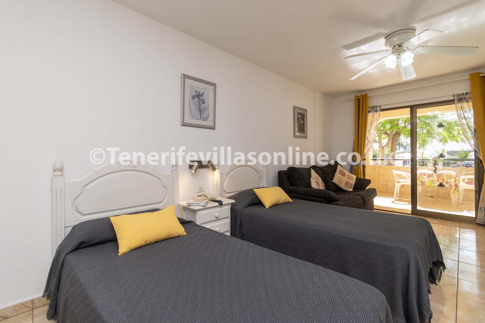 Living area: 2 seater sofa, flat screen TV, patio doors to balcony, table and chairs for 2, single beds (x2), fitted wardrobes, ceiling fan, free standing fan