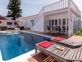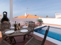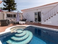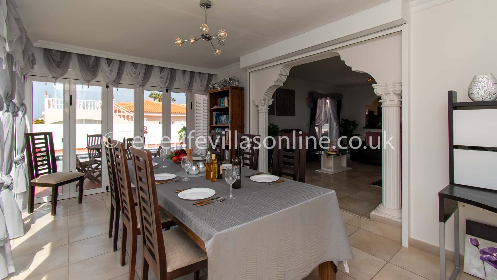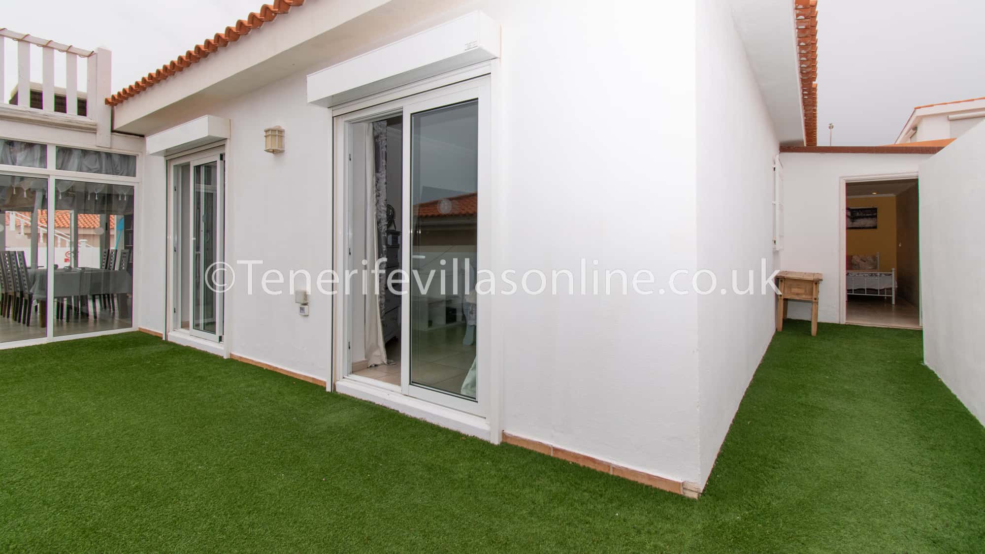 As you enter the interior you are greeted into the spacious living area/kitchen/diner! The kitchen is fully equipped, the living area holds sofas and a large flat screen TV equipped with a fire stick, providing guests with plenty of entertainment. The dining area is similar to a conservatory with seating for up to 8 guests and includes patio doors leading to the terrace. Inside the main villa are 3 bedrooms which are normal size, the 4th bedroom is small and positioned in a separate building with separate entrance, which is accessed via an artificial grass pathway at the side of the terrace. The 4th bedroom is recommended for those that want that extra bit of privacy. All bathrooms are located inside the main villa.