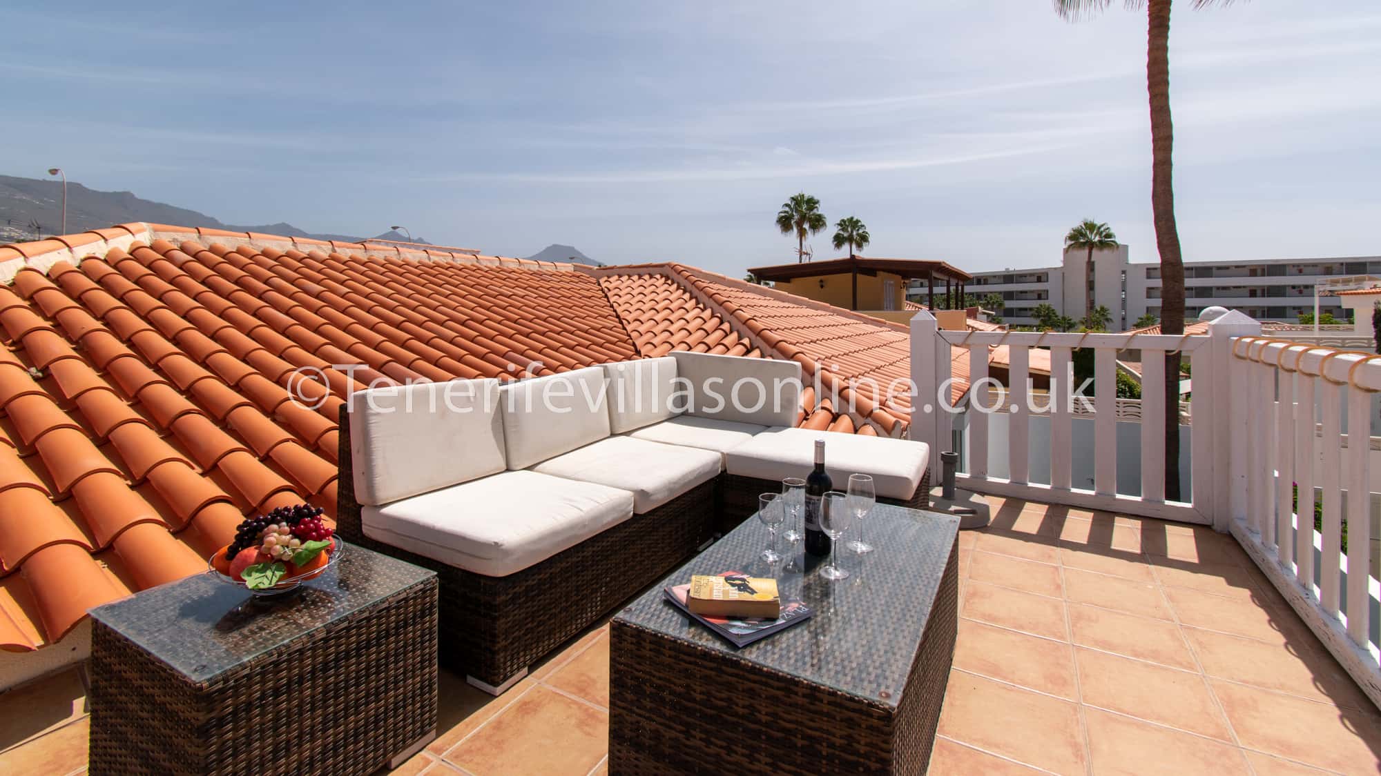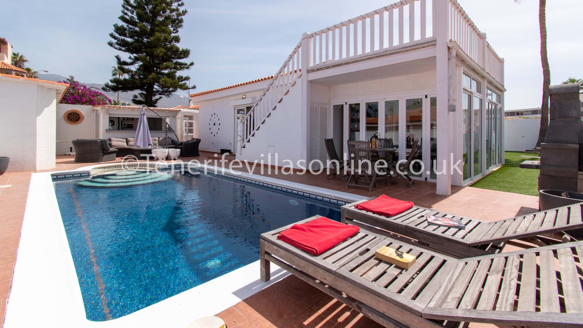 Enjoy a complimentary stay at this beautiful villa in Callao Salvaje, Tenerife. Situated in a central location only 200 meters from all amenities. Some of the main highlights of this property are 4 bedrooms (bedroom 4 is small and located in a separate building), 2 bathrooms, roof terrace with sea views and pool terrace with private heated pool and adjacent bar area with fridge! This villa offers comfort, ... Read More >>