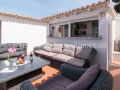 Exterior: artificial grass, dining table, comfortable outdoor seating area, parasol, shower, BBQ, sun loungers, bar area with fridge, sink, roof terrace with furniture