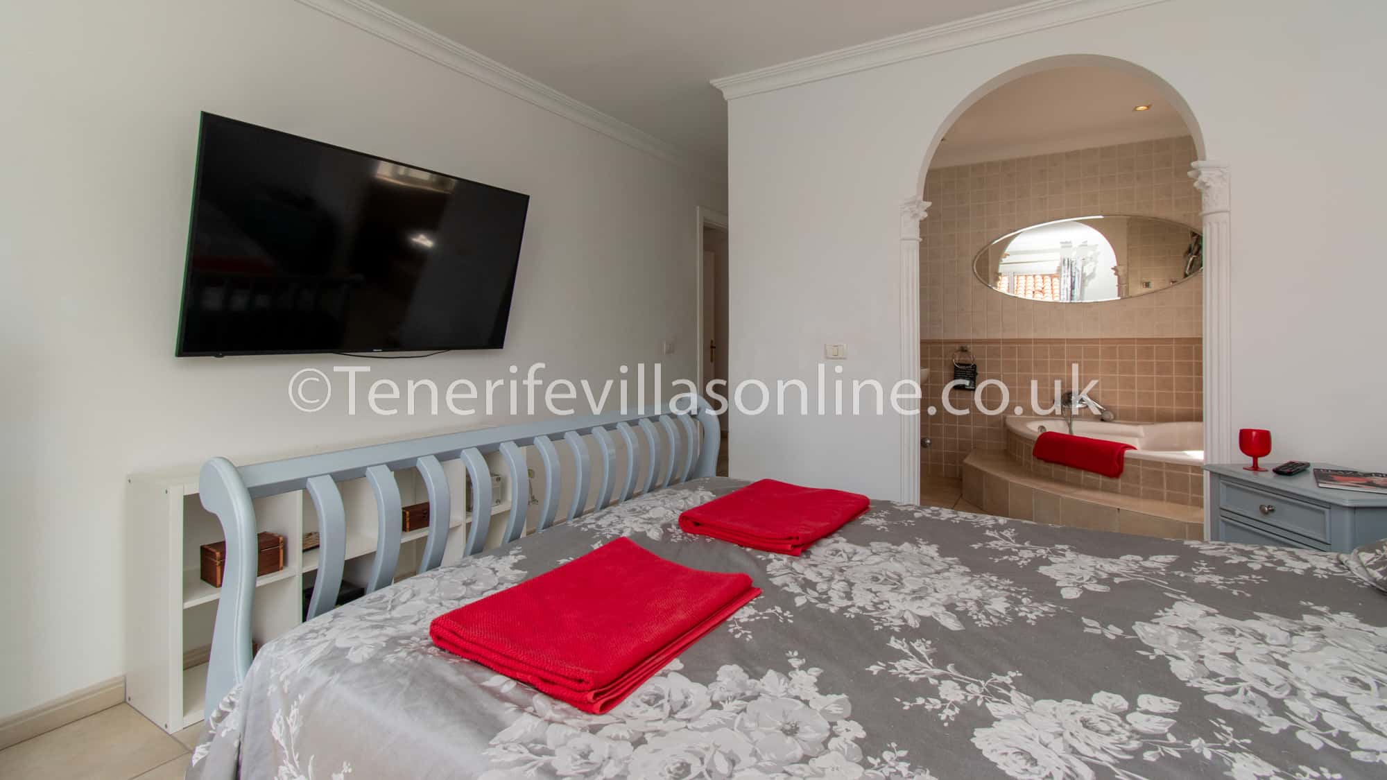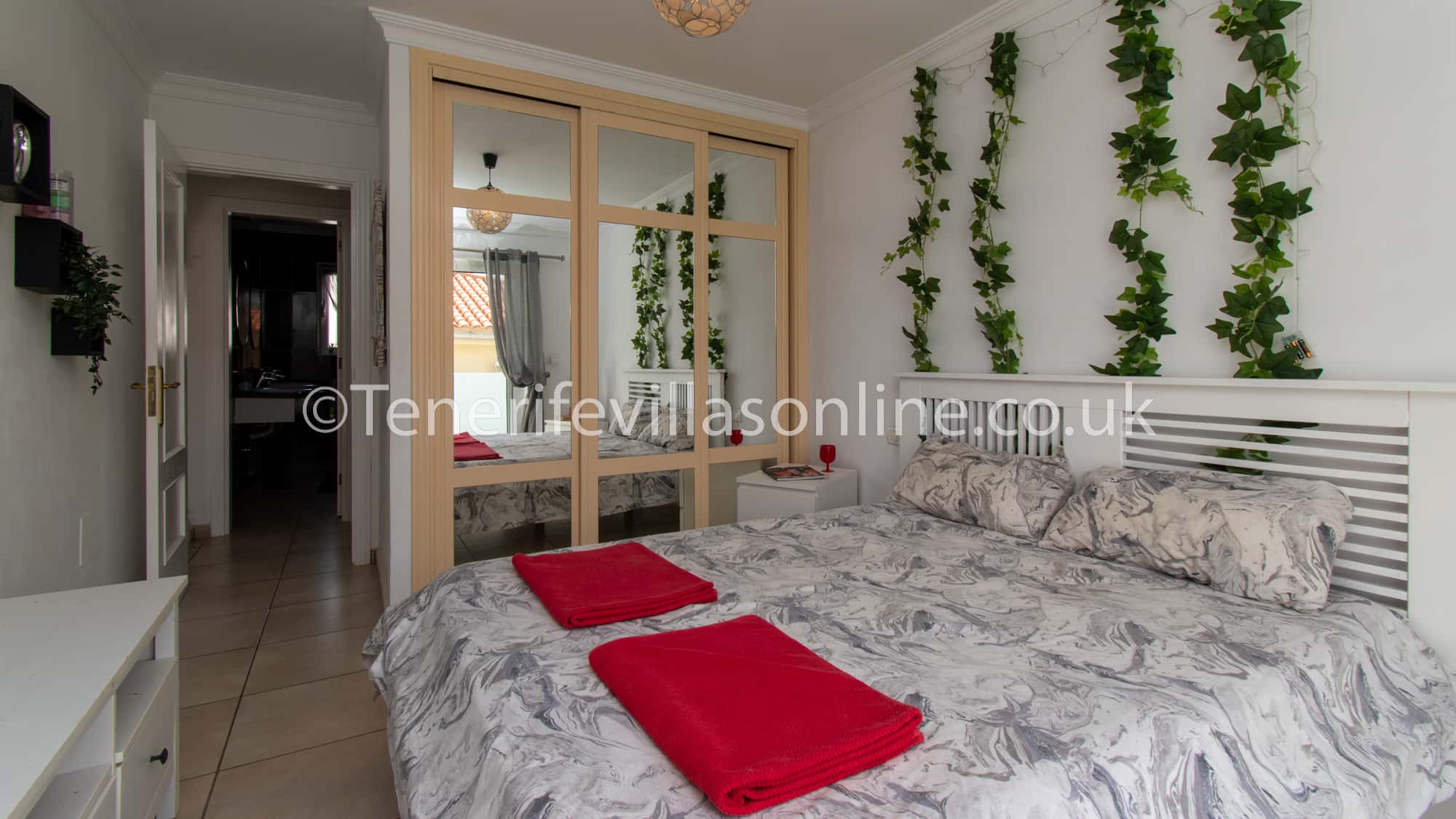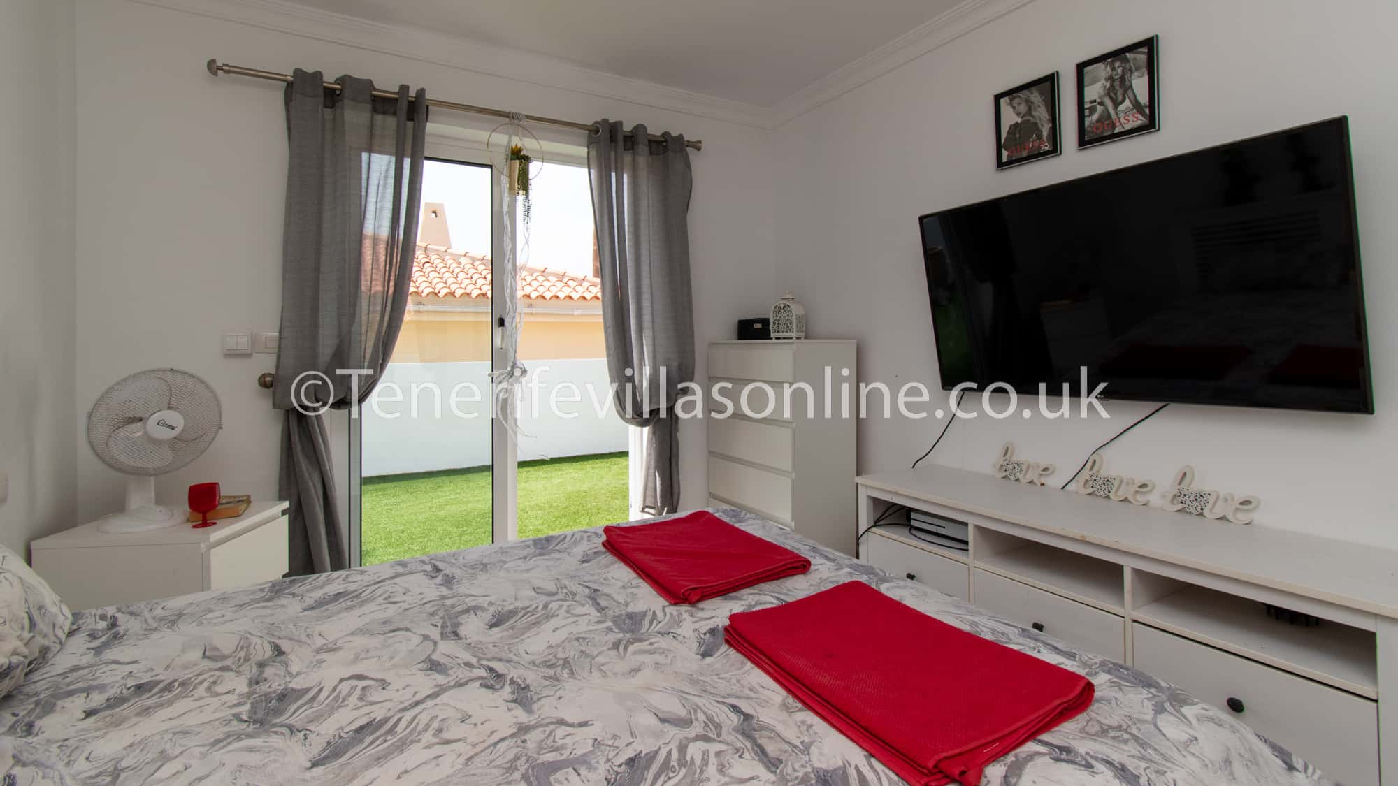 Bedroom 2: king size bed, fitted wardrobes, fan, flat screen TV, fan, patio doors to terrace