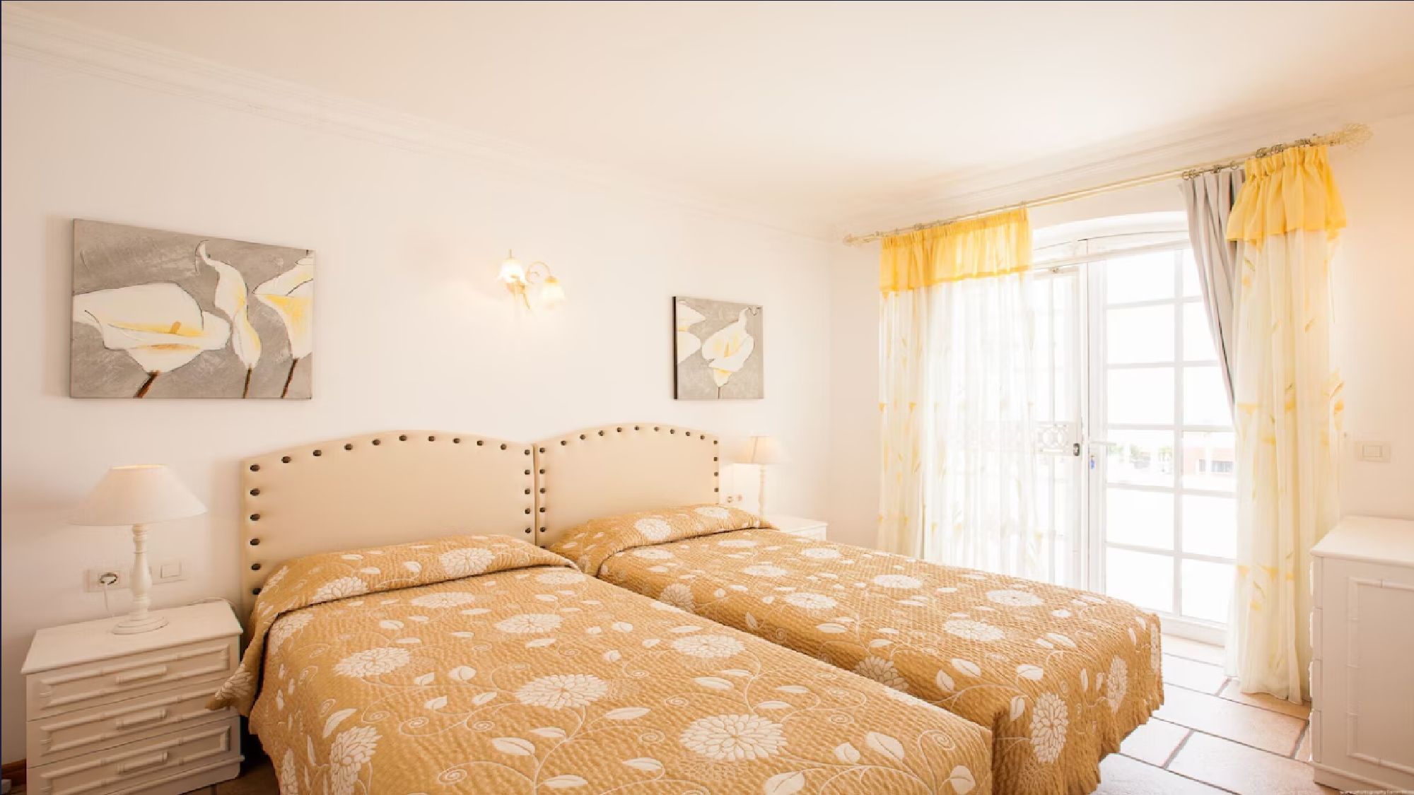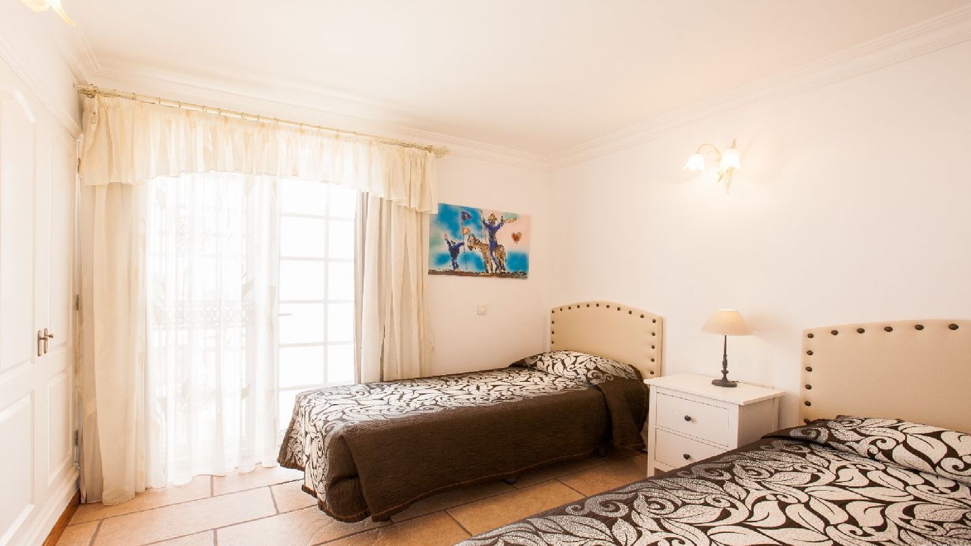 Bedroom 3: single beds (x2), fitted wardrobes, patio doors to balcony, table and chairs