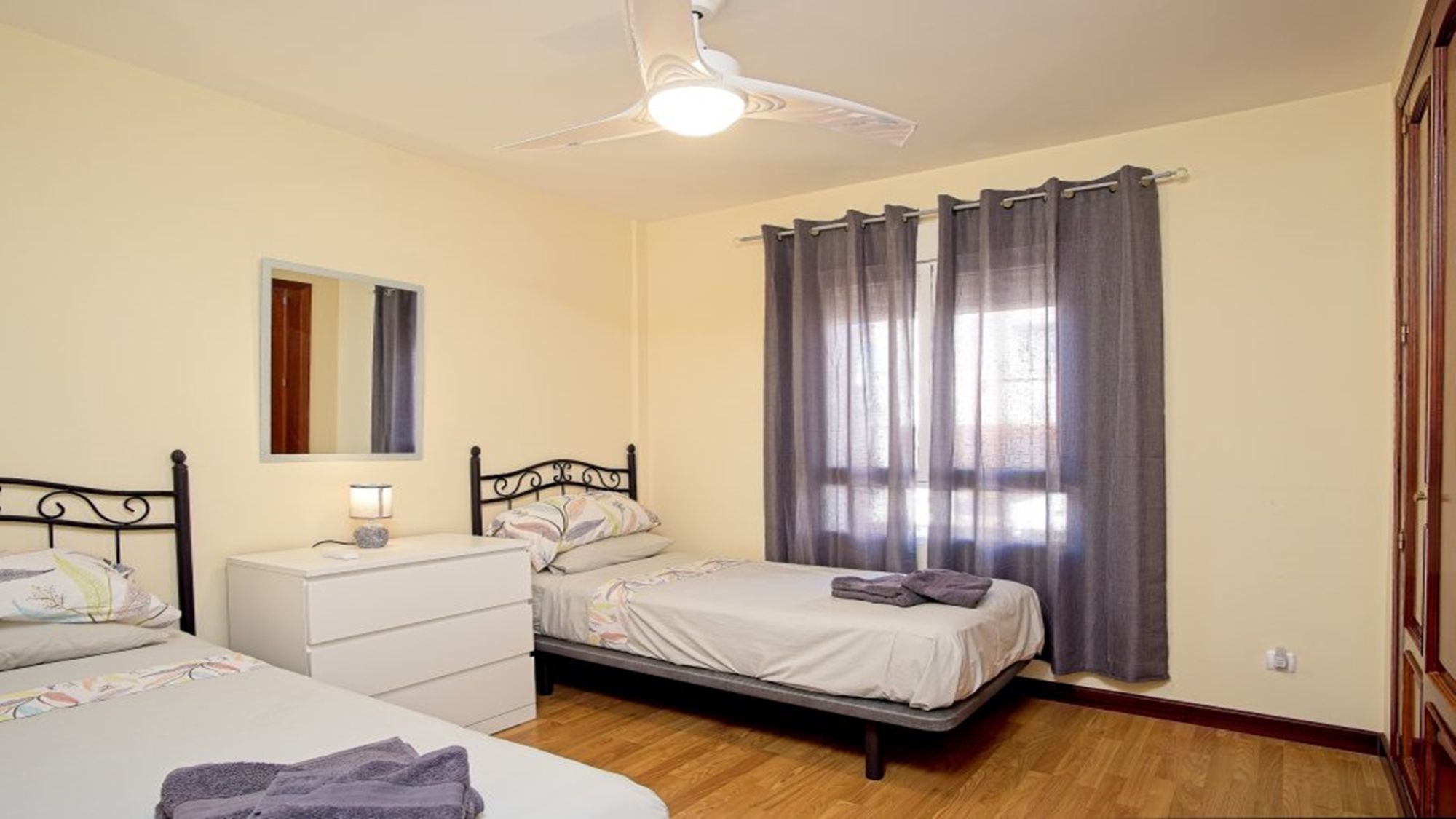 Bedroom 3: single bed (x2), ceiling fan