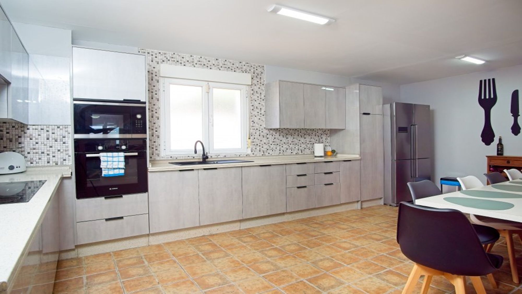 Kitchen/ diner: oven/hob, fridge/freezer, kettle, microwave, toaster, table and chairs for 6