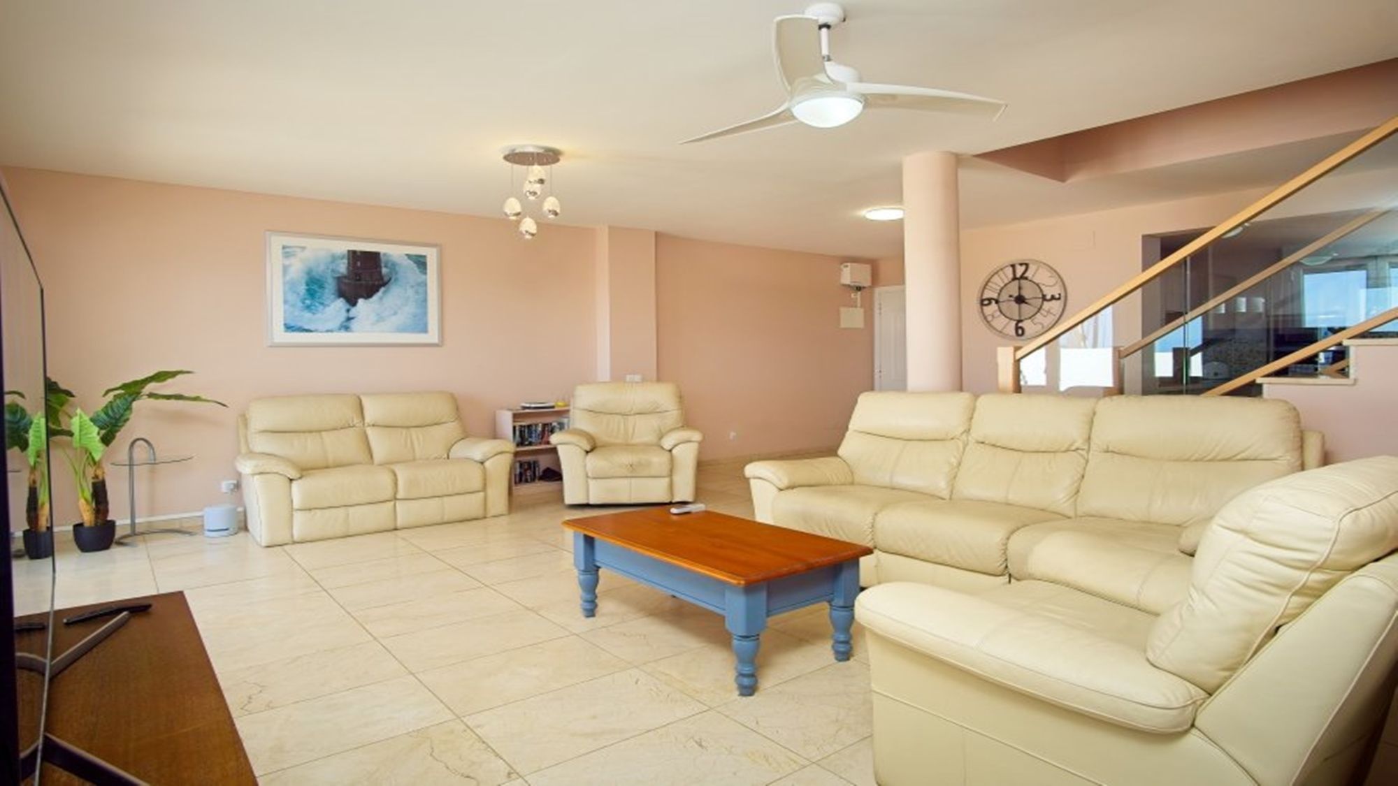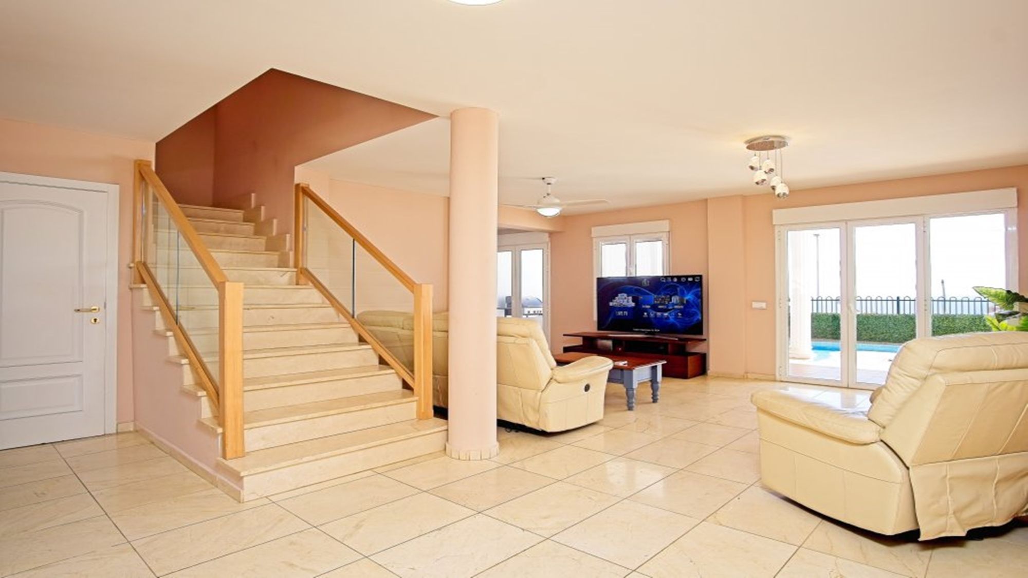 Lounge: 3 seater sofa, 2 seater sofa, armchairs x2, 36 inch flat screen TV, patio doors to terrace, ceiling fan