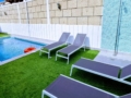 Exterior: sun loungers, jacuzzi, outdoor dining table, comfortable outdoor seating area, shaded pergola, outdoor shower, artificial grass on terrace