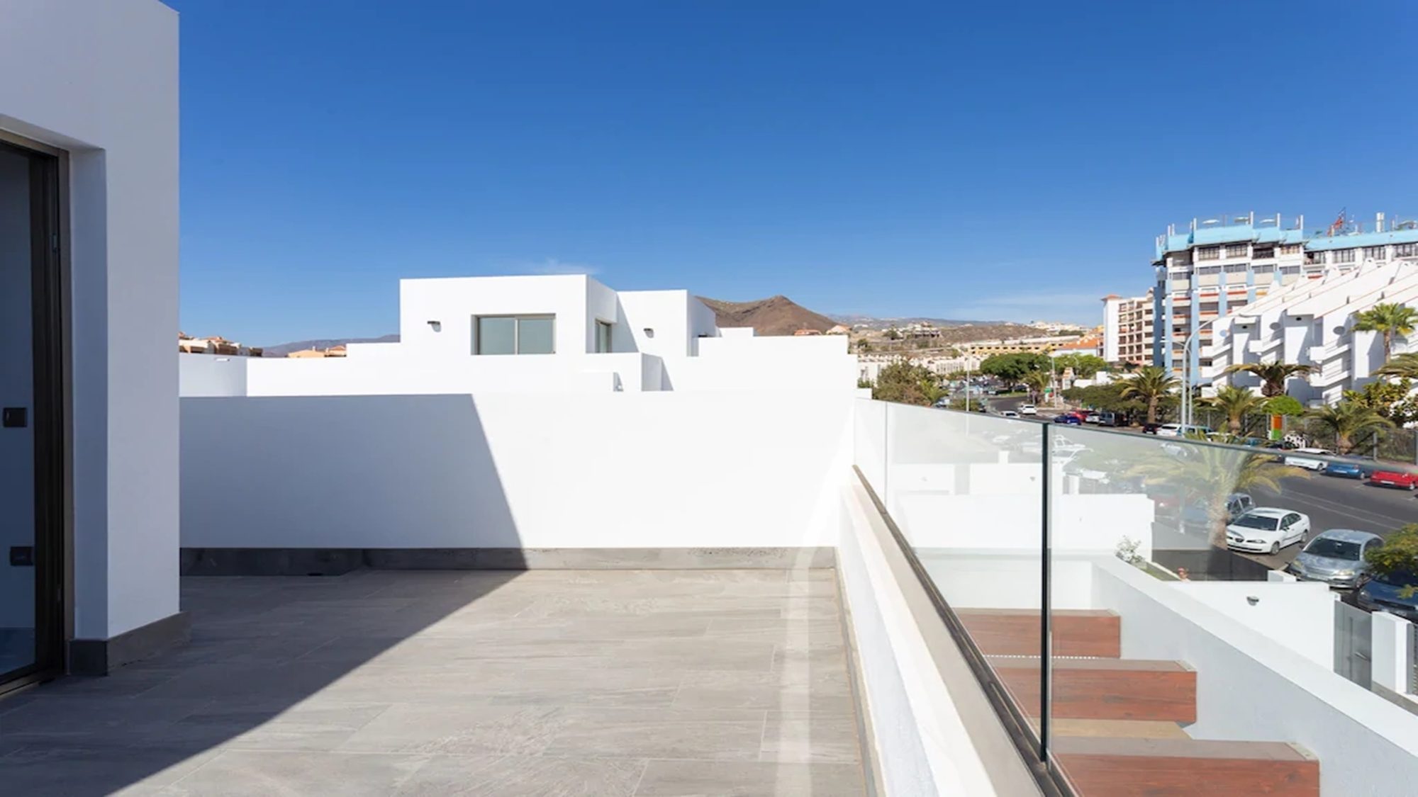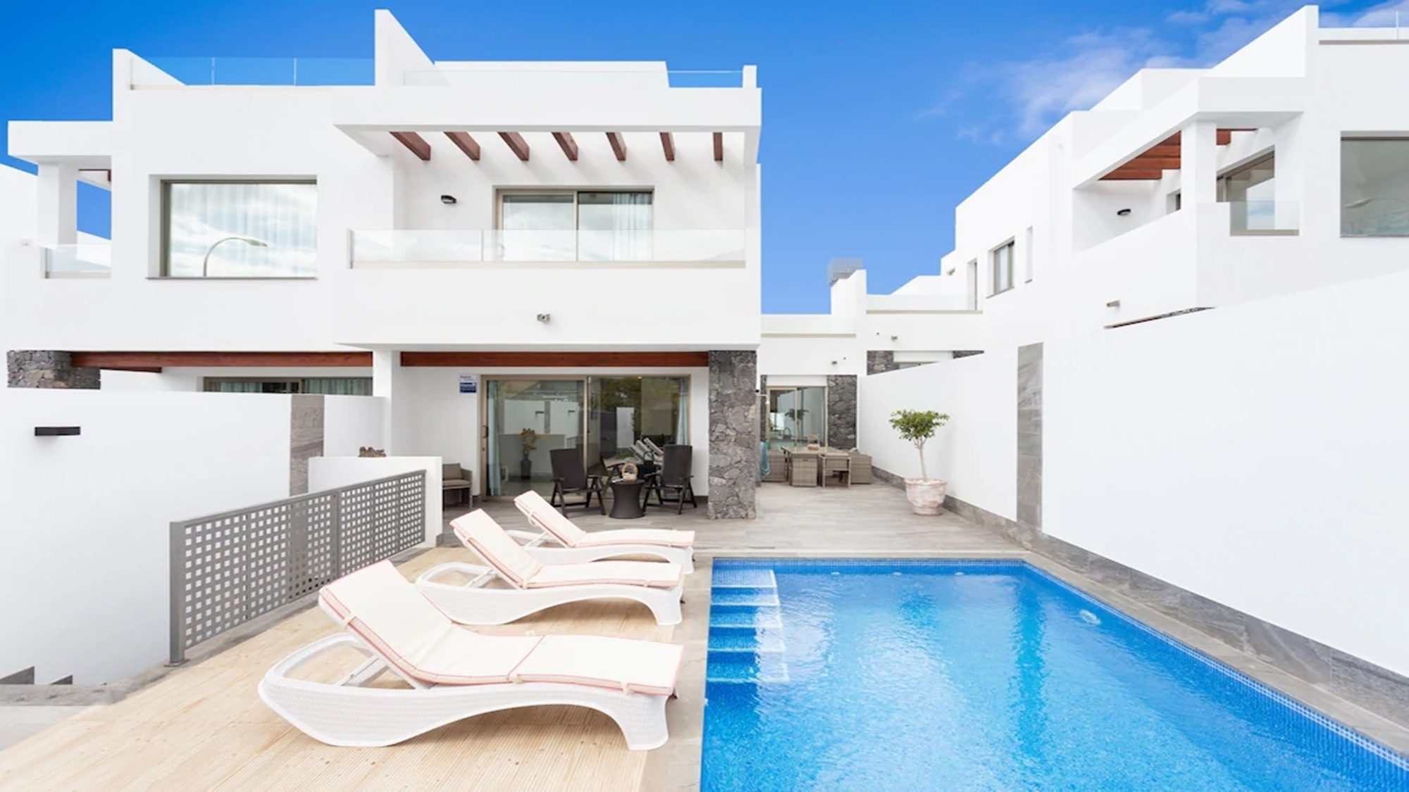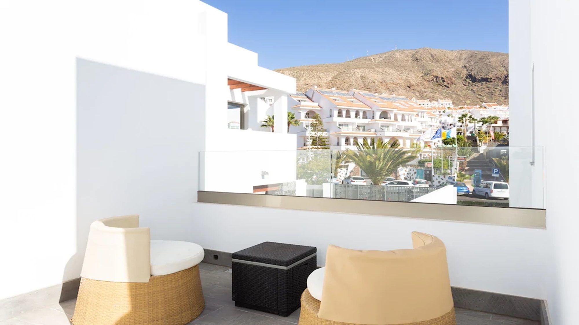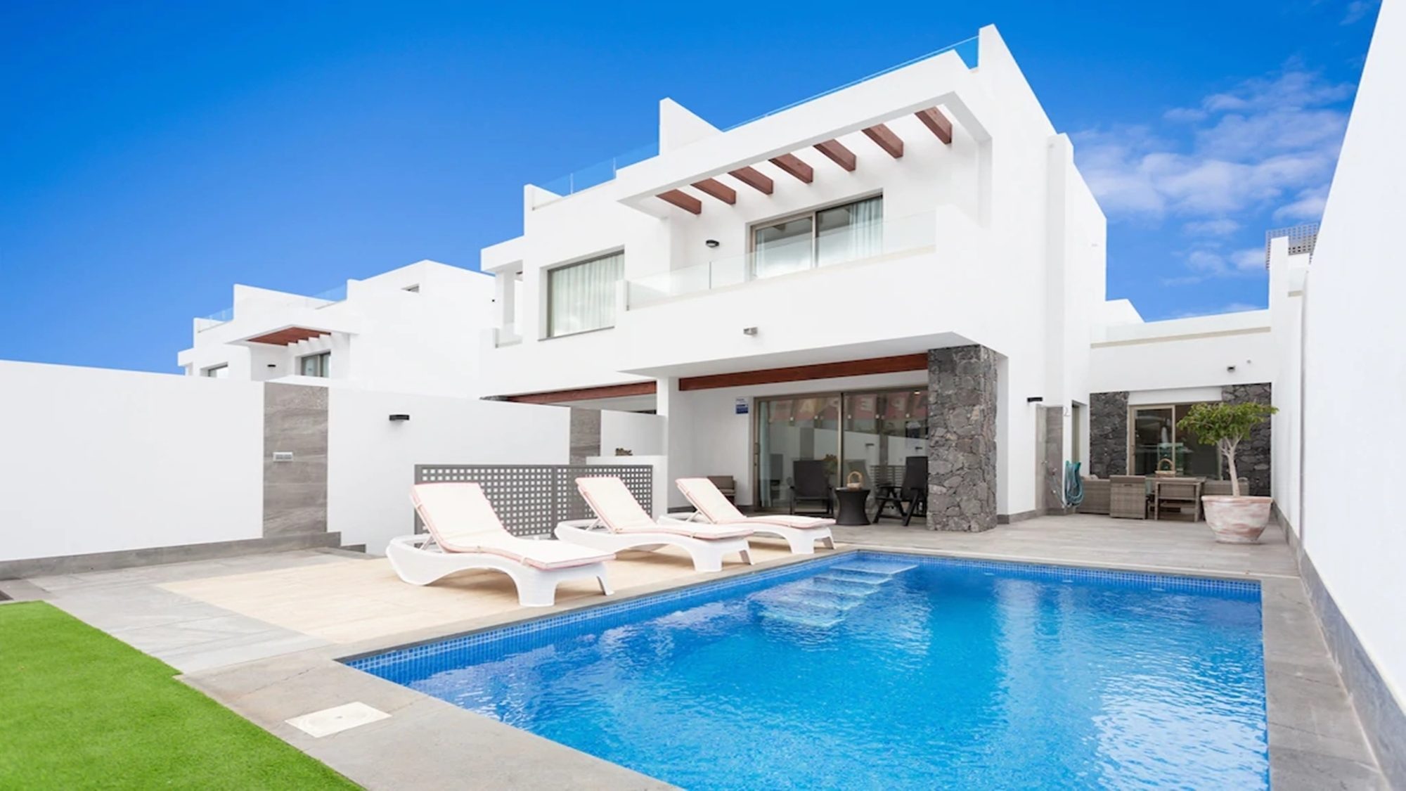 Outdoors, the terrace is fitted with artificial grass, includes a private heated pool and sun loungers where you can kick off your shoes, lay back in comfort and top up your tan! Dining outside is also made possible with a dining table under a shaded pergola. Experience the best that Tenerife has to offer when staying in this modern villa.