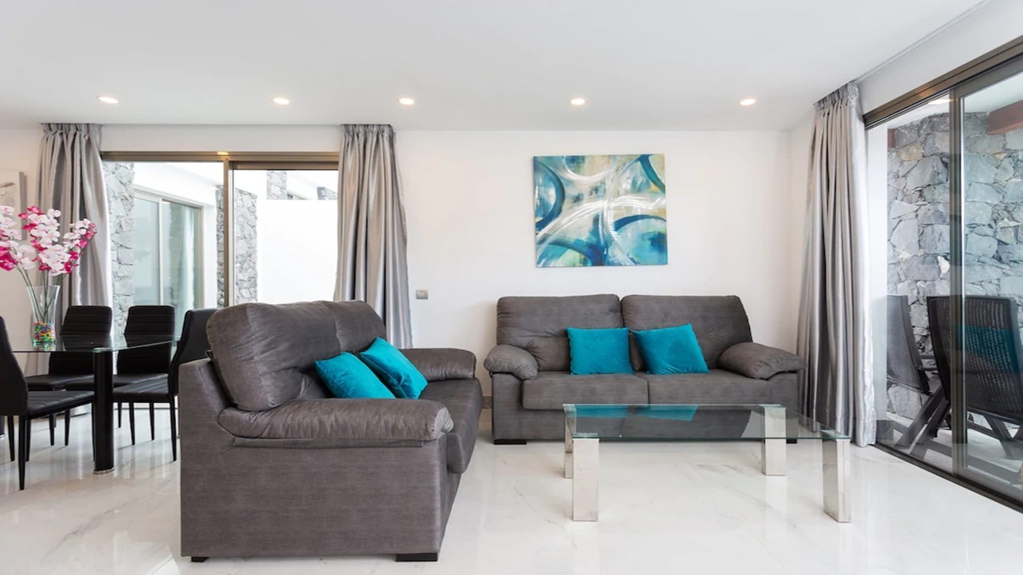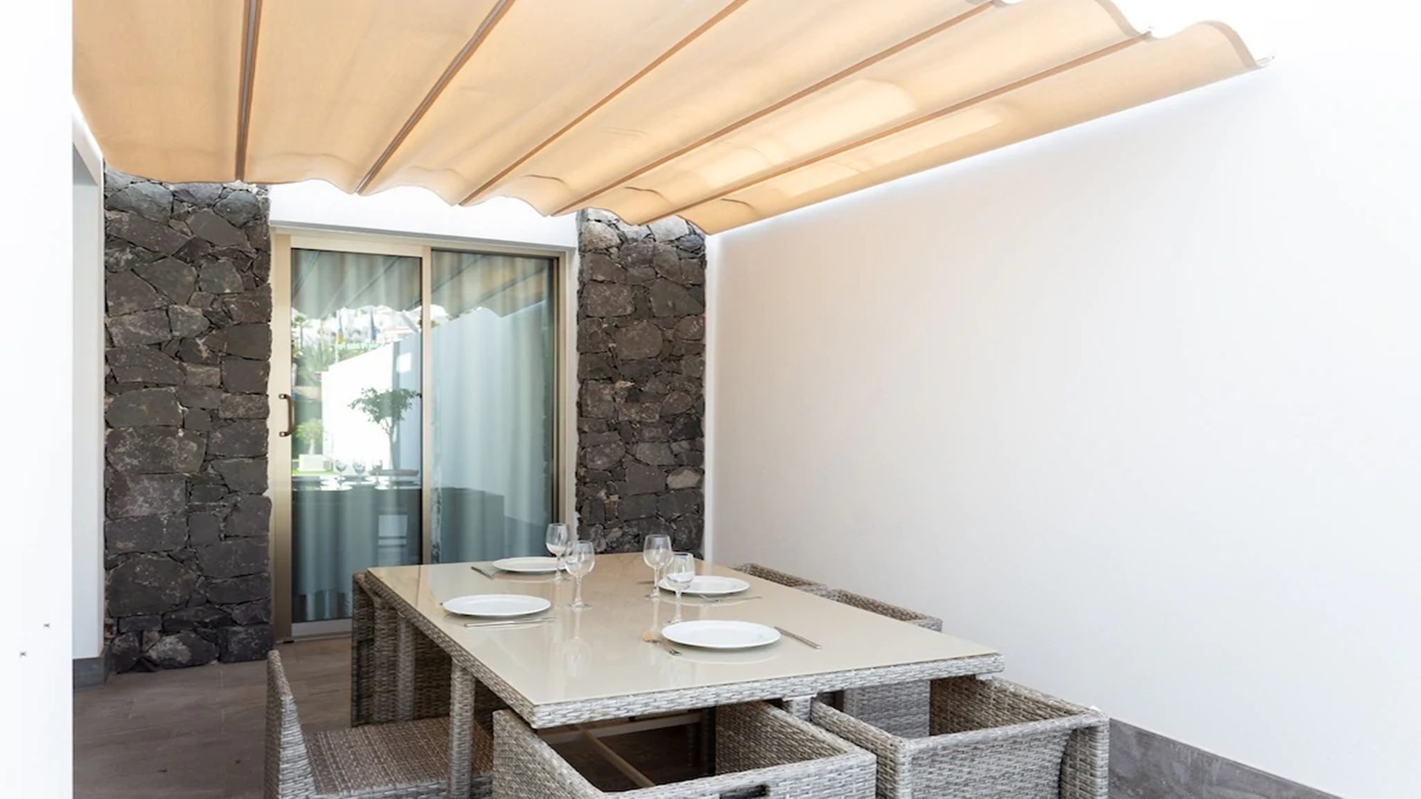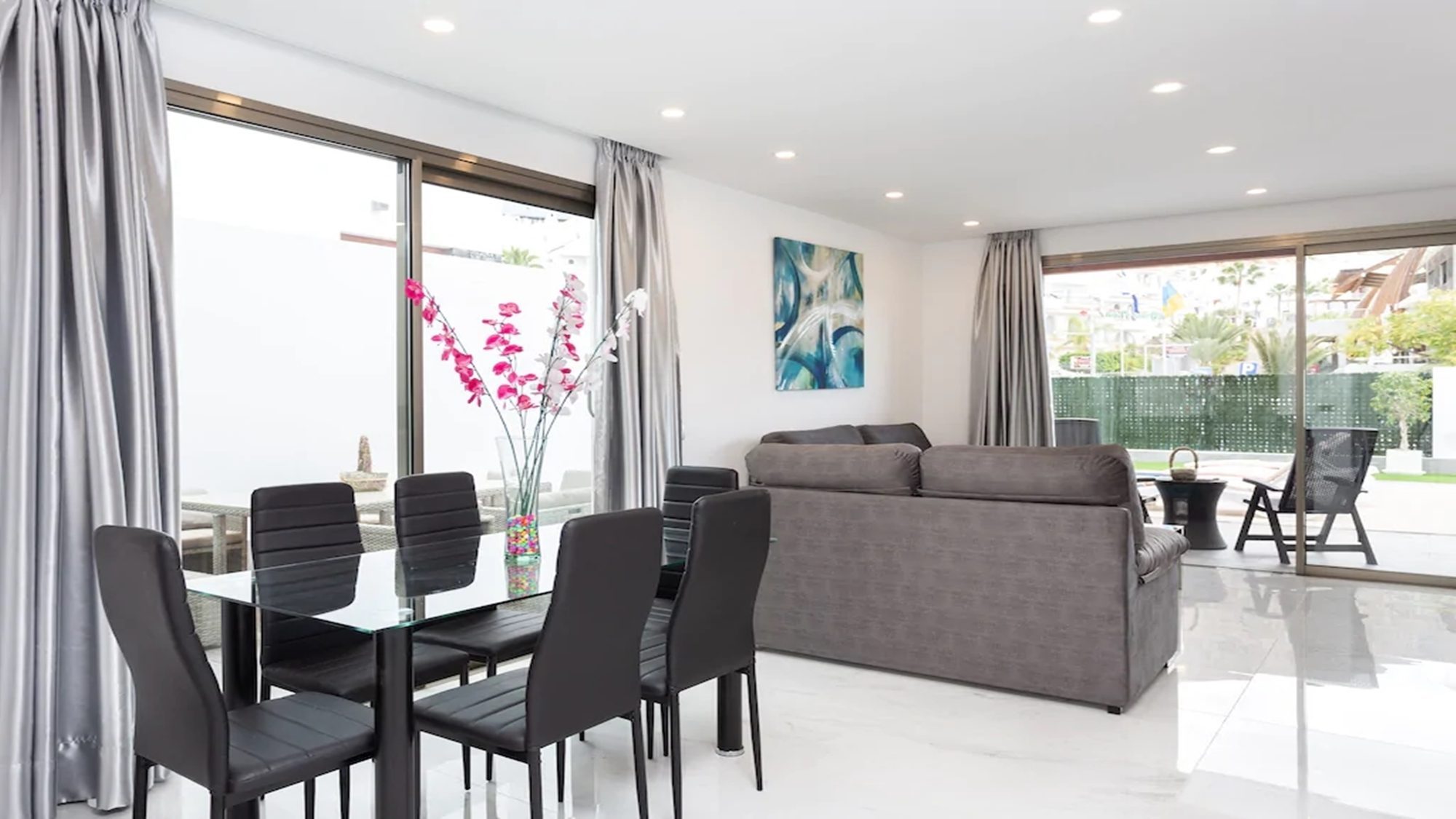 Outdoors, the terrace is fitted with artificial grass, includes a private heated pool and sun loungers where you can kick off your shoes, lay back in comfort and top up your tan! Dining outside is also made possible with a dining table under a shaded pergola. Experience the best that Tenerife has to offer when staying in this modern villa.