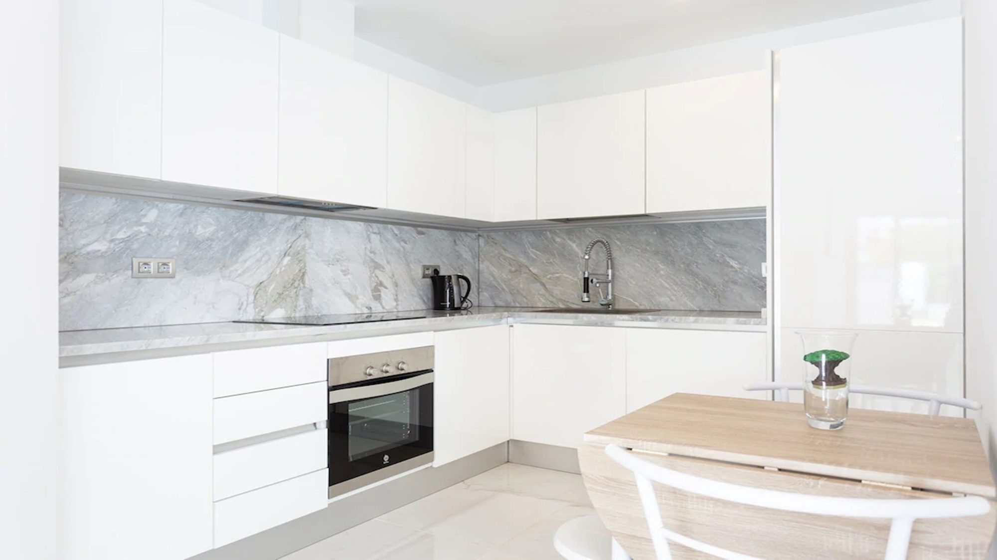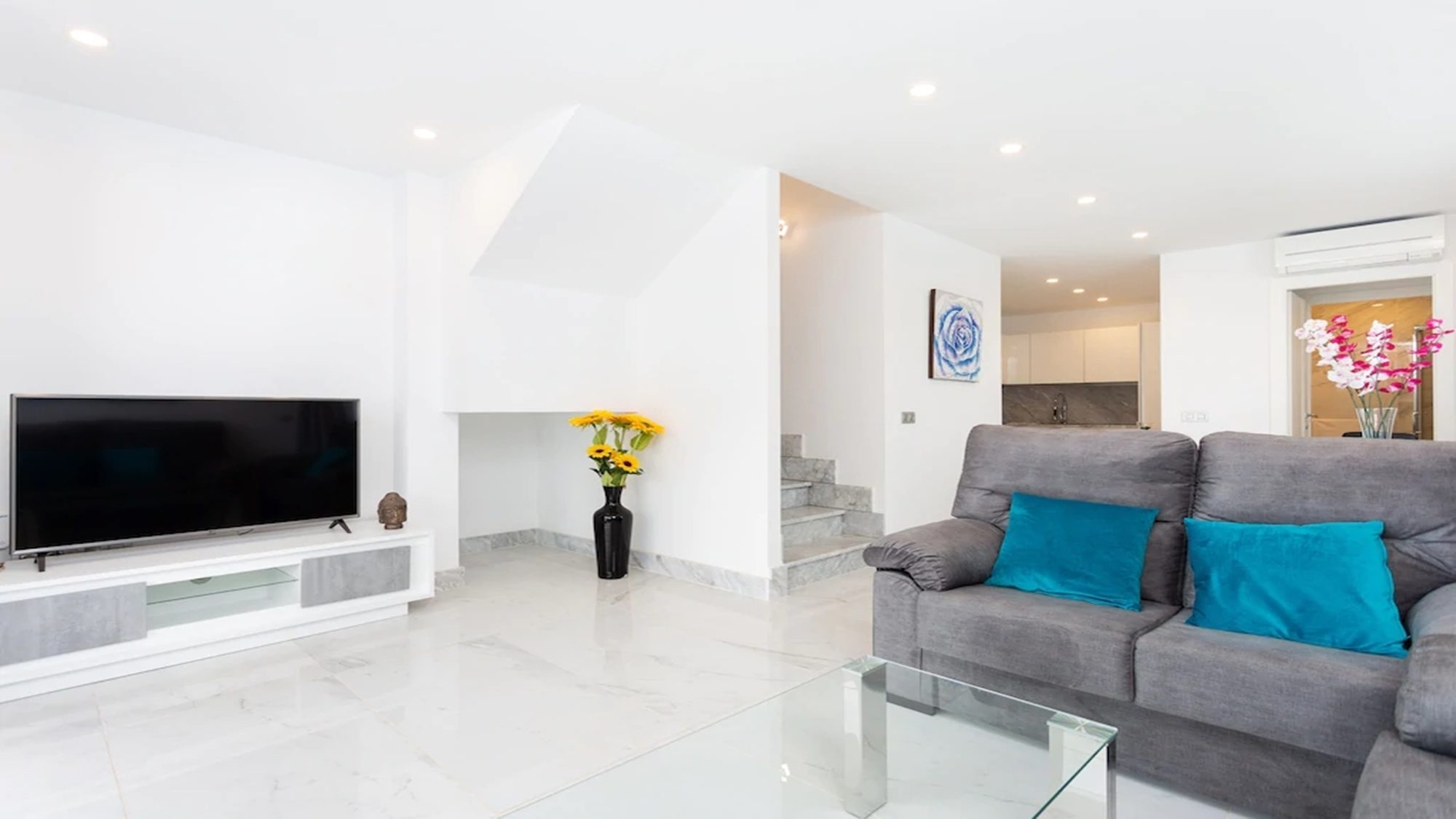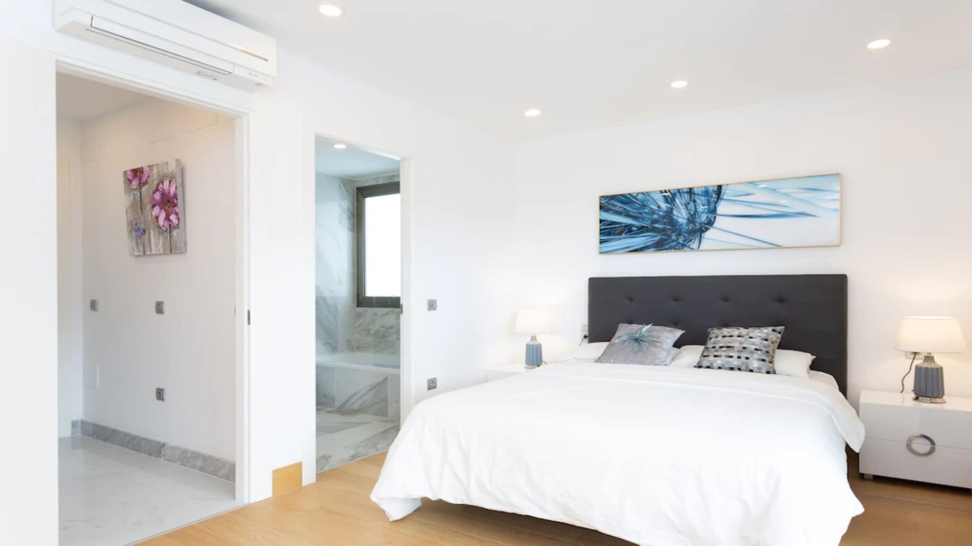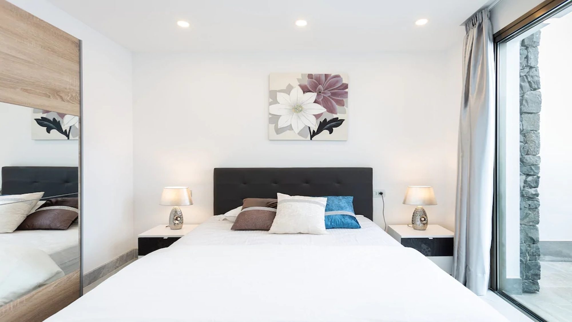 Outdoors, the terrace is fitted with artificial grass, includes a private heated pool and sun loungers where you can kick off your shoes, lay back in comfort and top up your tan! Dining outside is also made possible with a dining table under a shaded pergola. Experience the best that Tenerife has to offer when staying in this modern villa.