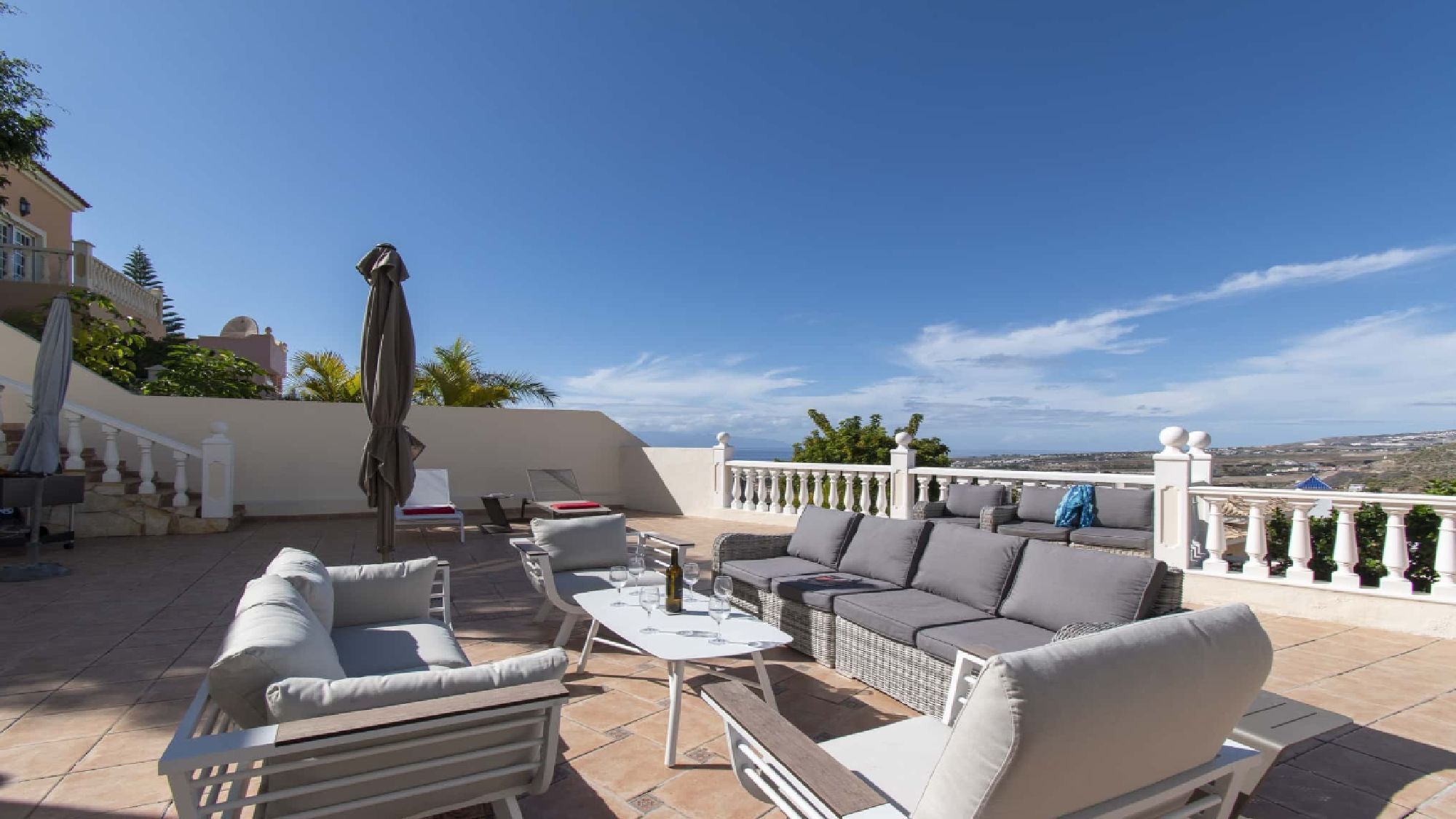 Features a private pool situated on a huge terrace with sea views. The terrace is designed for relaxation in the sun! Comfortable patio furniture including an outdoor dining table and sun loungers for soaking up the sun. For an even more spectacular perspective, a roof terrace offers the best viewpoint with panoramic views of the island and out to sea making it the perfect spot to unwind.