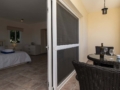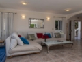 Lounge: L shaped sofa, 2 chairs, flat screen TV, fan, patio doors to terrace