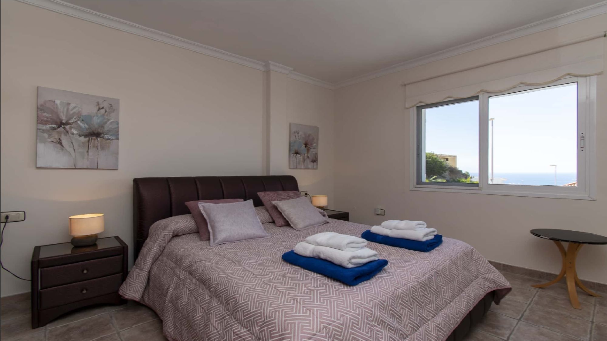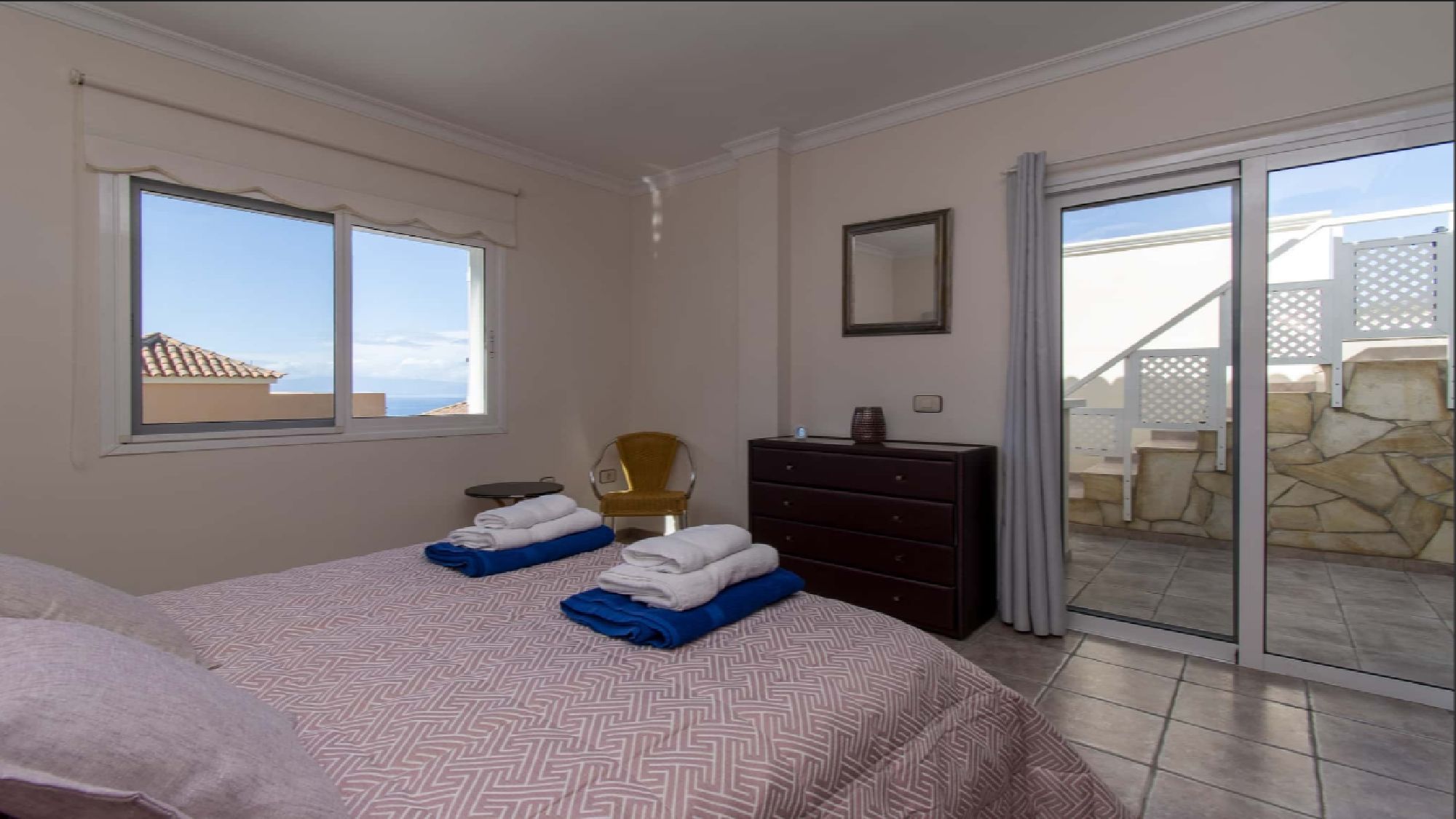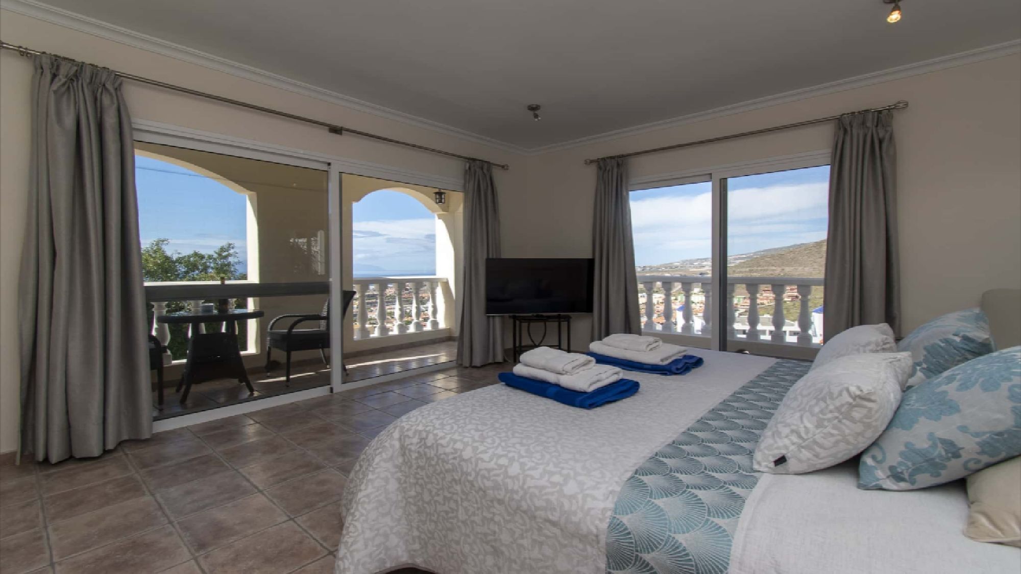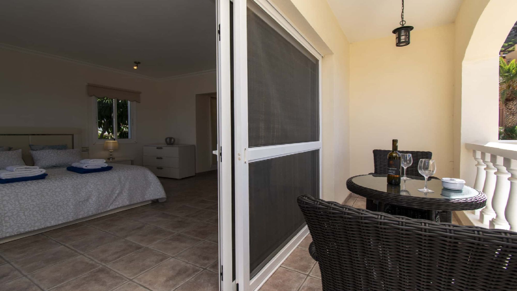 Bedroom 1: double bed, flat screen TV, fitted wardrobes, en suite, patio doors to balcony, table and chairs