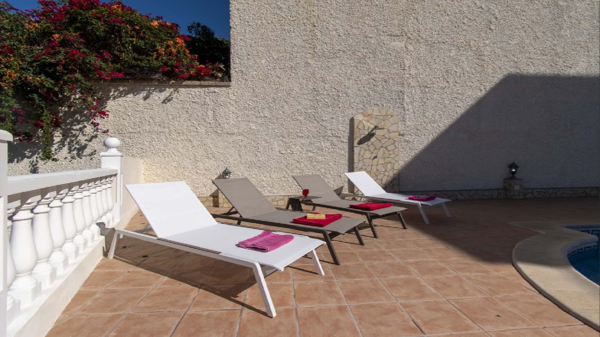 Exterior: dining table for 8, shaded pergola, comfortable outdoor seating area, shower, BBQ, parasol, sun loungers, roof terrace