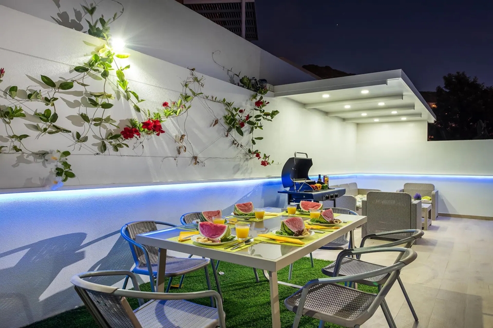 As you step outside you’ll be greeted by an elegant terrace featuring a private heated pool. The terrace is well designed to provide you with everything you need, including a comfortable outdoor seating area, an outdoor dining table for those who want to enjoy outside meals cooked on the BBQ. This villa goes a step further by providing outdoor LED lighting and a ping pong table.