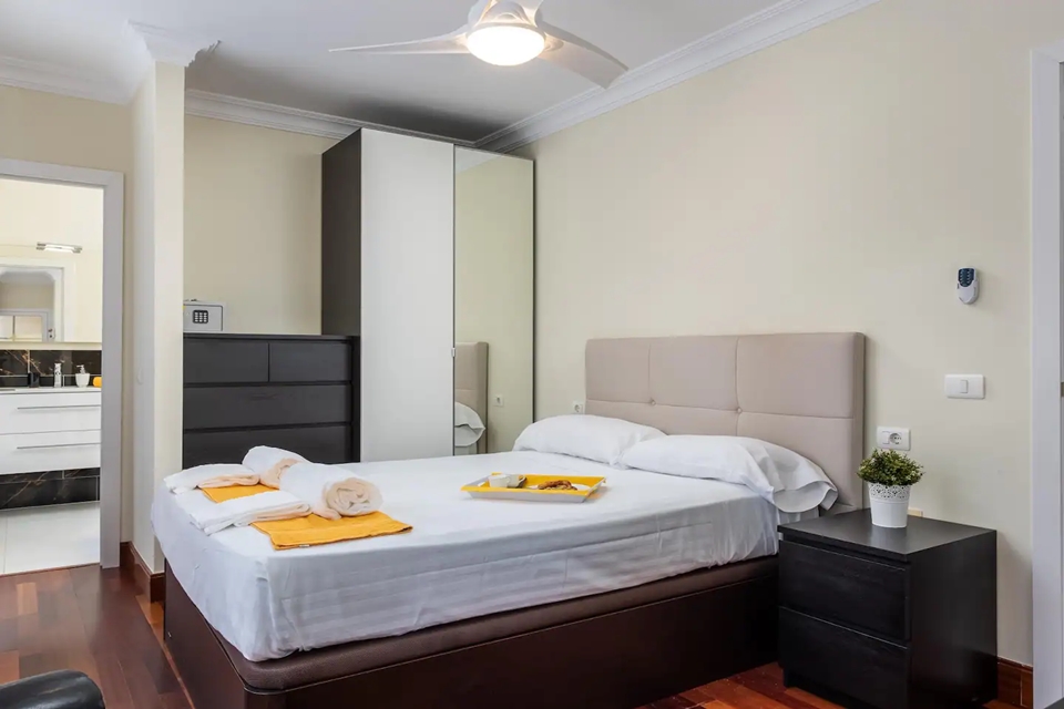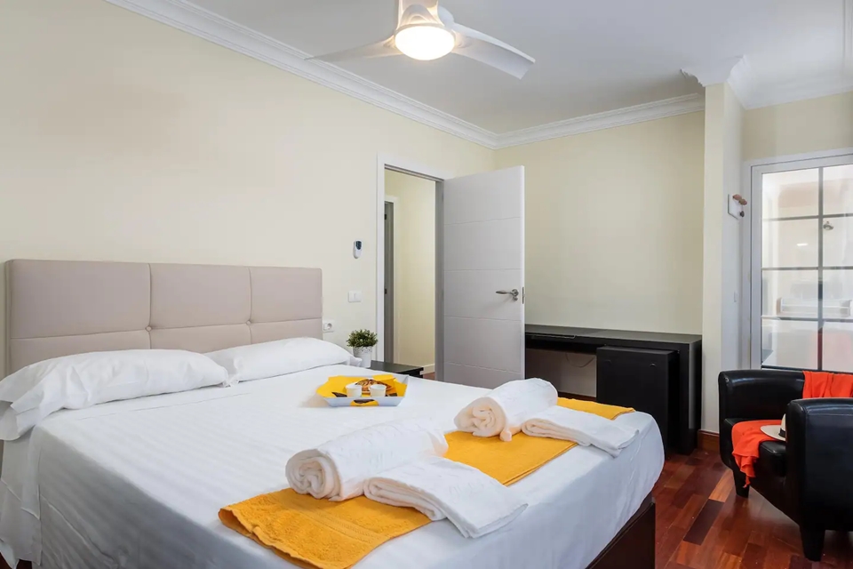 Bedroom 1: king size bed, fitted wardrobes, ceiling fan, armchair, ensuite, patio doors to balcony