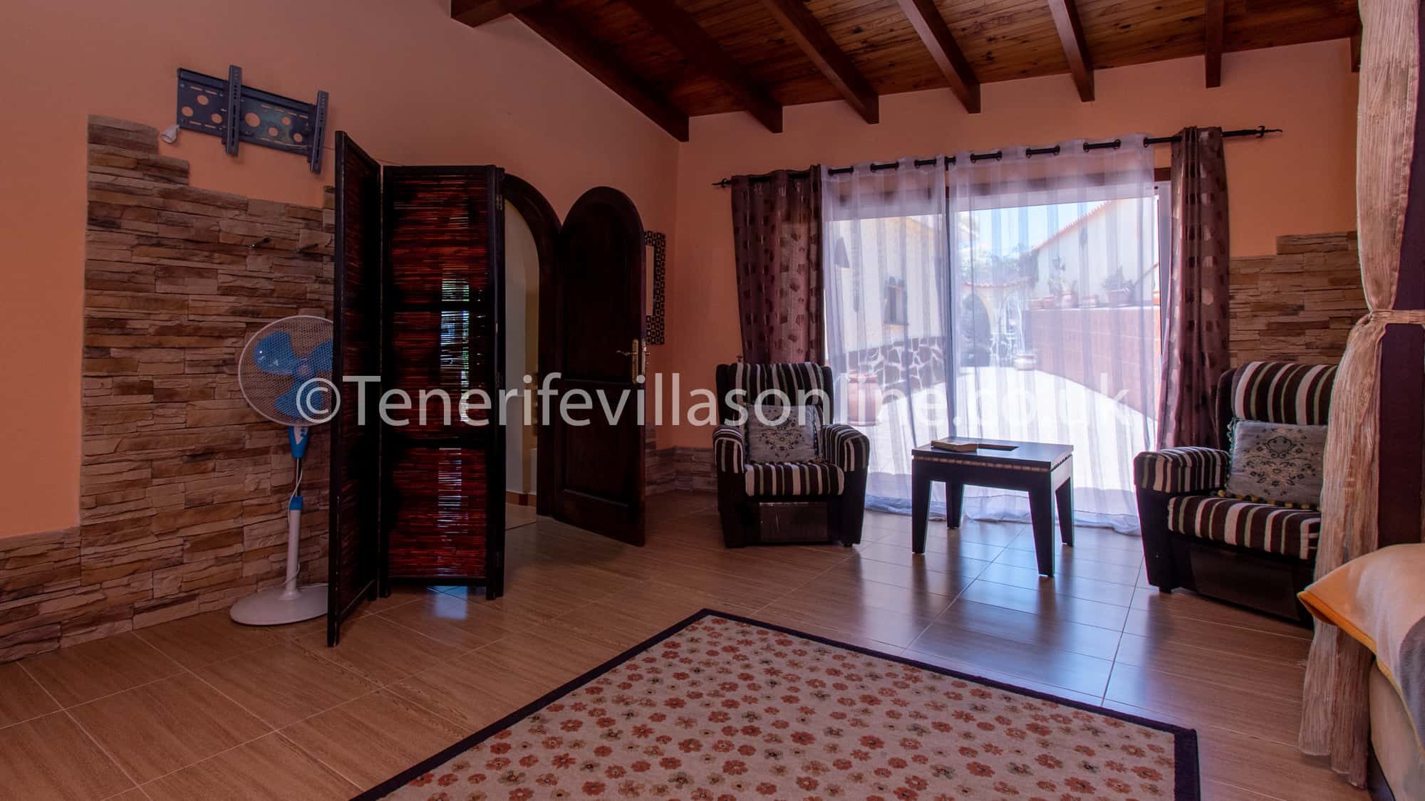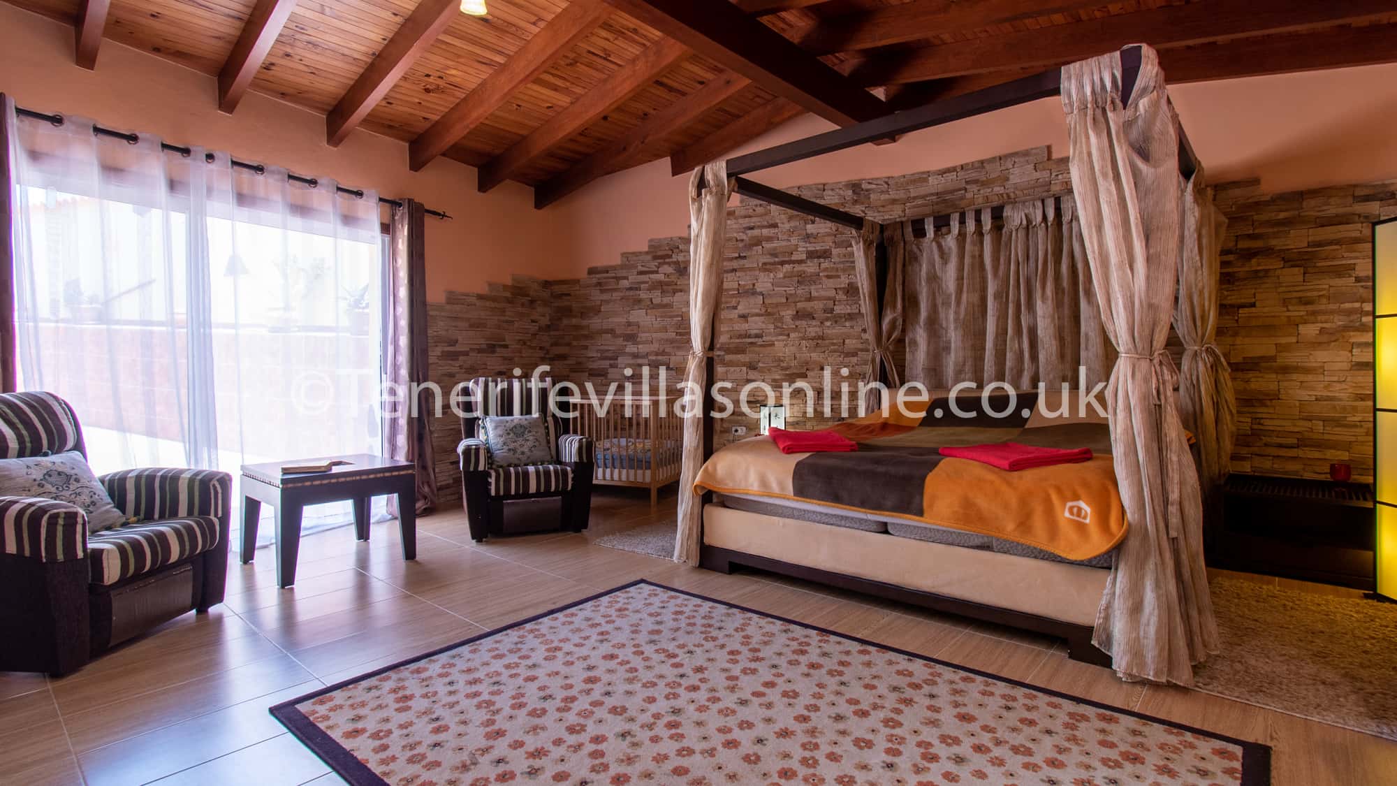 Bedroom 1: poster bed, fitted wardrobes, fan, ensuite, arm chairs (x2)