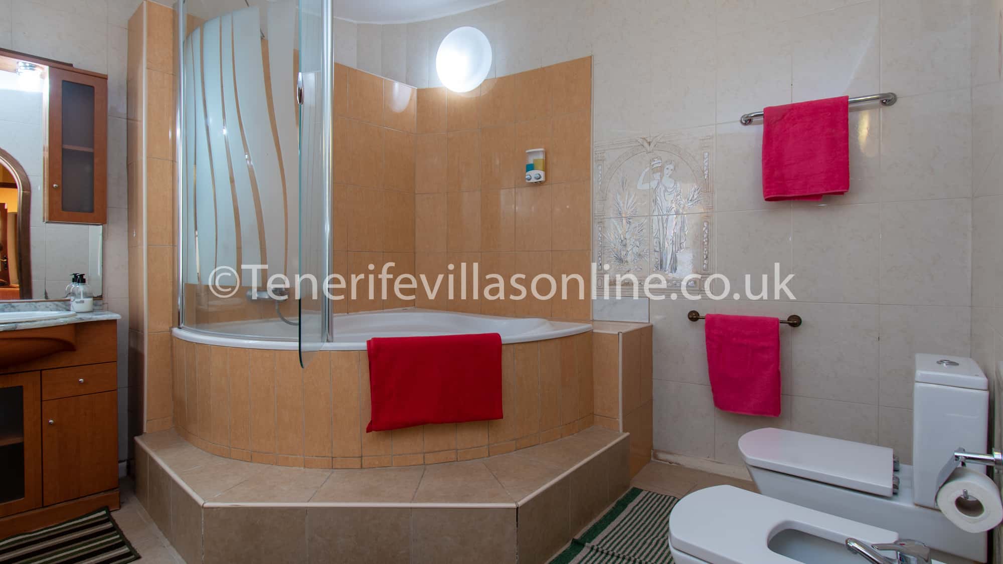 En suite (bedroom 2): toilet, sink, corner bath with shower attachment