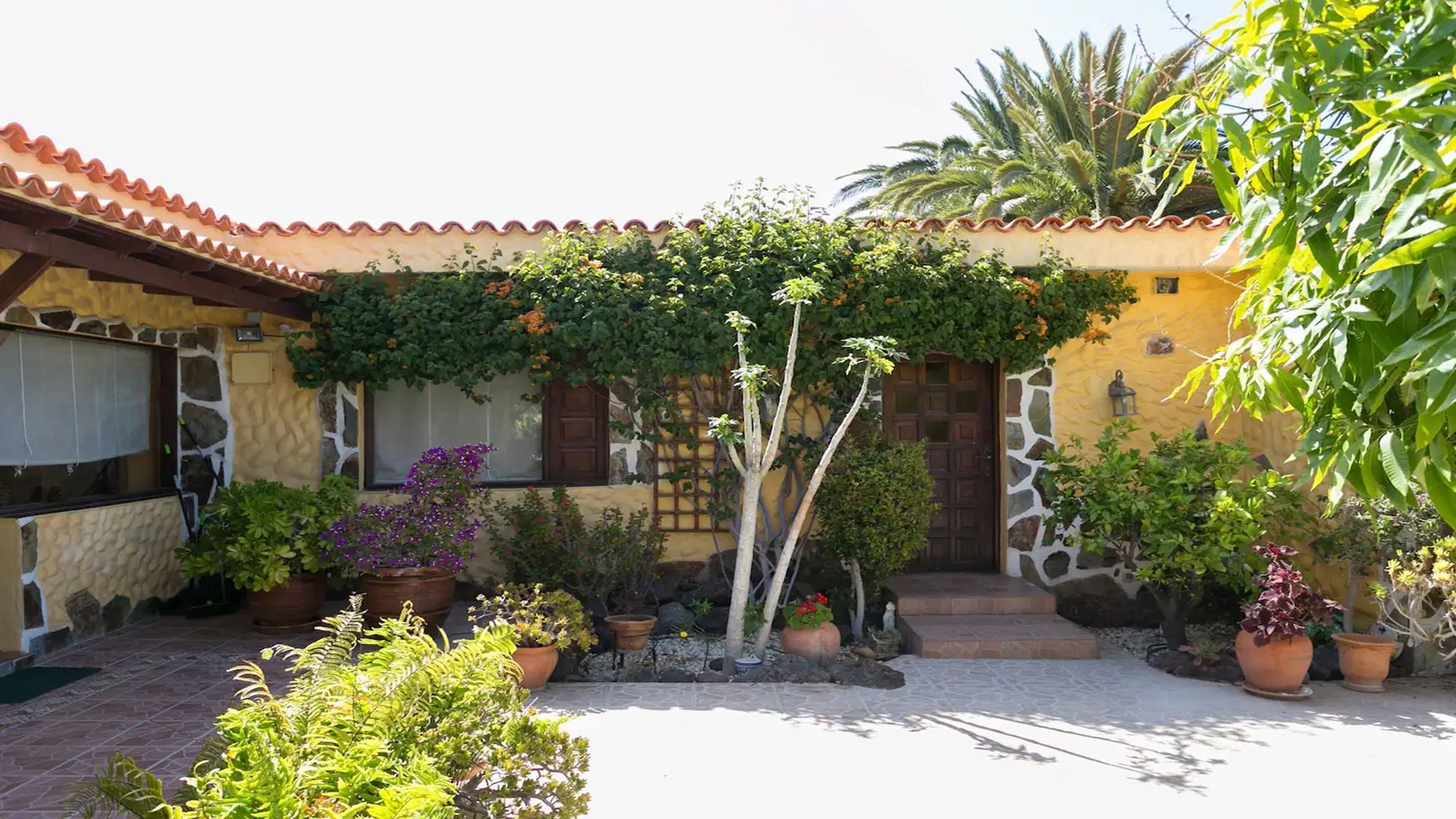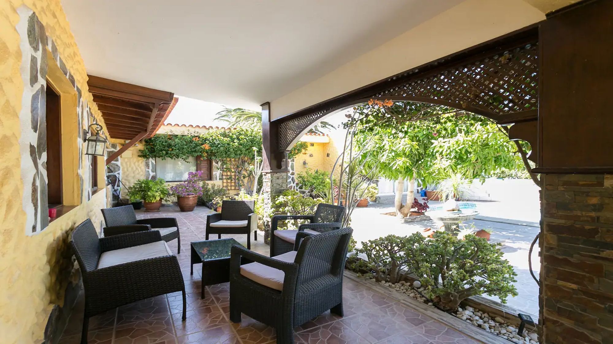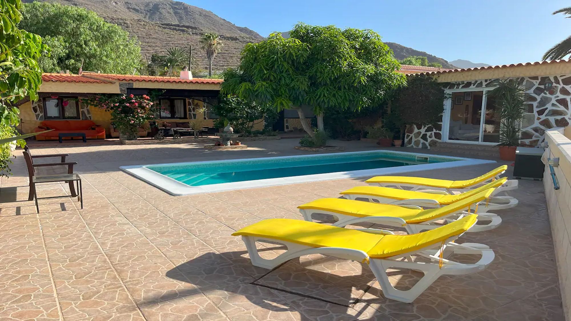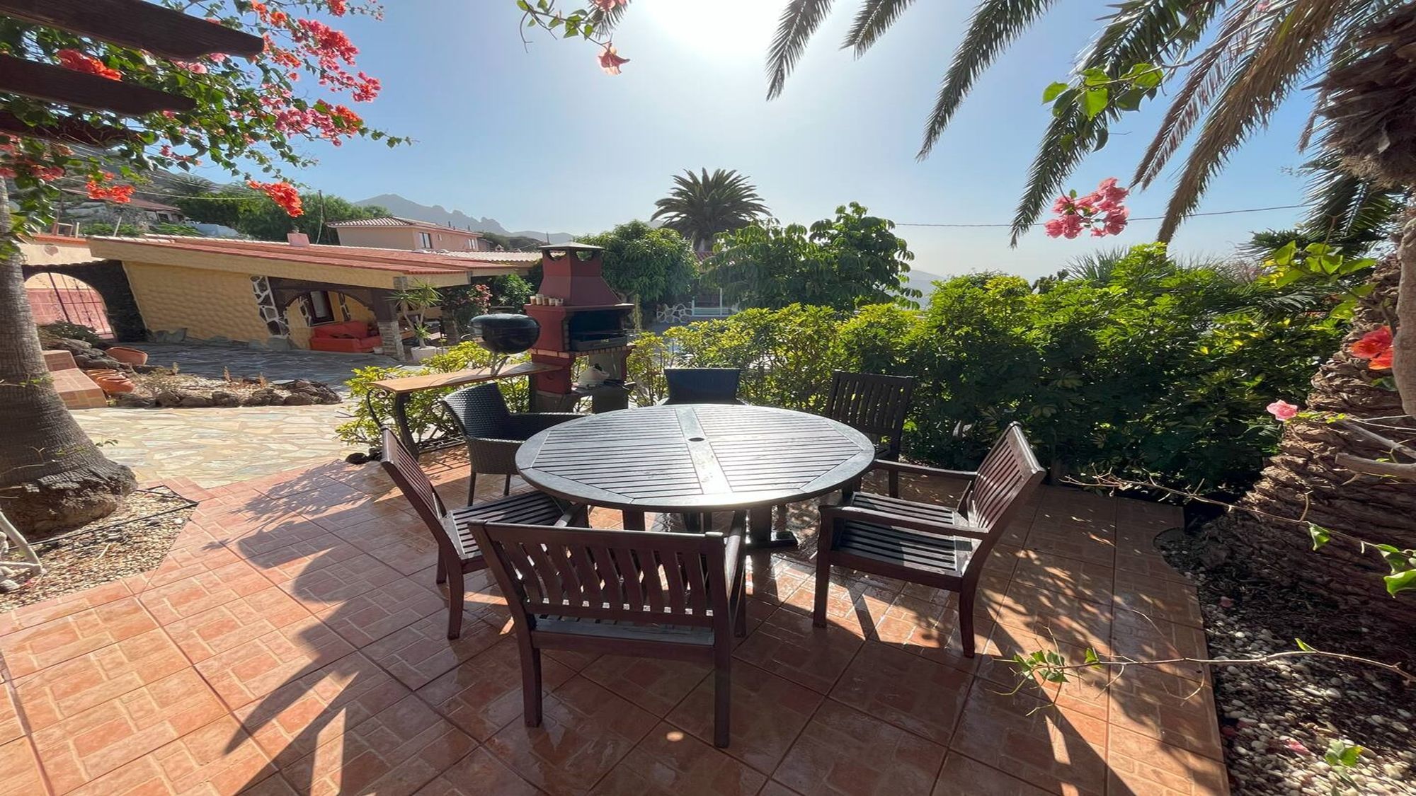 Exterior: several terraces, table and chairs for 8, shower, BBQ, parasol, canarian gardens, sun loungers, shaded outdoor seating area