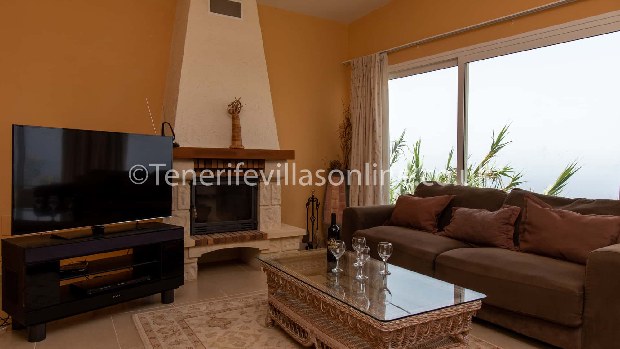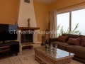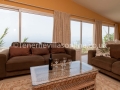 The living room consisting of TV and panoramic windows which offer the most magnificent views all the way down to the coast. You can simply sit right there and enjoy your favourite glass of wine while watching a movie or simply allow yourself to be captivated by the rugged landscape, bright blue sea, and the golden sun.