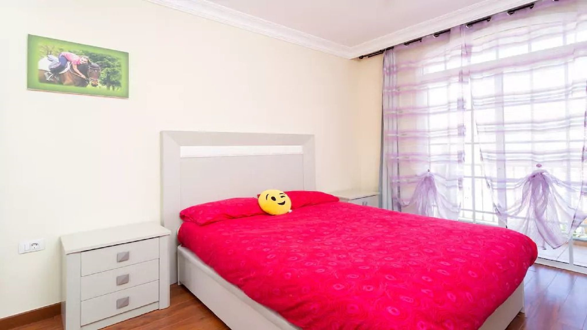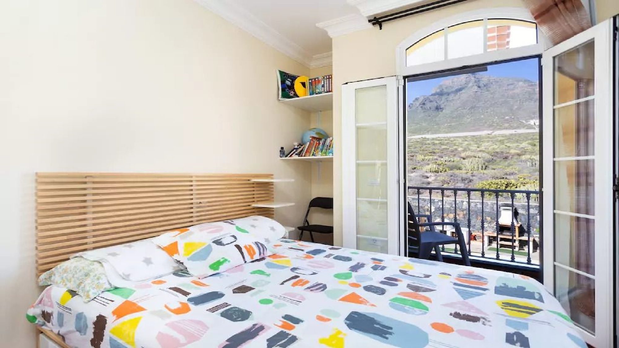 Bedroom 3: double bed, portable air conditioning unit, wardrobes, patio doors to balcony