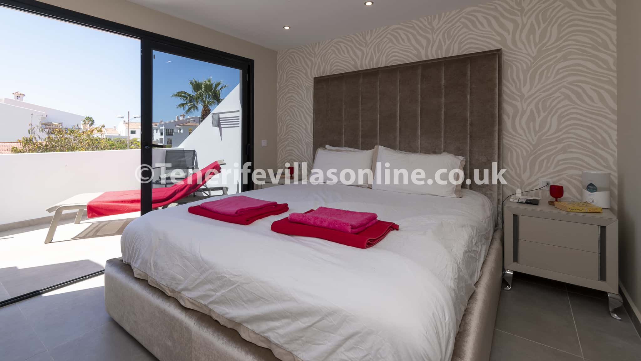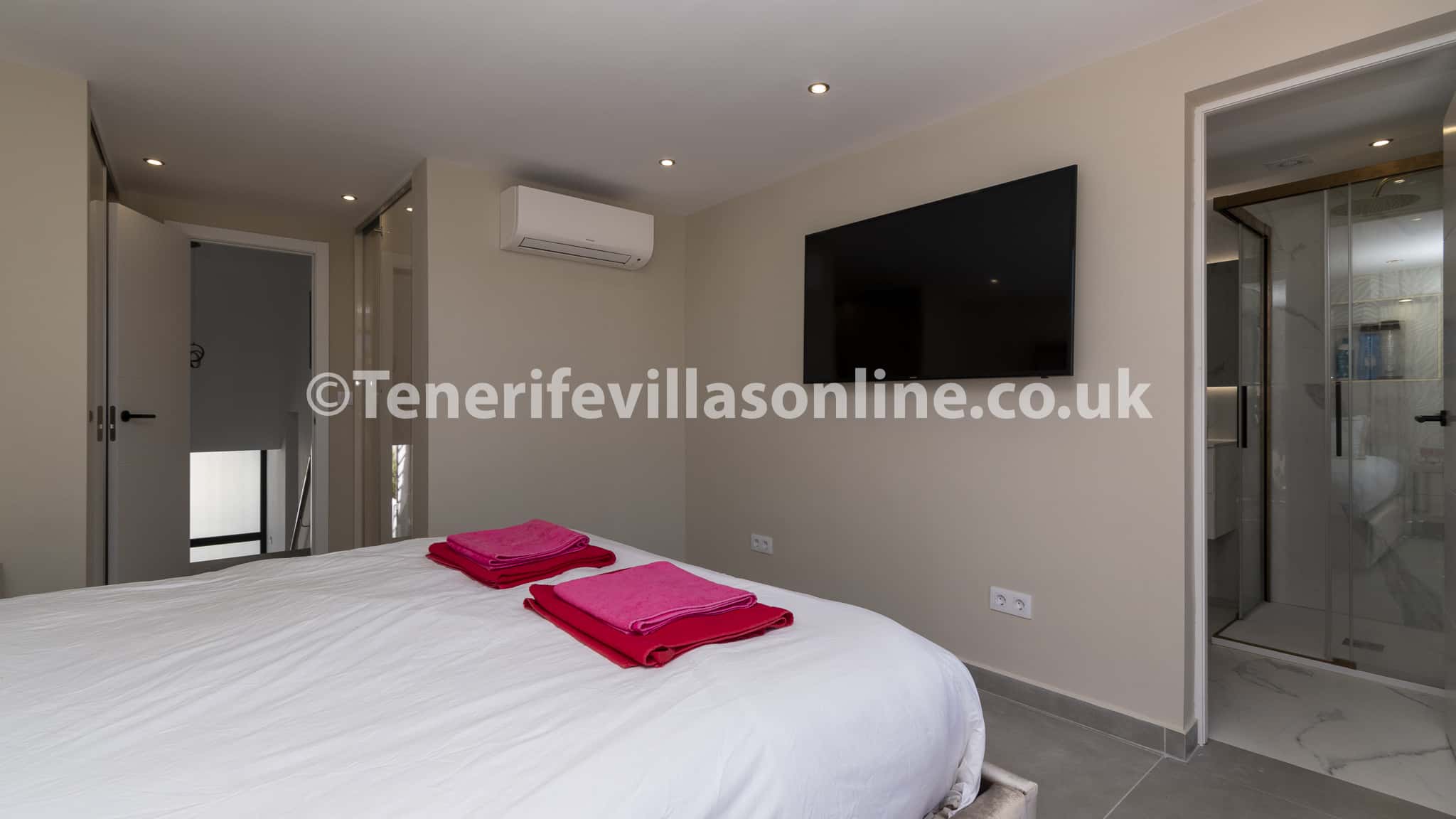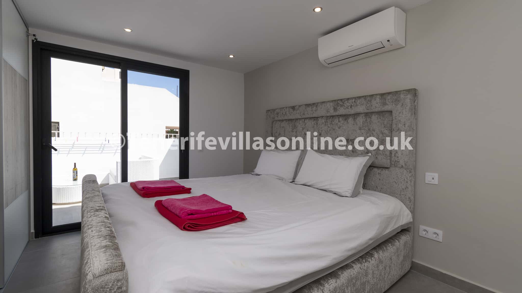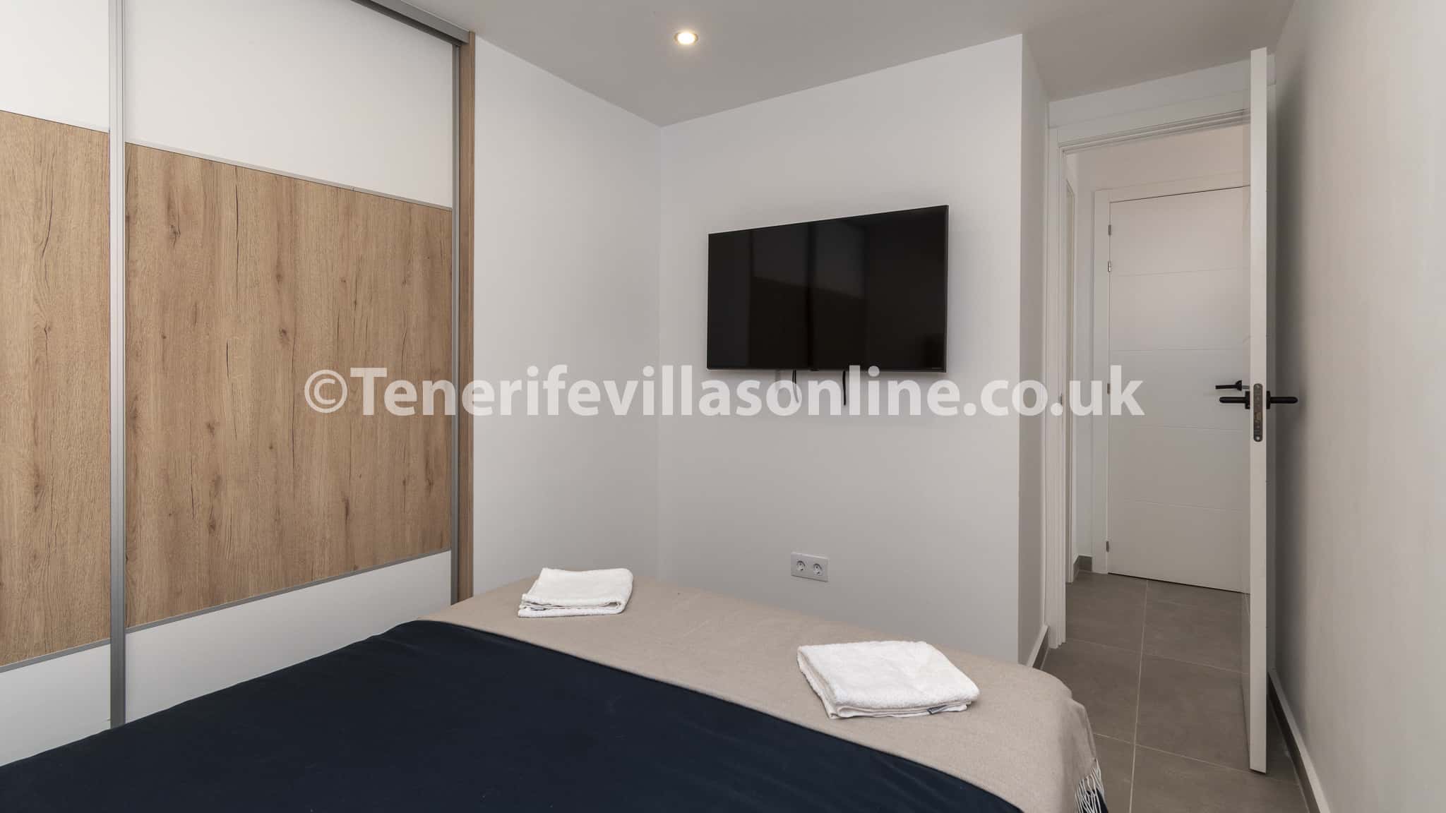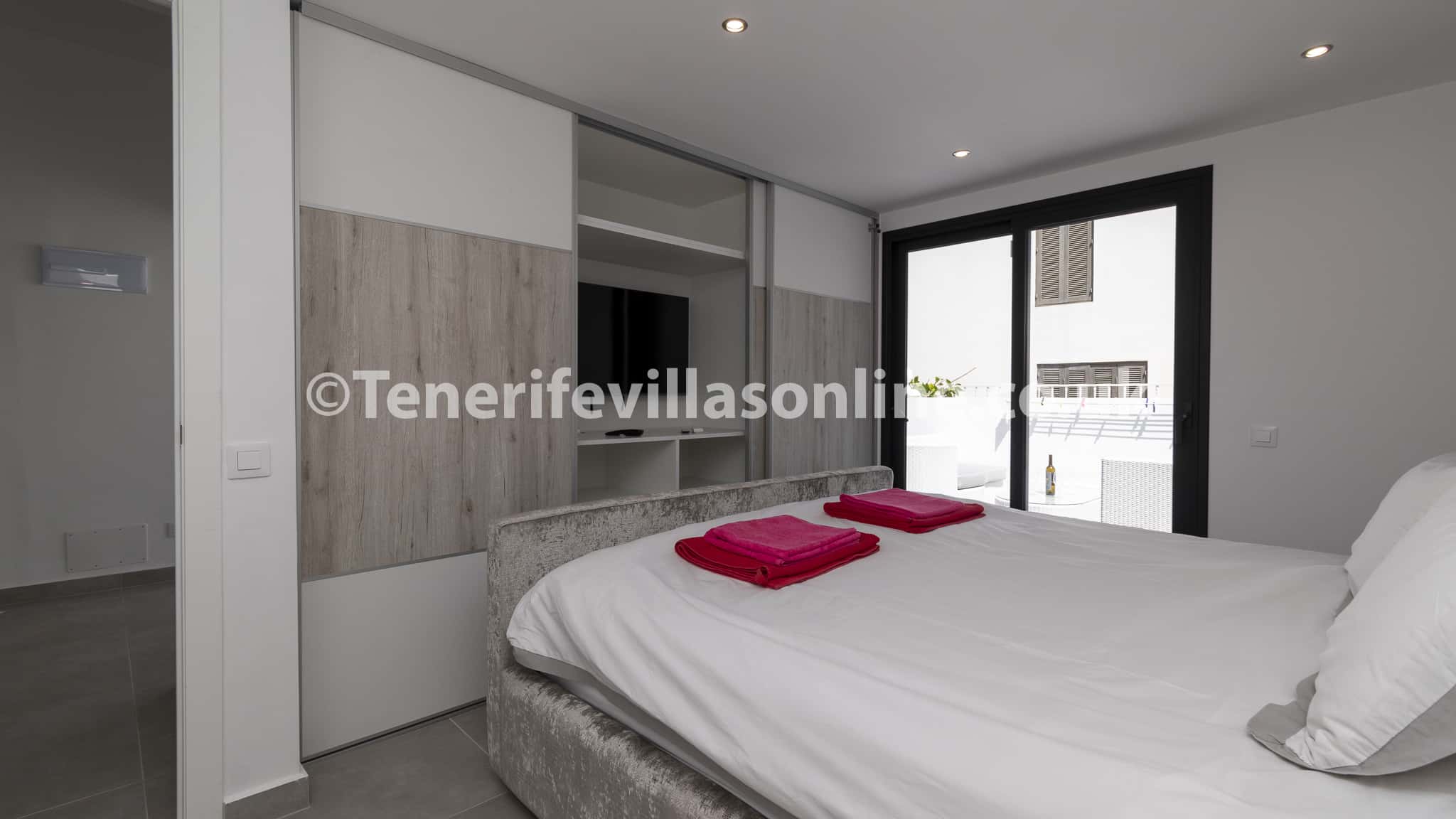 Bedroom 2: king size bed, fitted wardrobes, TV air conditioning, patio doors to terrace