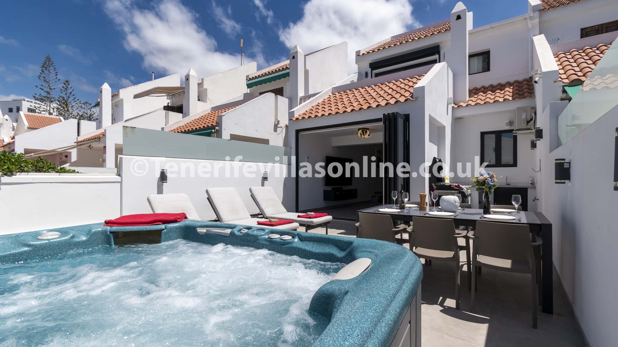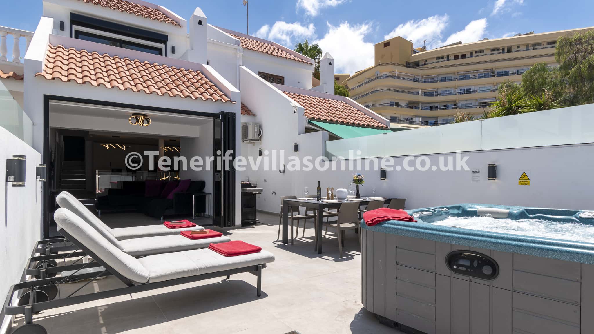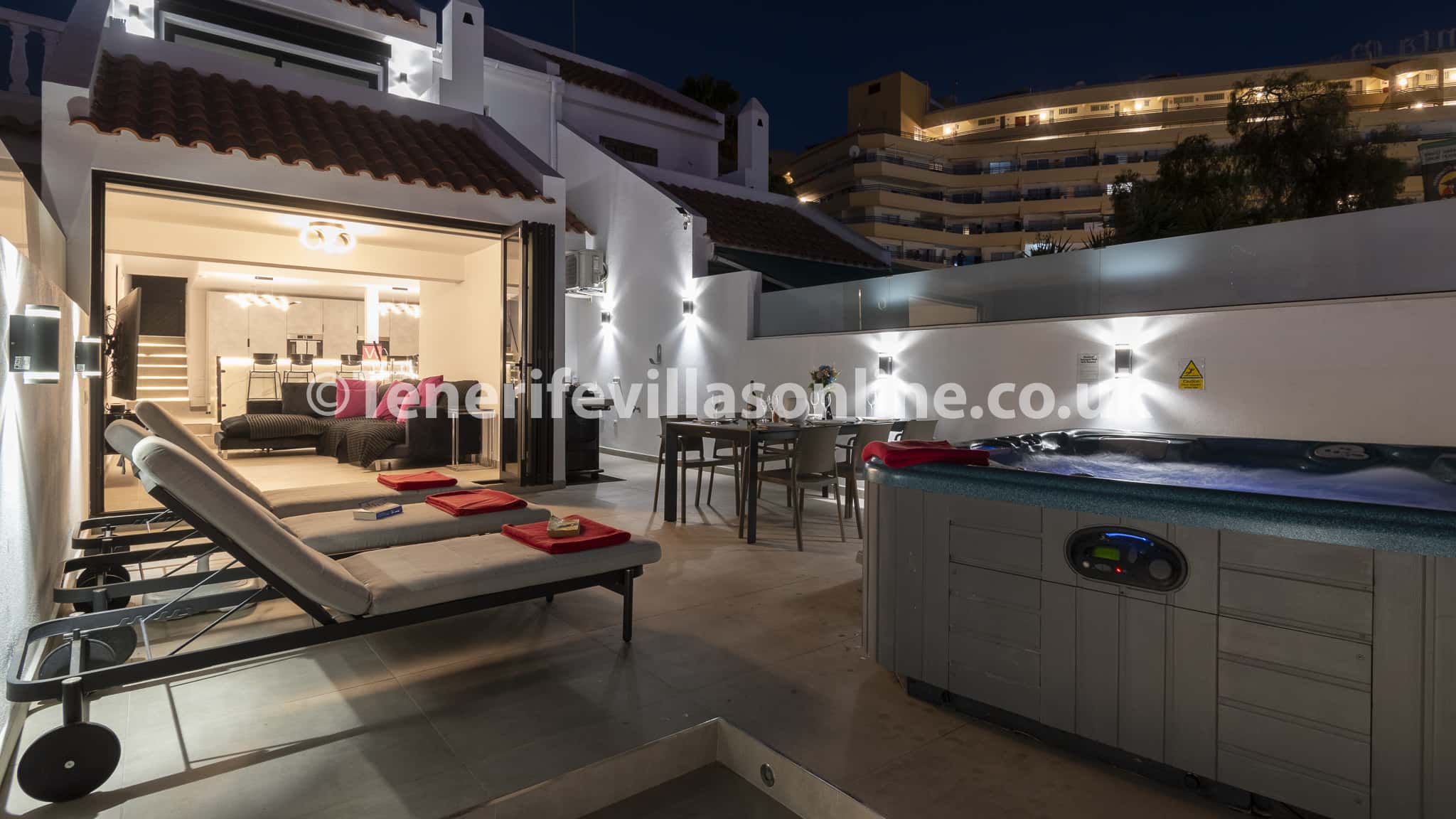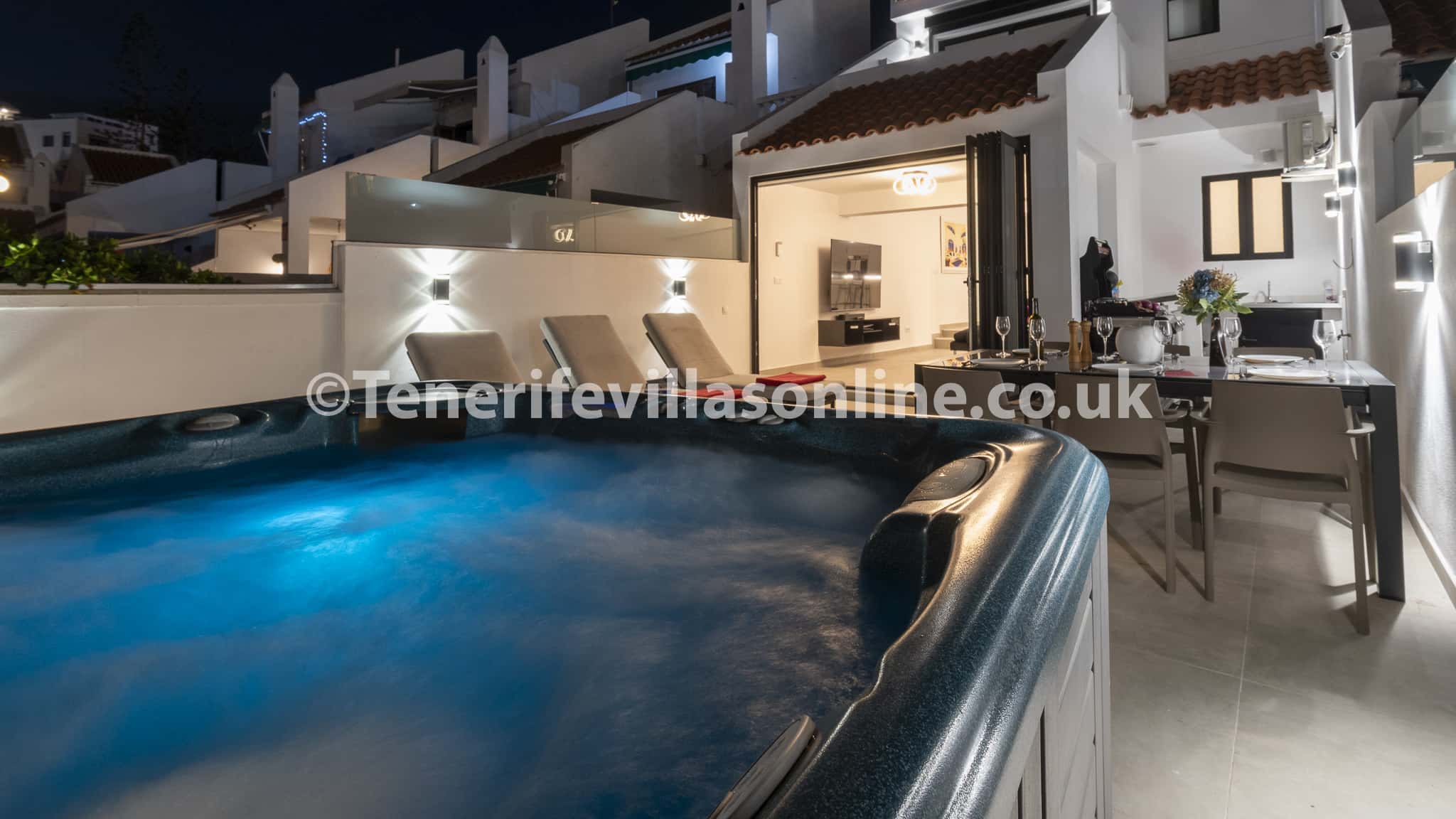 Date of stay: January 2024 Great location. Close to all bars, restaurants and supermarkets. The hot tub is fantastic. Nice to have your own front terrace with your own sun beds. Would defo come back again it was brilliant. Everything was clean and plenty of space.