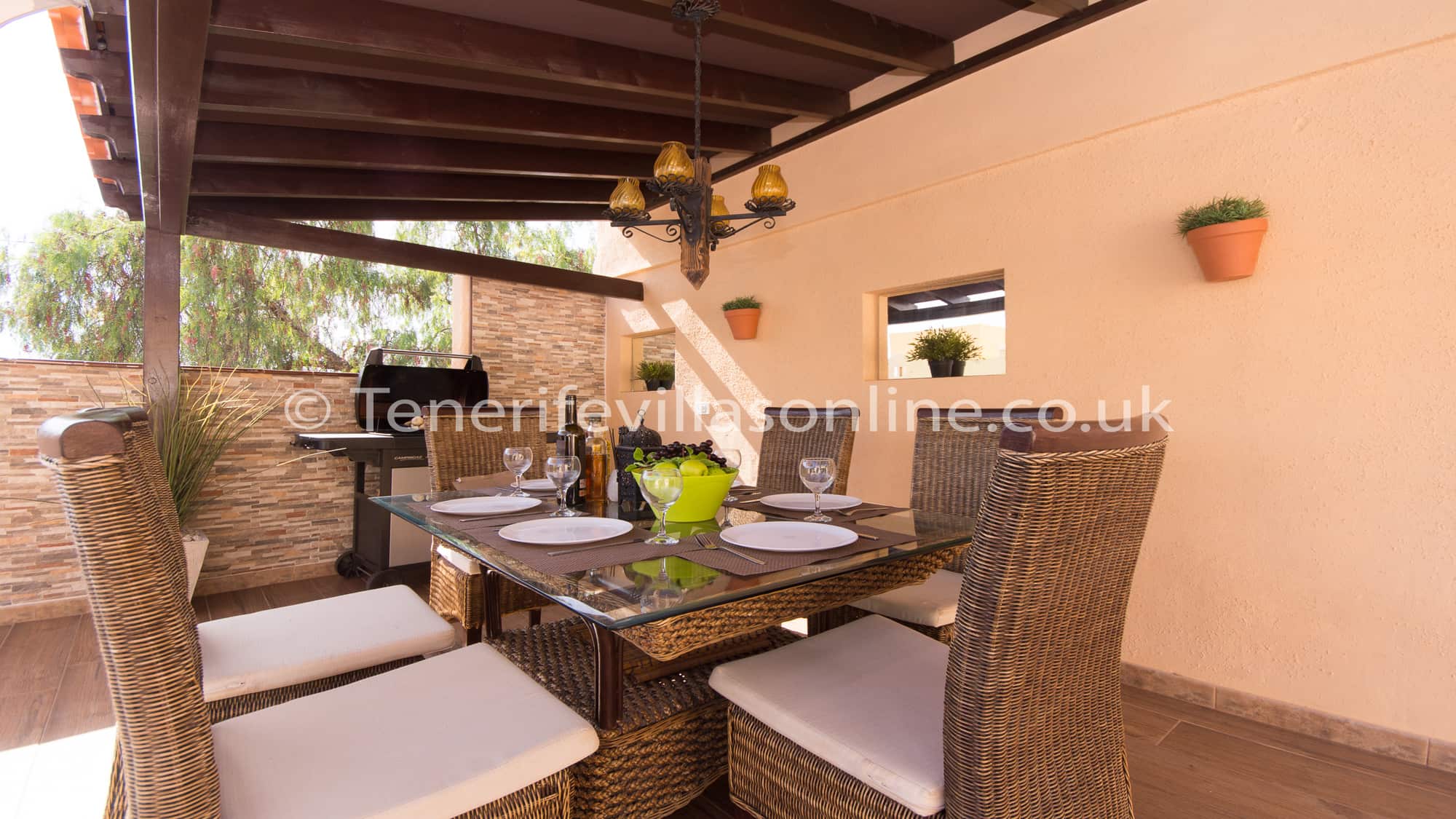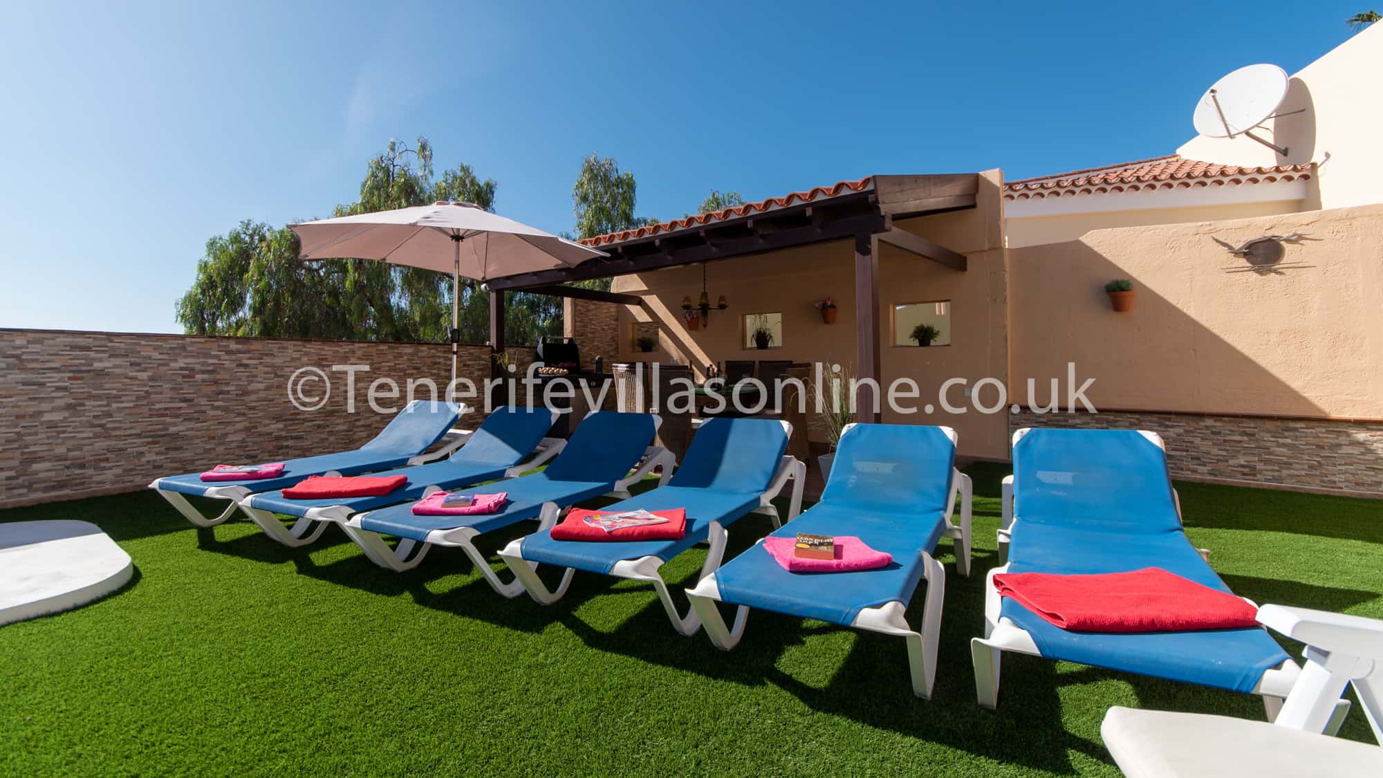 Exterior: dining table for 6, shaded pergola, comfortable seating area, BBQ, parasol, sun loungers