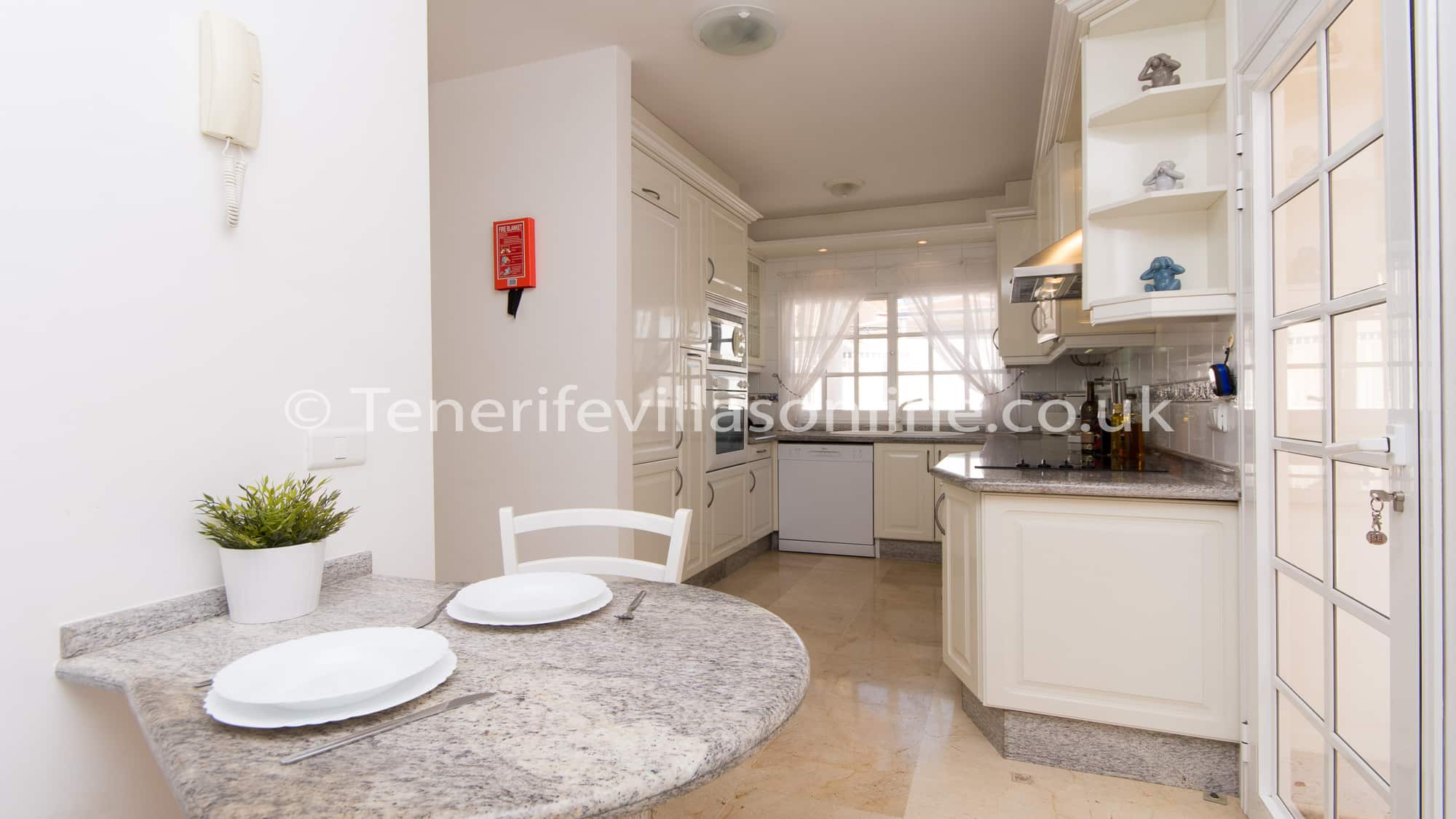 Kitchen: oven/hob, fridge/freezer, kettle, microwave, toaster, sandwich maker, breakfast bar for 2, marble work surfaces