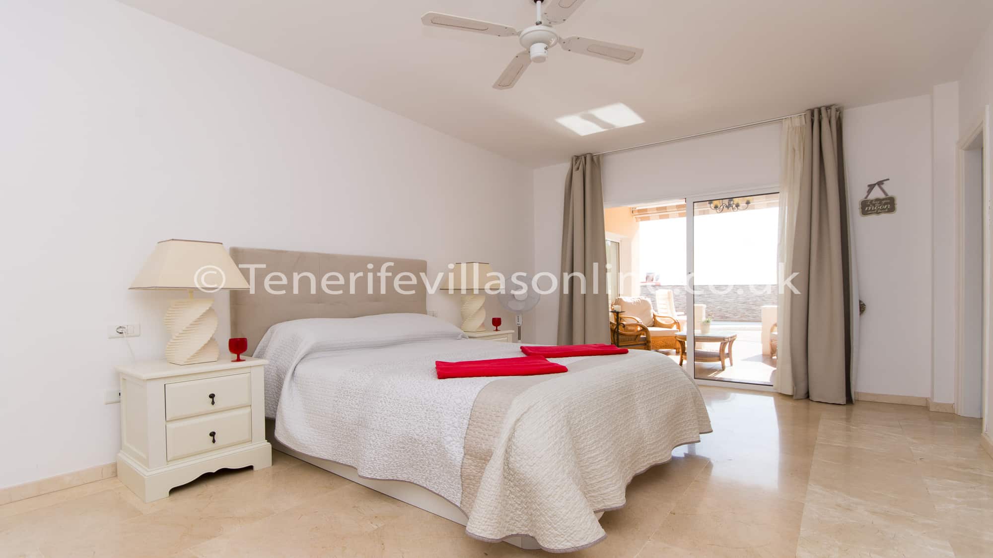 Bedroom 1: king size bed, fitted wardrobes, ceiling fan, en suite, patio doors to terrace