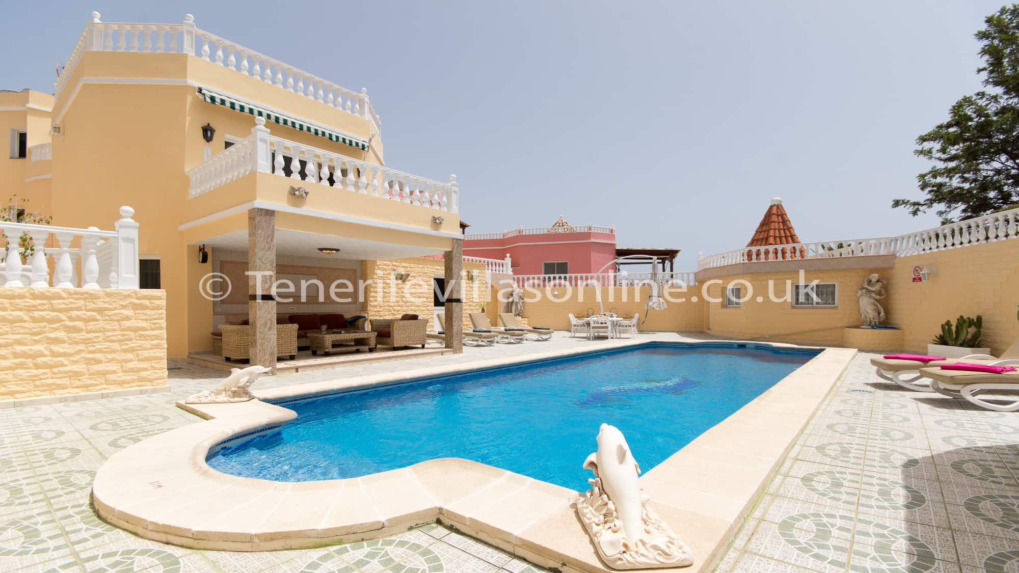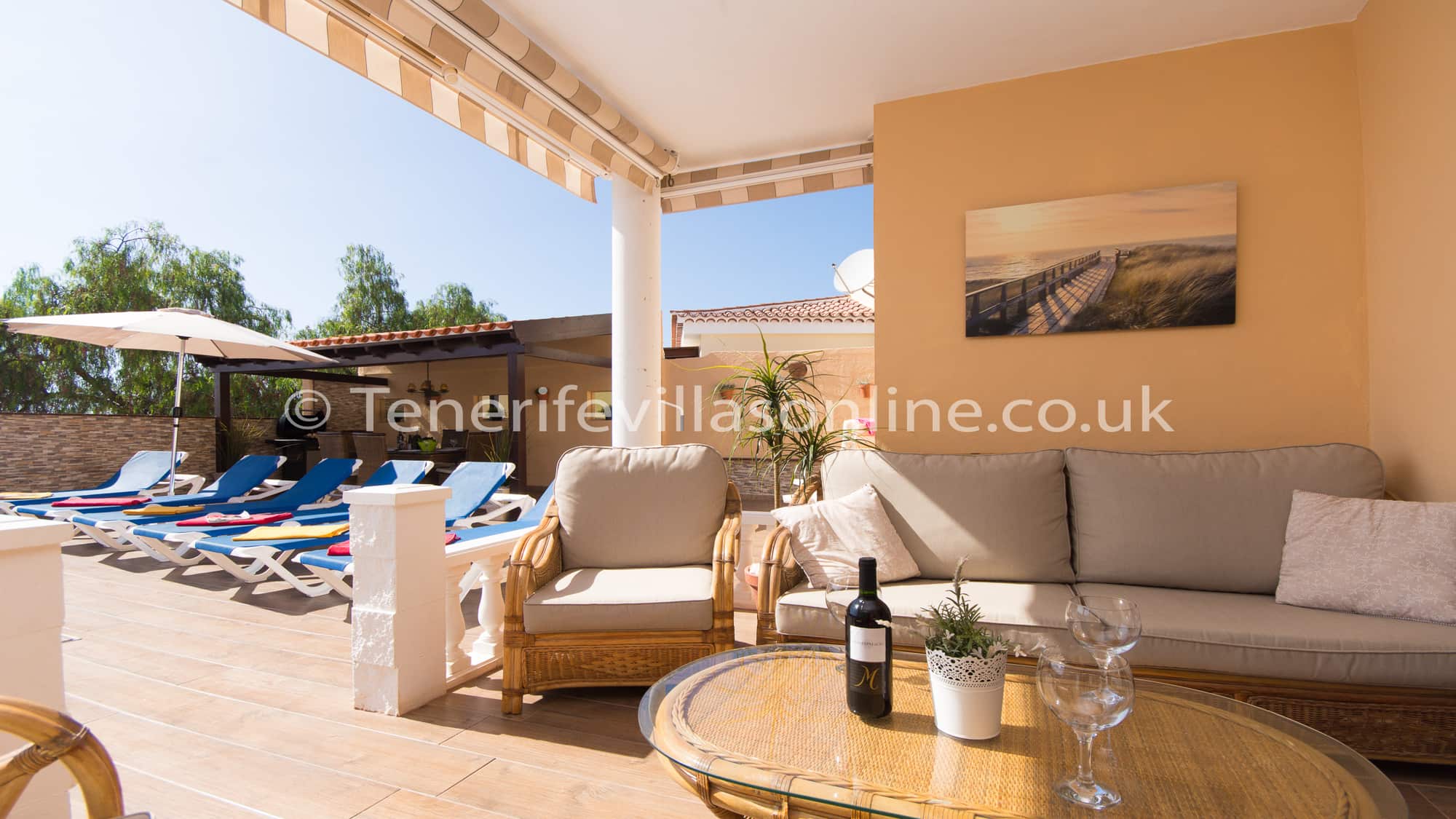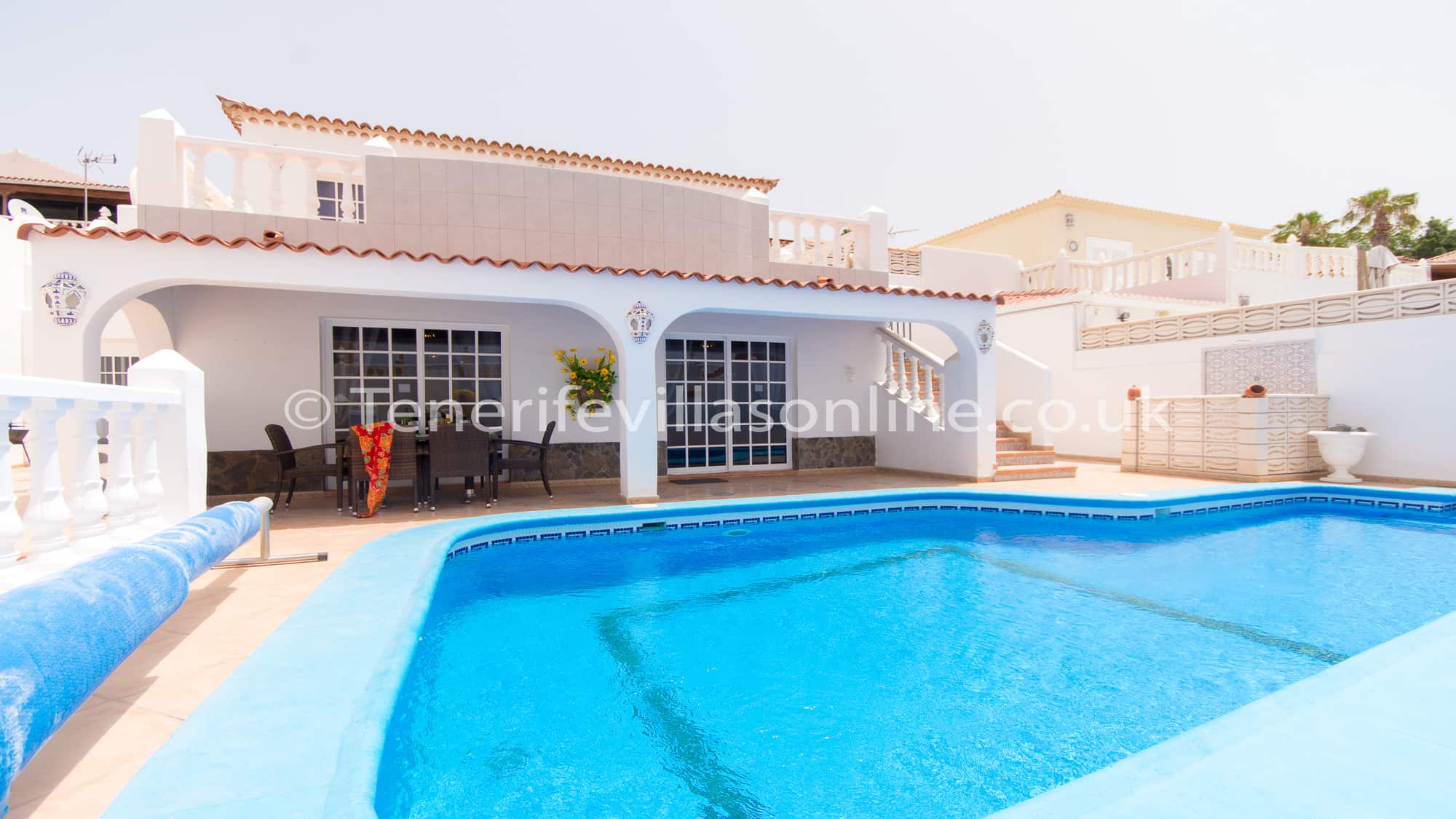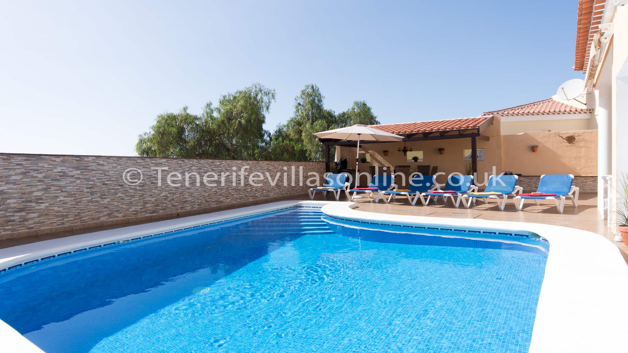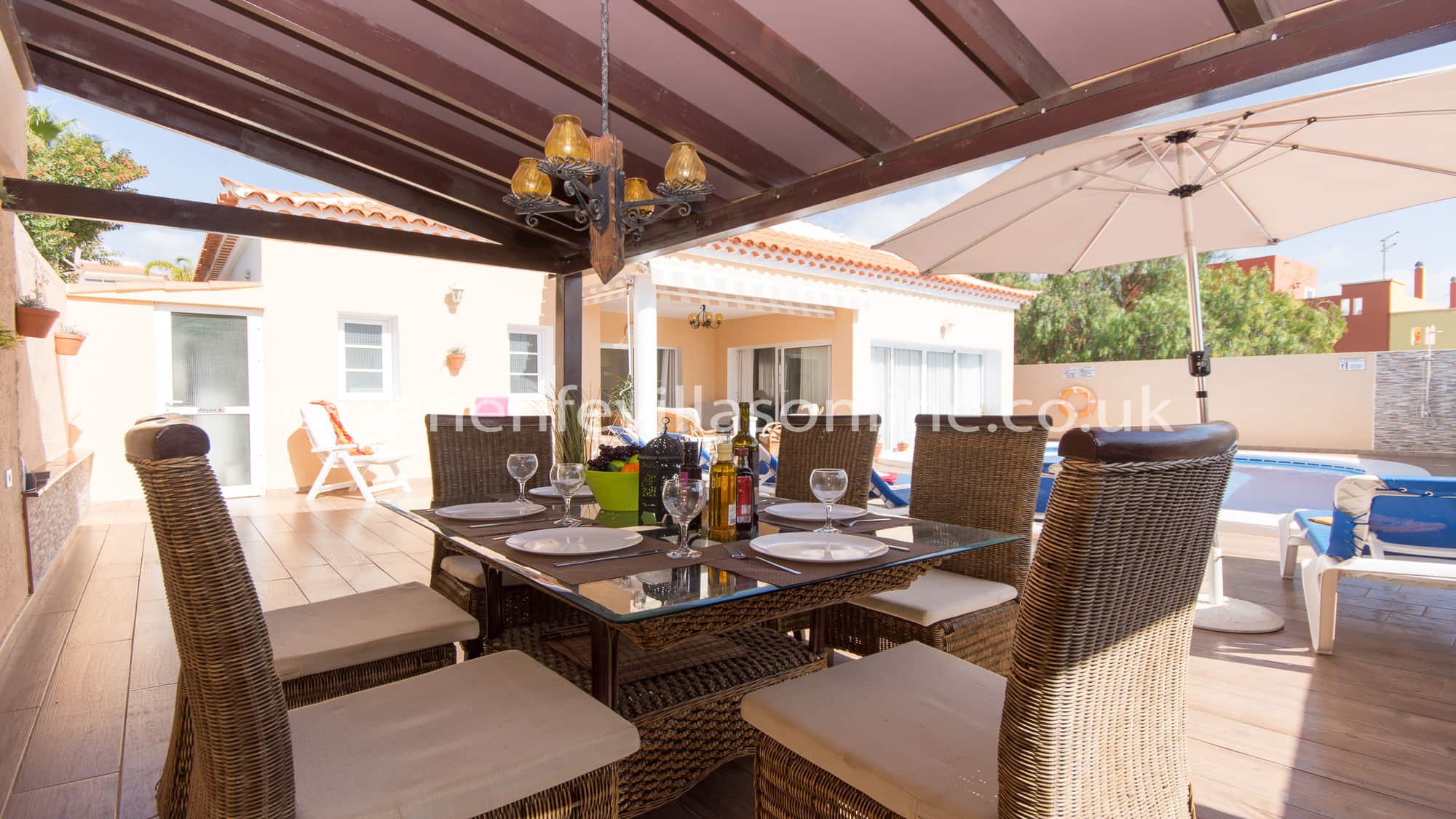 Tenerife Villas Online offers, to rent this spacious 3 bedroom 2 bathroom detached villa with private heated pool in the residential resort of Callao Salvaje, Tenerife. This Tenerife Villa is all on one level has been furnished to a good standard throughout. The owners have included some typical Spanish furniture along with traditional British style as well. The kitchen includes marble work surfaces, dishwasher, ... Read More >>