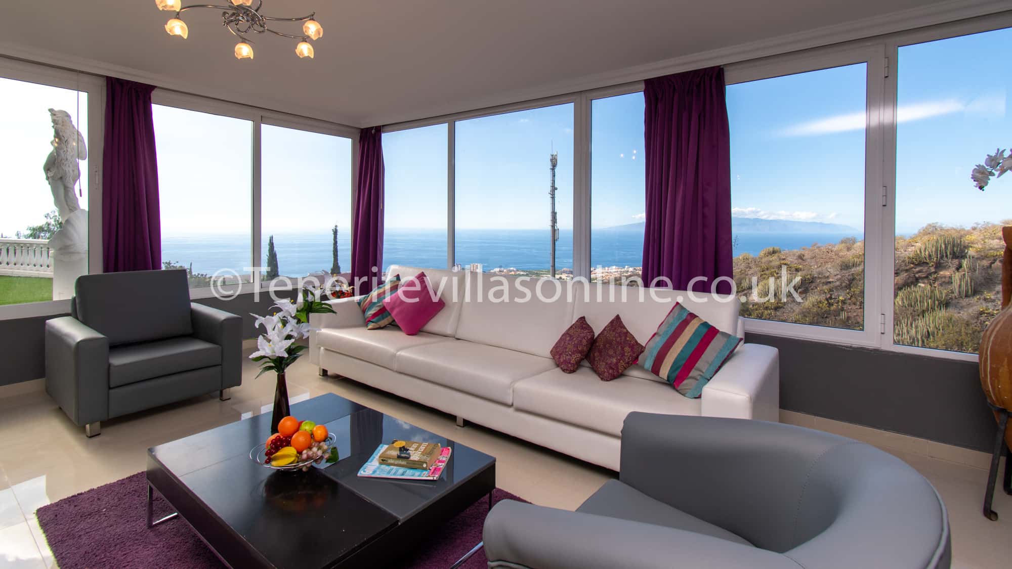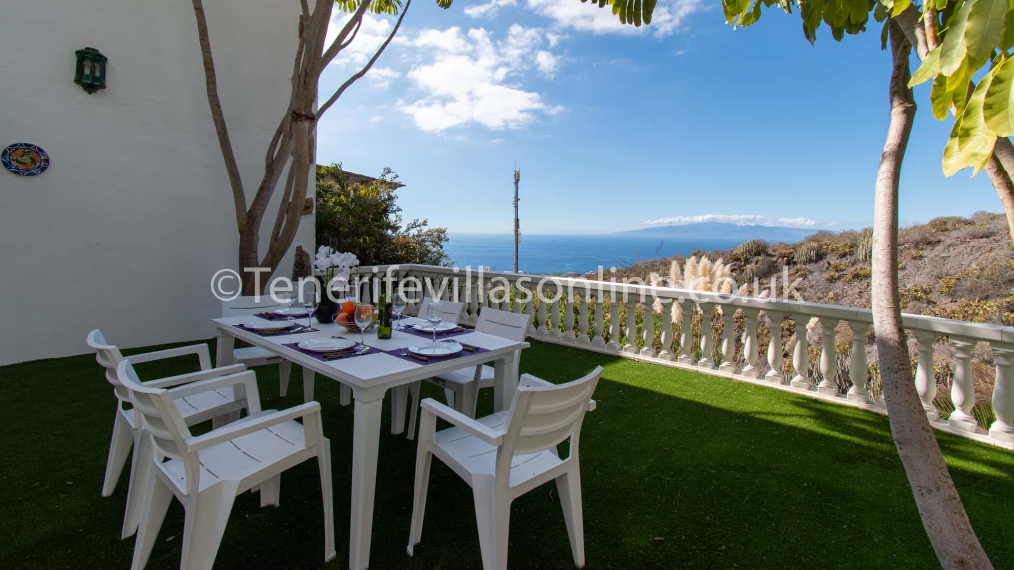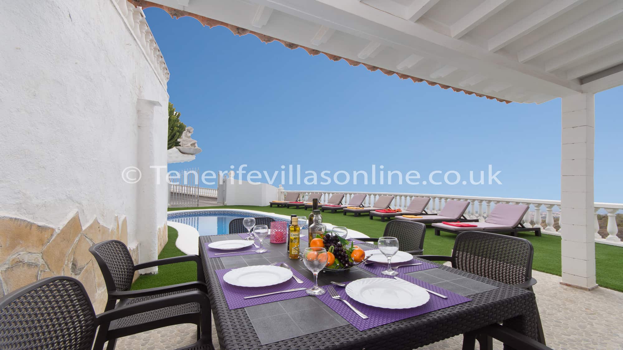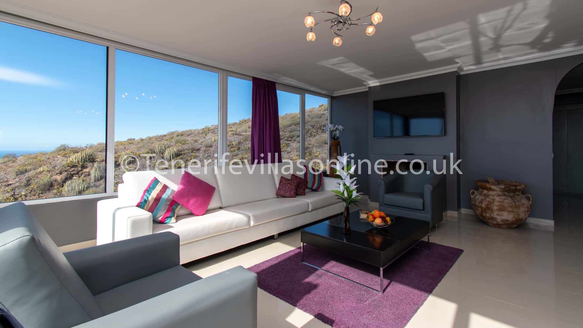 Tenerife Villas Online offer you this amazing 4 bedroom property located in Las Moradites, Adeje. Situated all on one level, you enter the villa straight into the spacious open planned living area, including a huge 42 inch flat screen TV and a comfortable sofa with adjacent dining area. This open plan living space offers stunning sea views through the large panoramic windows. The kitchen area consists of oven/hob, fridge/freezer, dishwasher, washing machine, microwave, toaster, kettle, breakfast bar for 3, fitted with granite work surfaces and everything you would need in a sophisticated home.