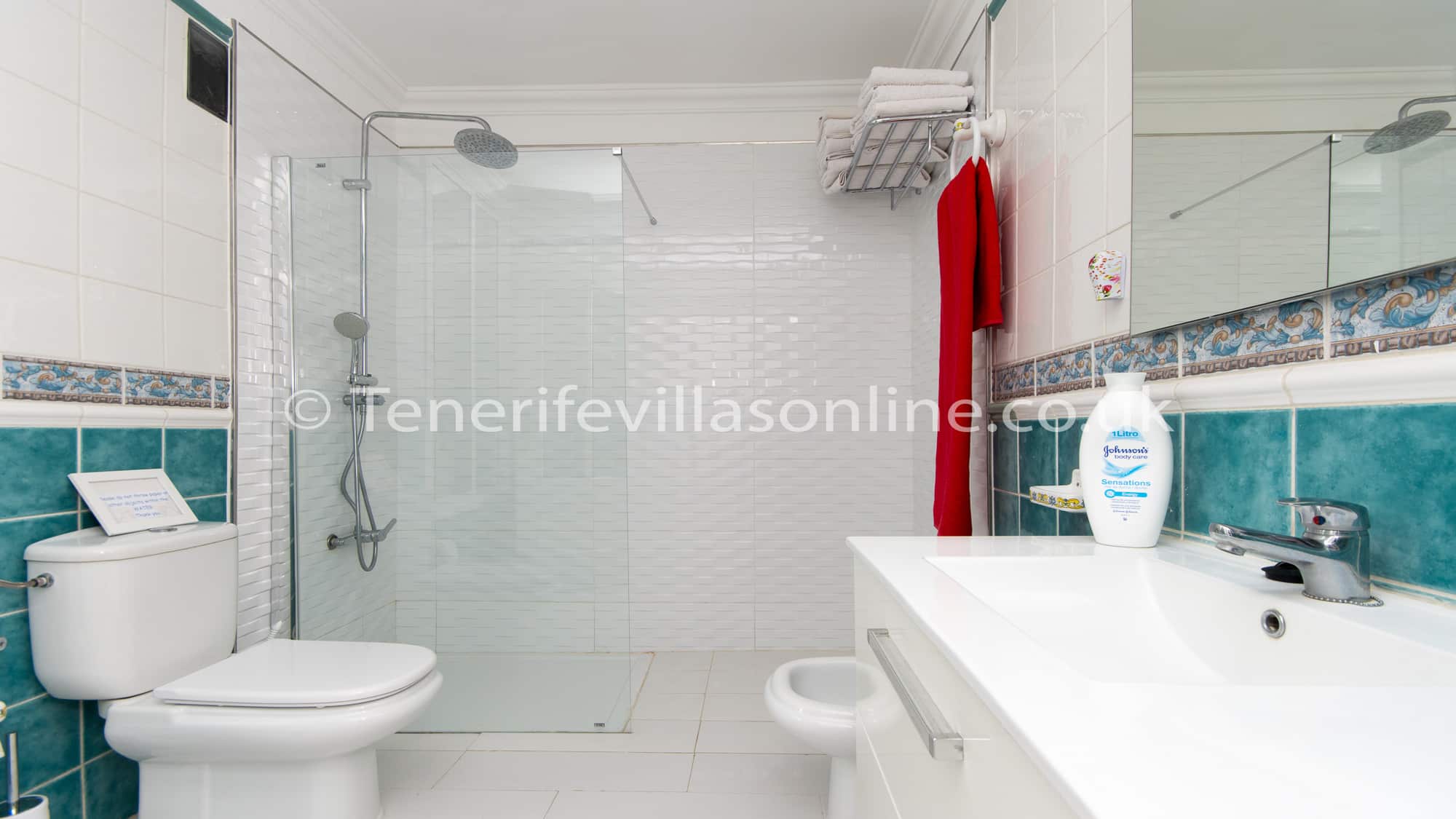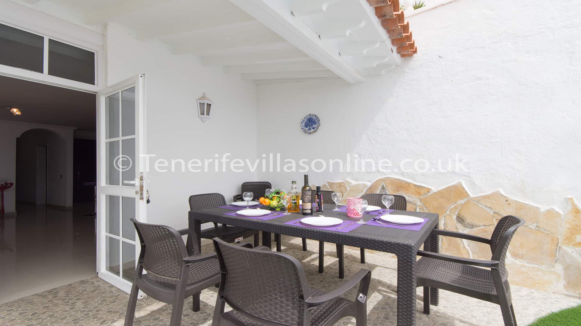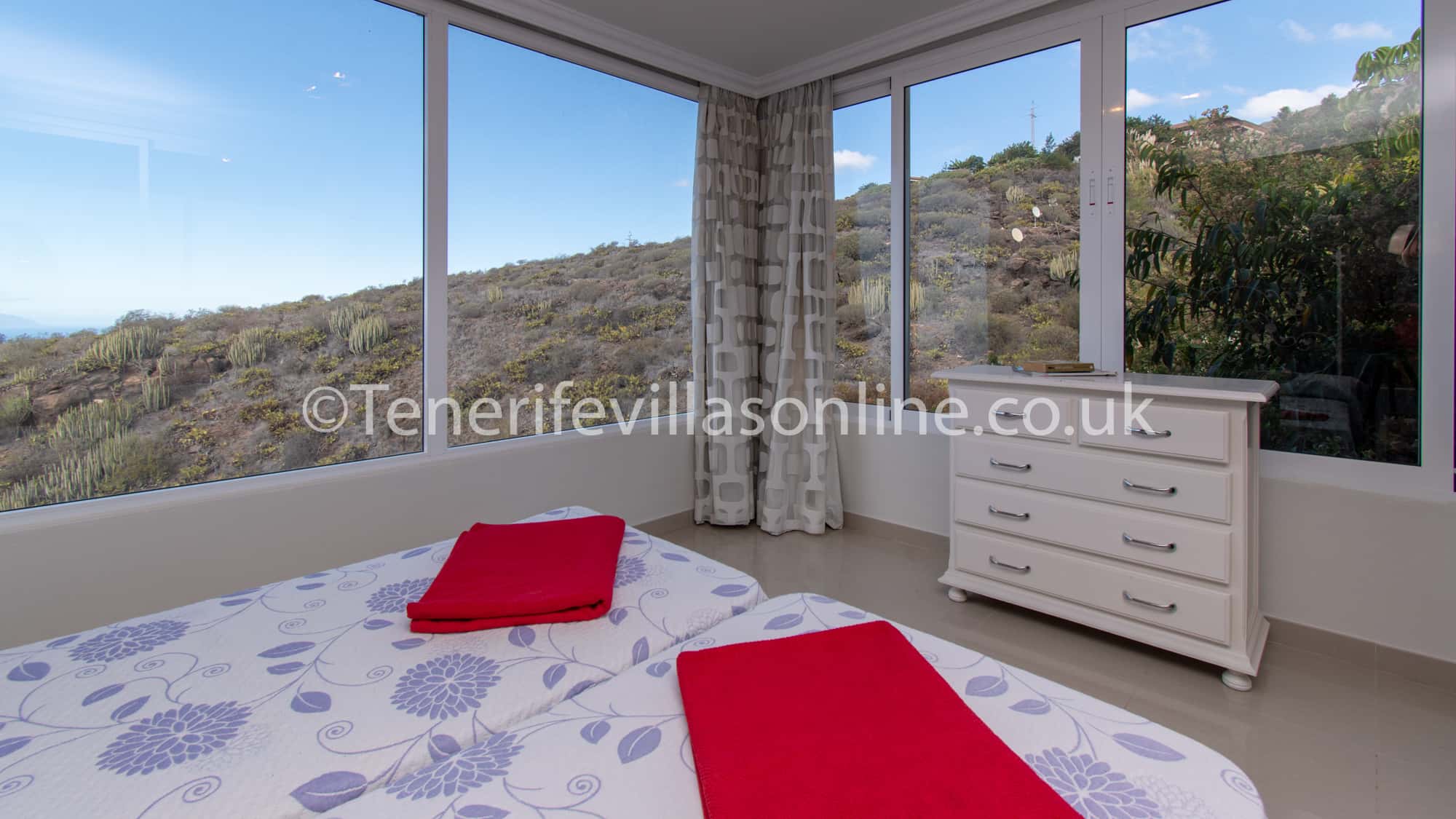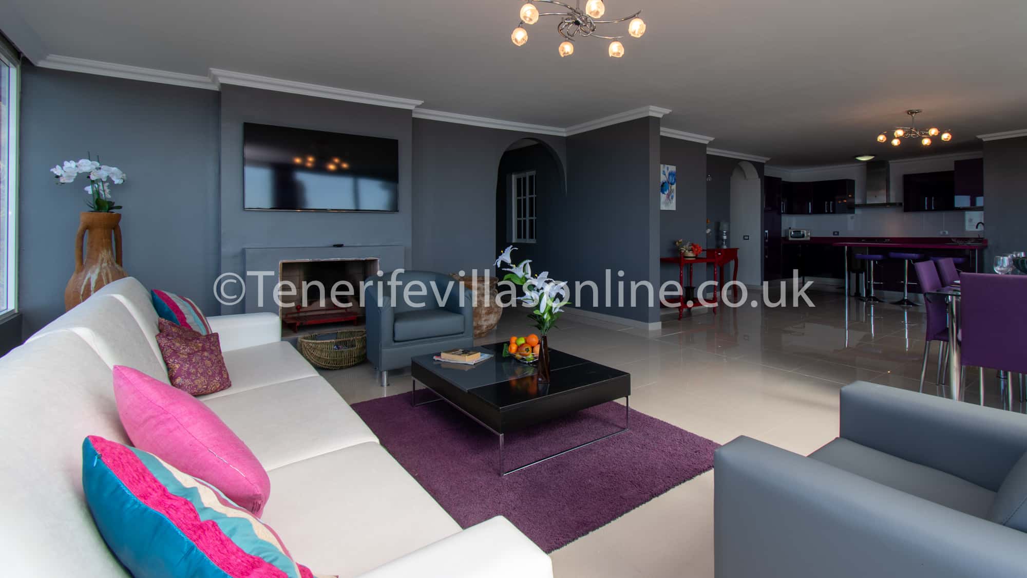 Tenerife Villas Online offer you this amazing 4 bedroom property located in Las Moradites, Adeje. Situated all on one level, you enter the villa straight into the spacious open planned living area, including a huge 42 inch flat screen TV and a comfortable sofa with adjacent dining area. This open plan living space offers stunning sea views through the large panoramic windows. The kitchen area consists of oven/hob, fridge/freezer, dishwasher, washing machine, microwave, toaster, kettle, breakfast bar for 3, fitted with granite work surfaces and everything you would need in a sophisticated home.