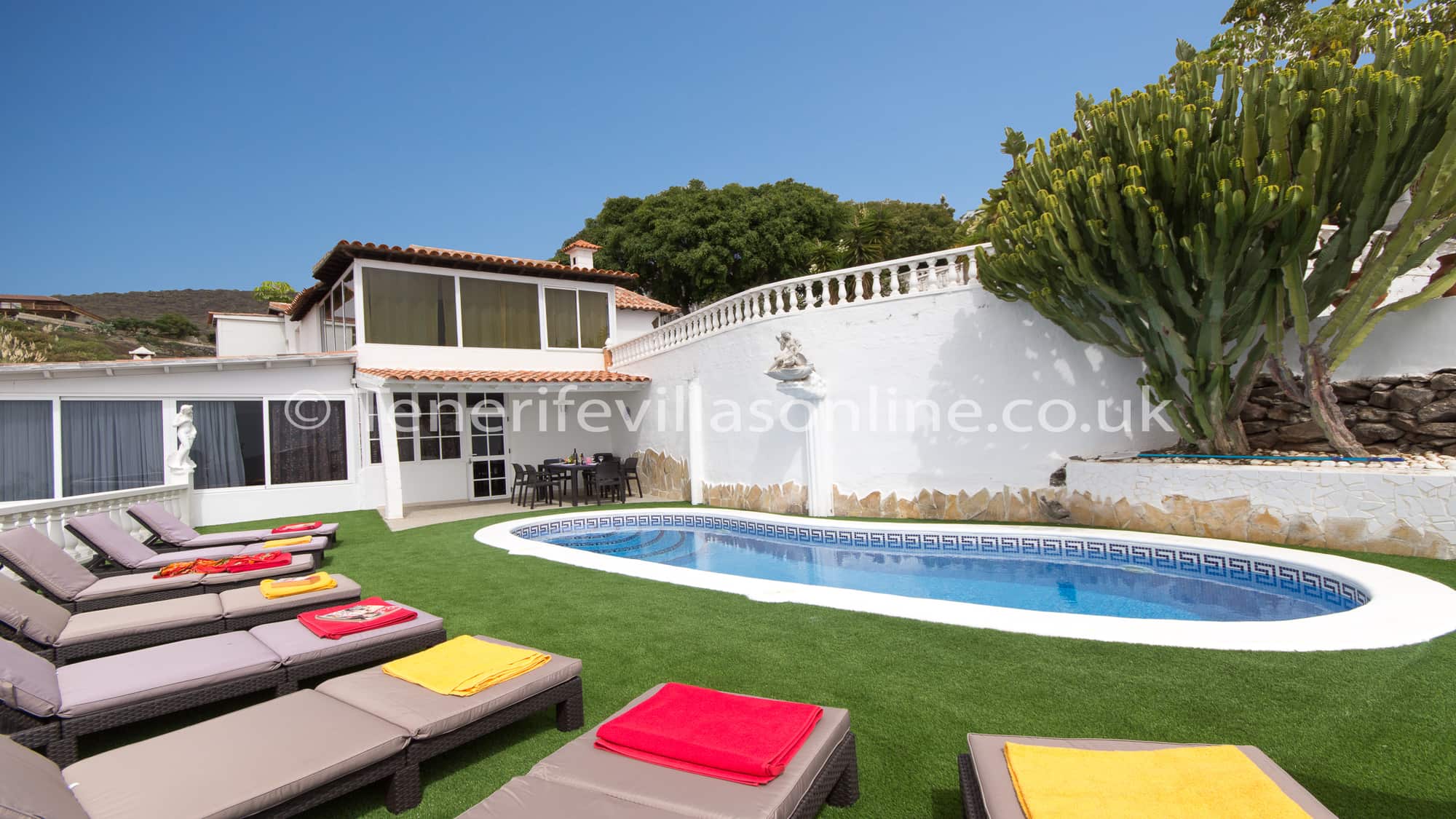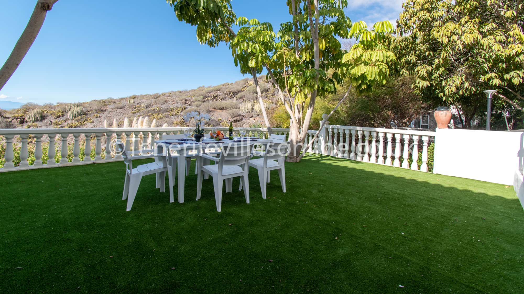All 4 bedrooms have fitted wardrobes and have the same size beds: 2 single beds which can be put together to make a king size. The rear terrace, set in Canarian tranquil gardens fitted with artificial grass has a outdoor dining area under shaded pergola, perfect for “alfresco” style of dining. The huge pool terrace has a 8 x 3 meter private pool with roman style steps, also fitted with artificial grass and sun loungers. From its elevated position, the secluded pool terrace has beautiful views of the surrounding area, making this home a memorable place and perfect for a relaxing holiday.