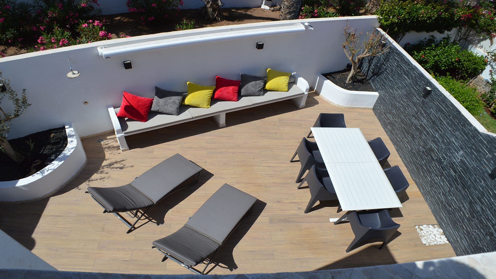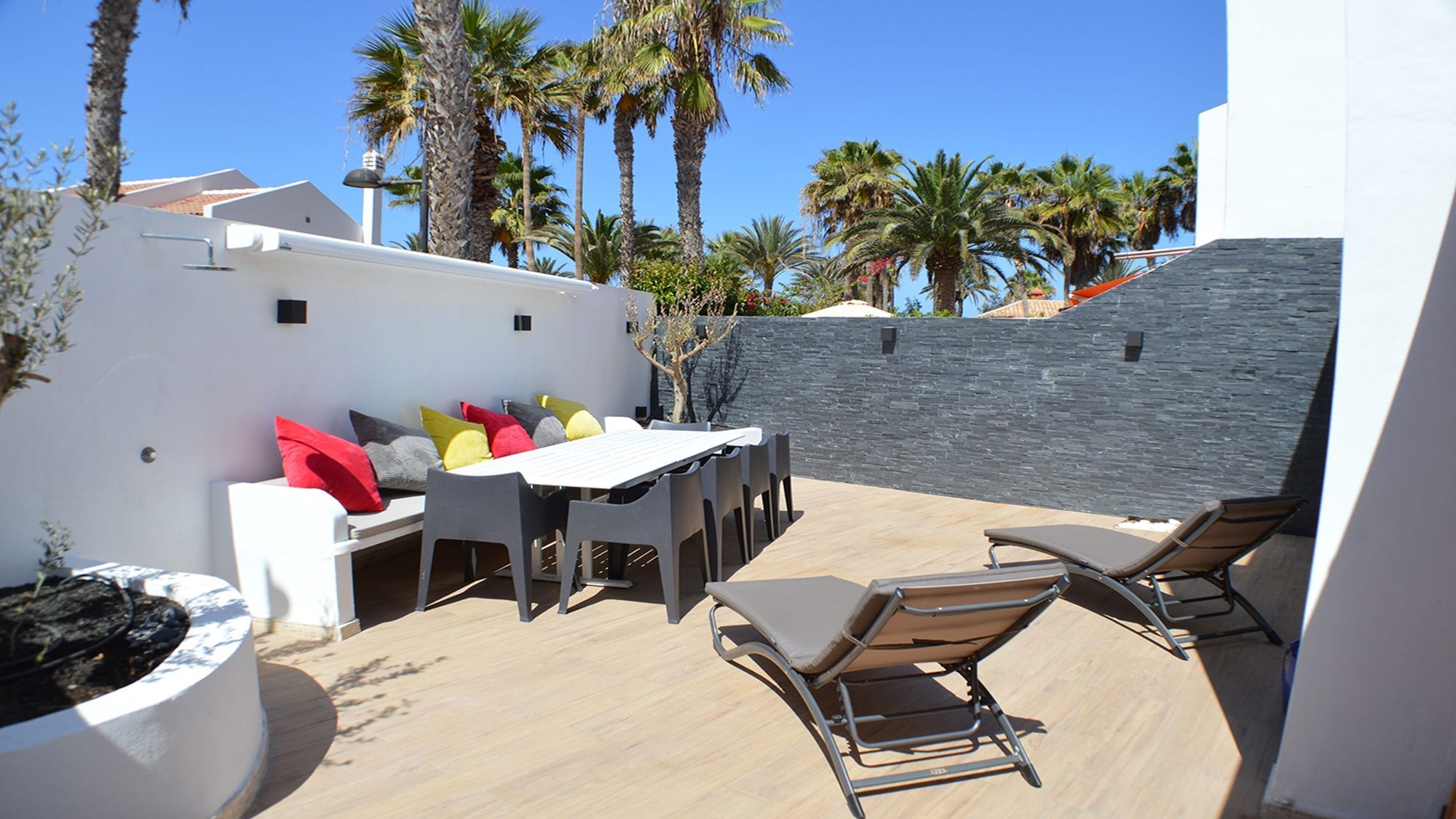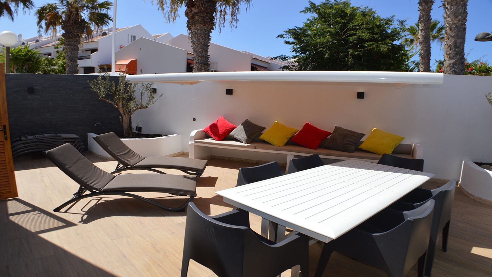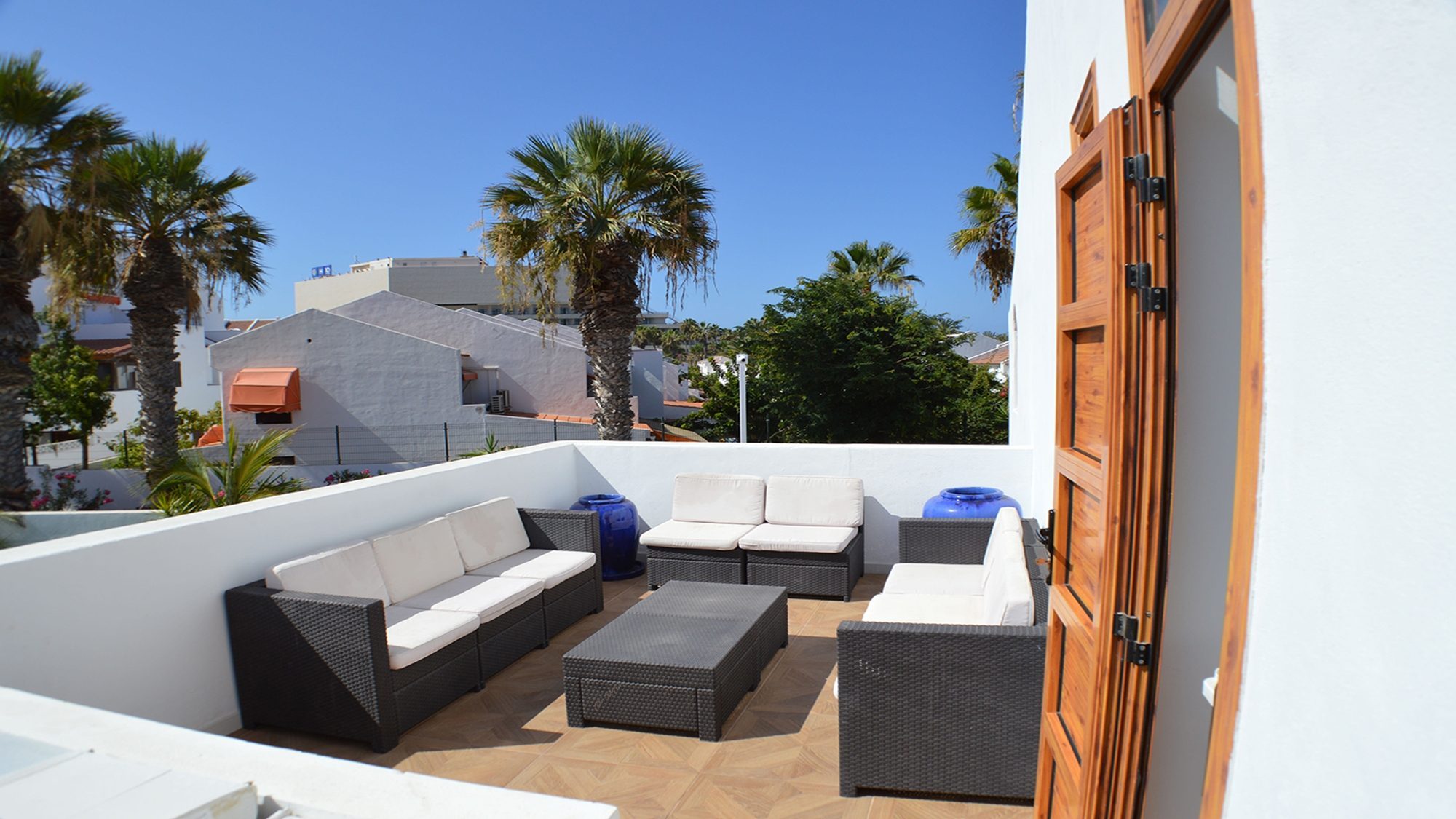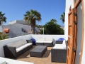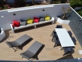 Decorated with a contemporary style, the enclosed terrace is surrounded by an oasis of palm trees. At sunset the multicolored sky appears glistering down, through the tropical plants and provides pleasure, relaxation and increasing every moment with splendor. Bedroom 1 balcony holds room for a comfortable seating area for 6, here you can sit back and indulge in the sea views. The attractive roof terrace embellished with comfort is a perfect place for the whole group to gather, unwind and experience the wonders of life.
