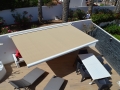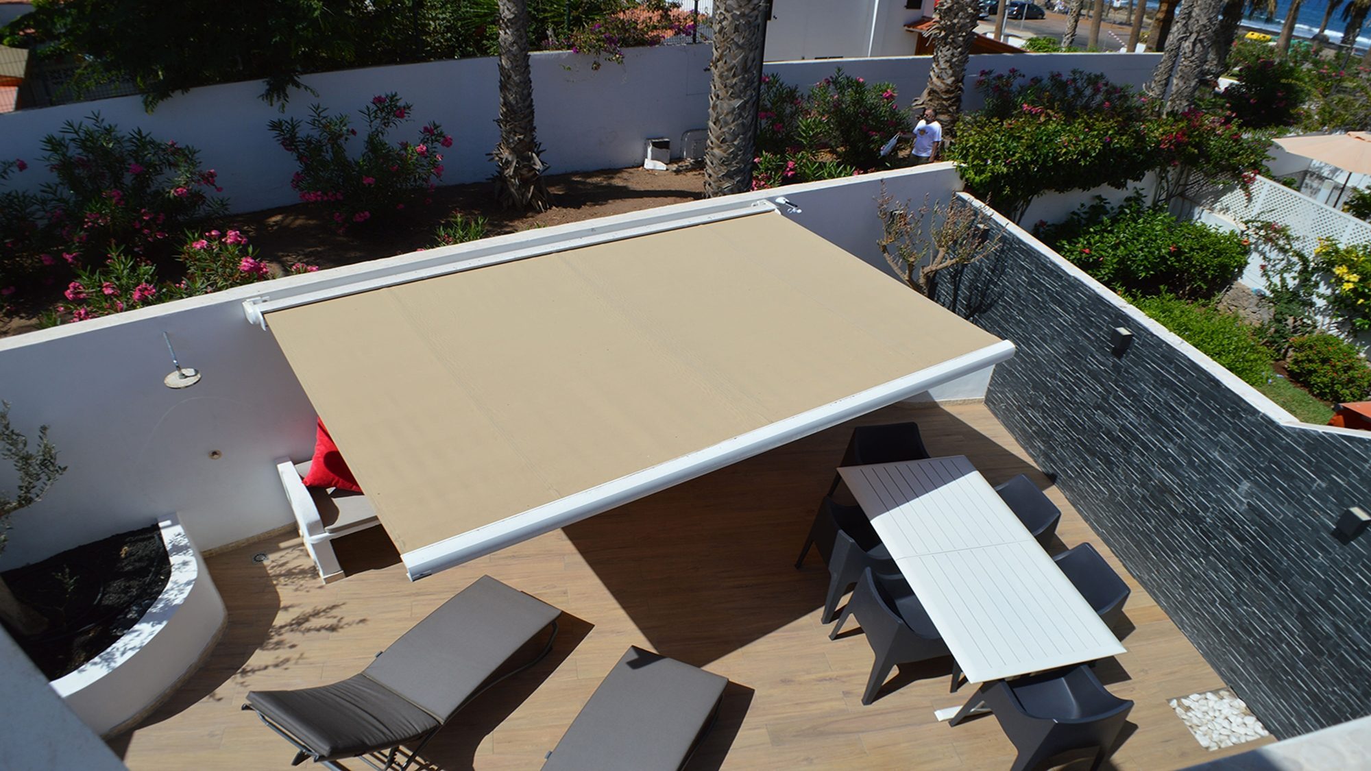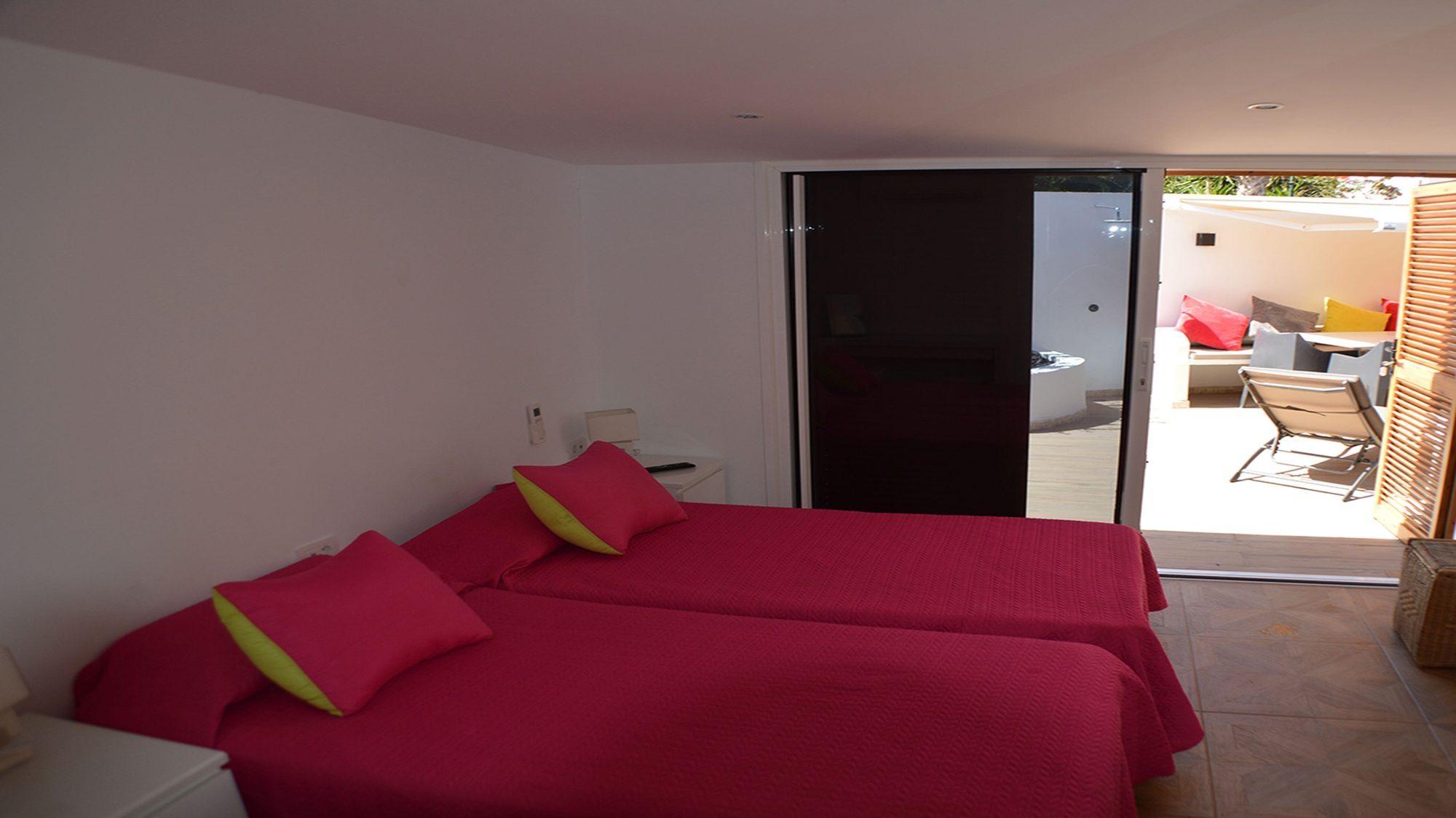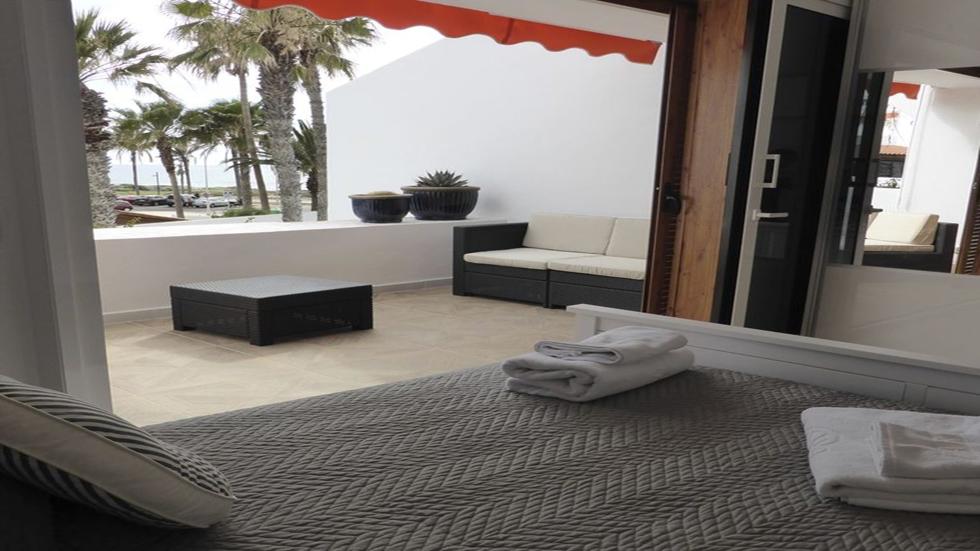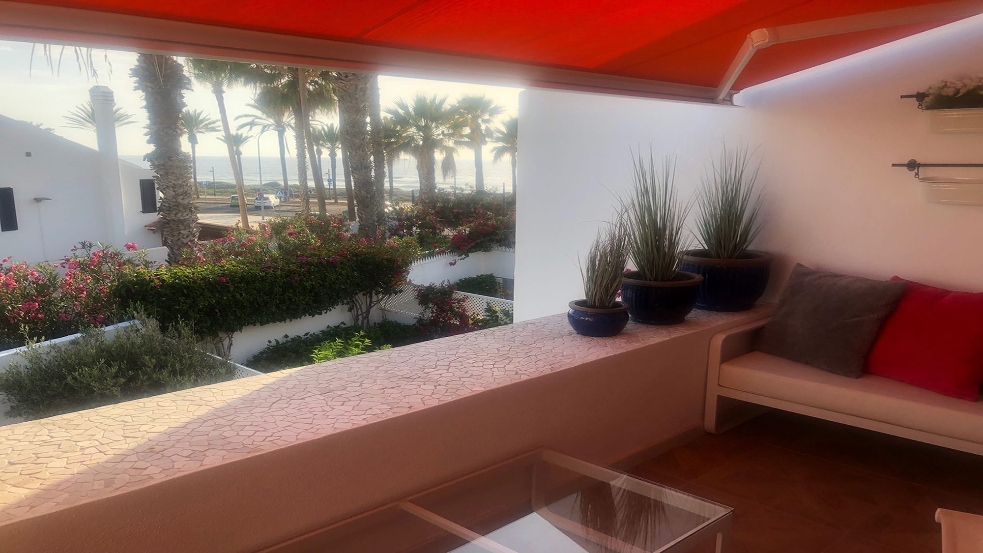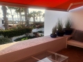 Decorated with a contemporary style, the enclosed terrace is surrounded by an oasis of palm trees. At sunset the multicolored sky appears glistering down, through the tropical plants and provides pleasure, relaxation and increasing every moment with splendor. Bedroom 1 balcony holds room for a comfortable seating area for 6, here you can sit back and indulge in the sea views. The attractive roof terrace embellished with comfort is a perfect place for the whole group to gather, unwind and experience the wonders of life.