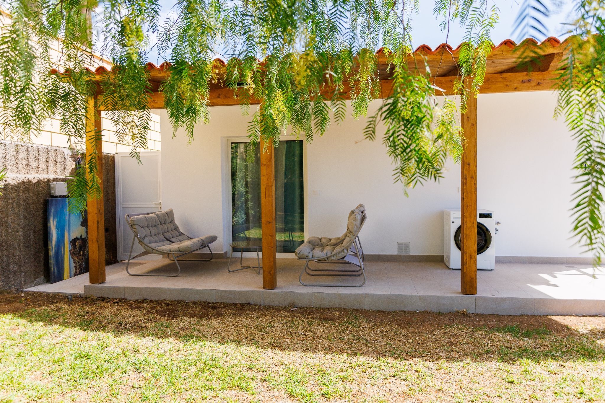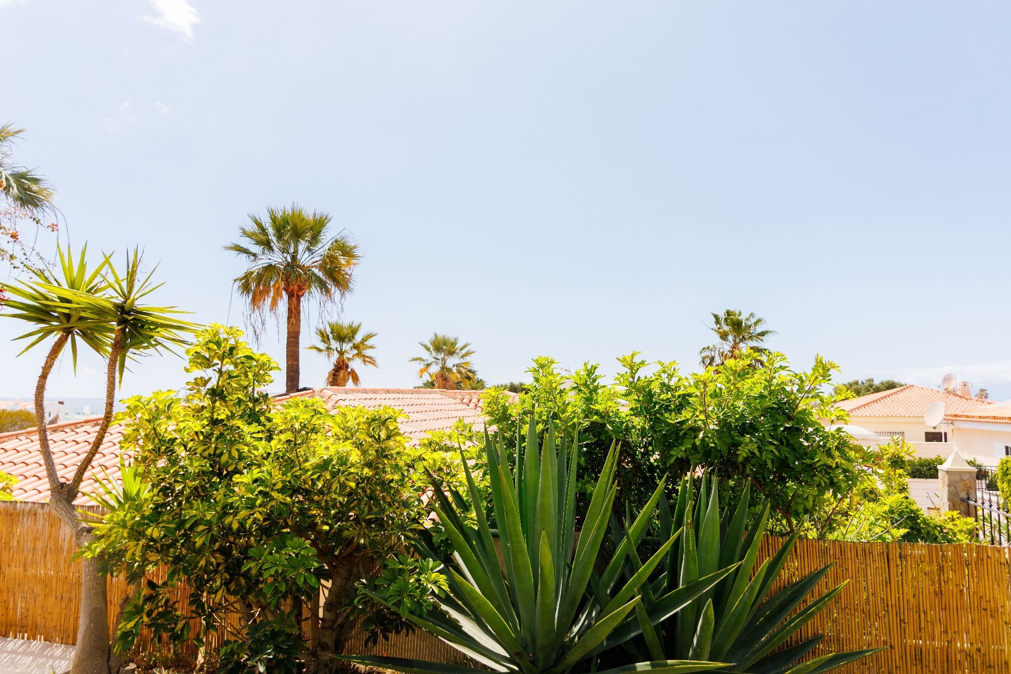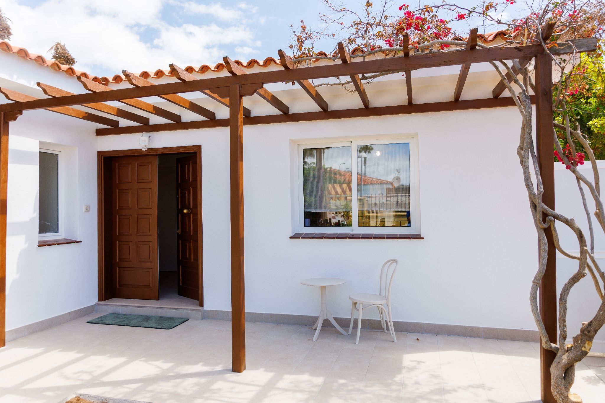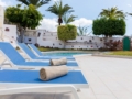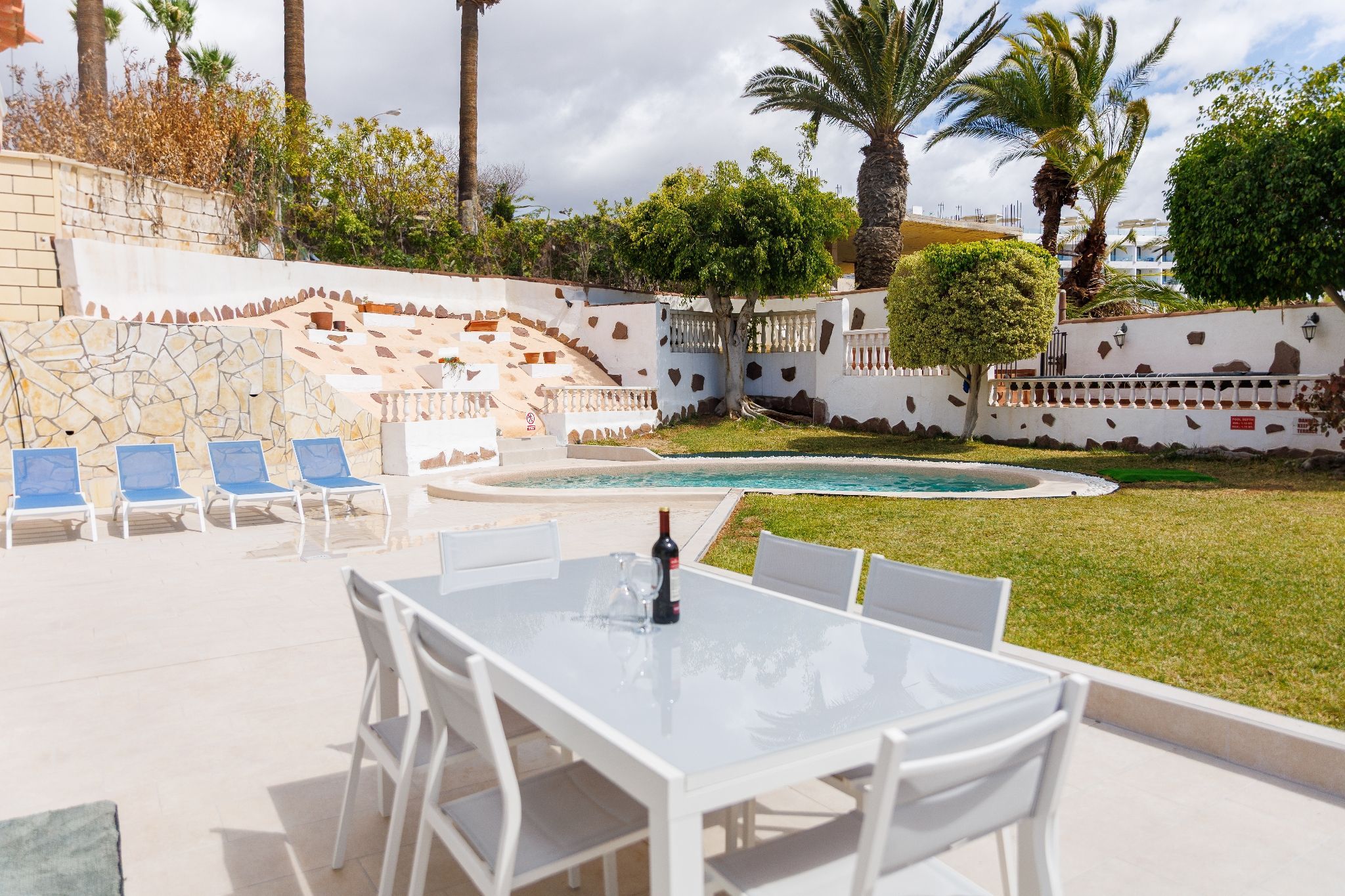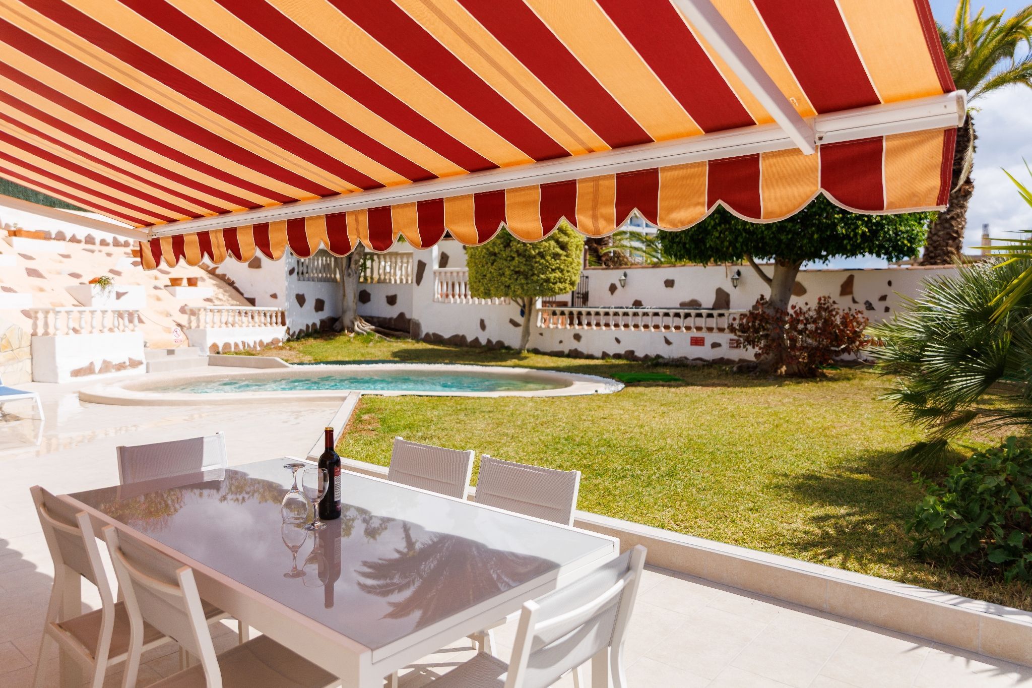 Exterior: dining table for 6, shaded pergola, sun loungers, table and chairs with parasol, canarian gardens