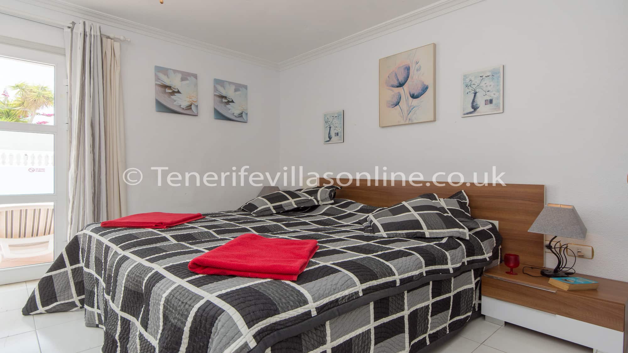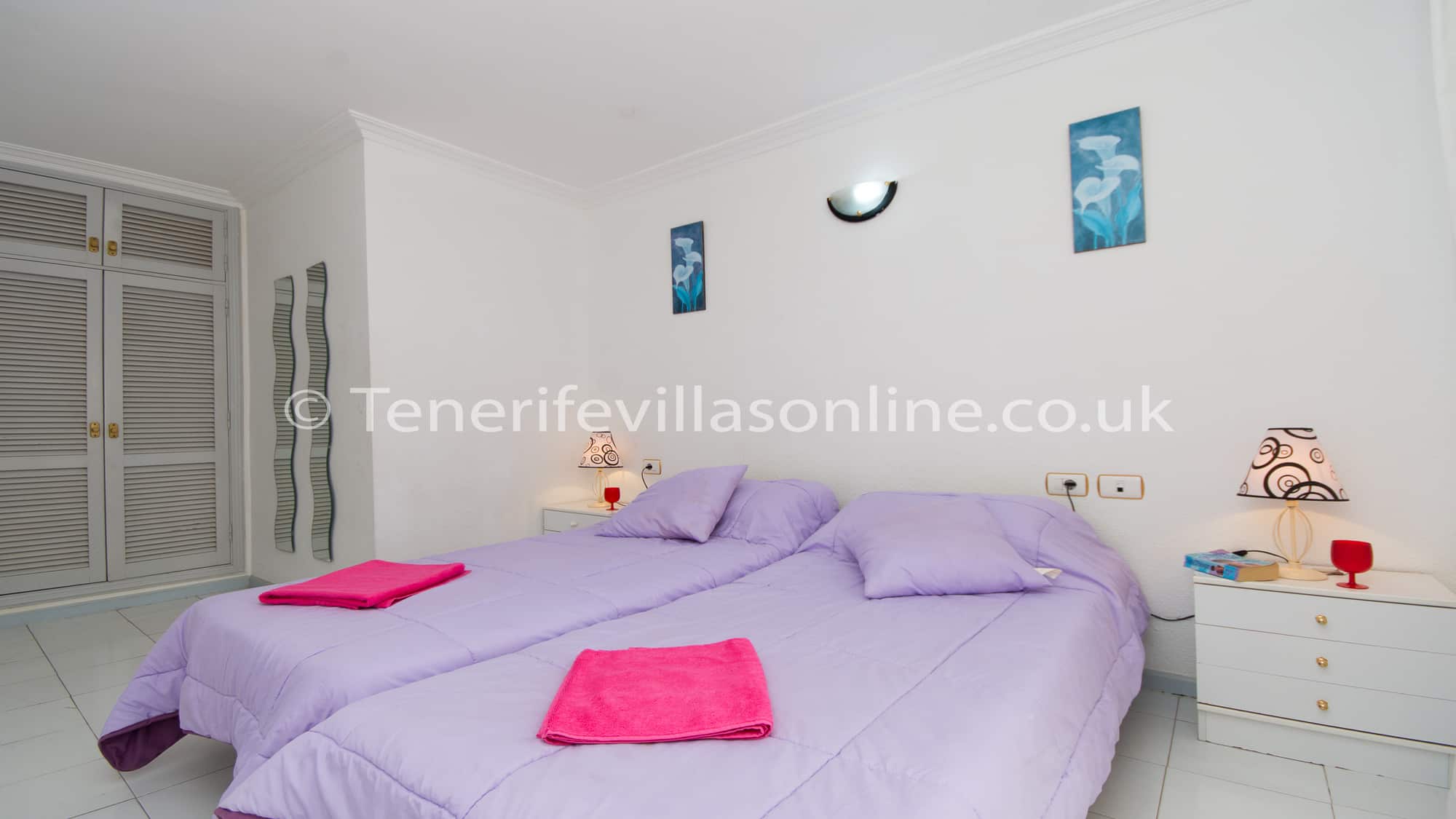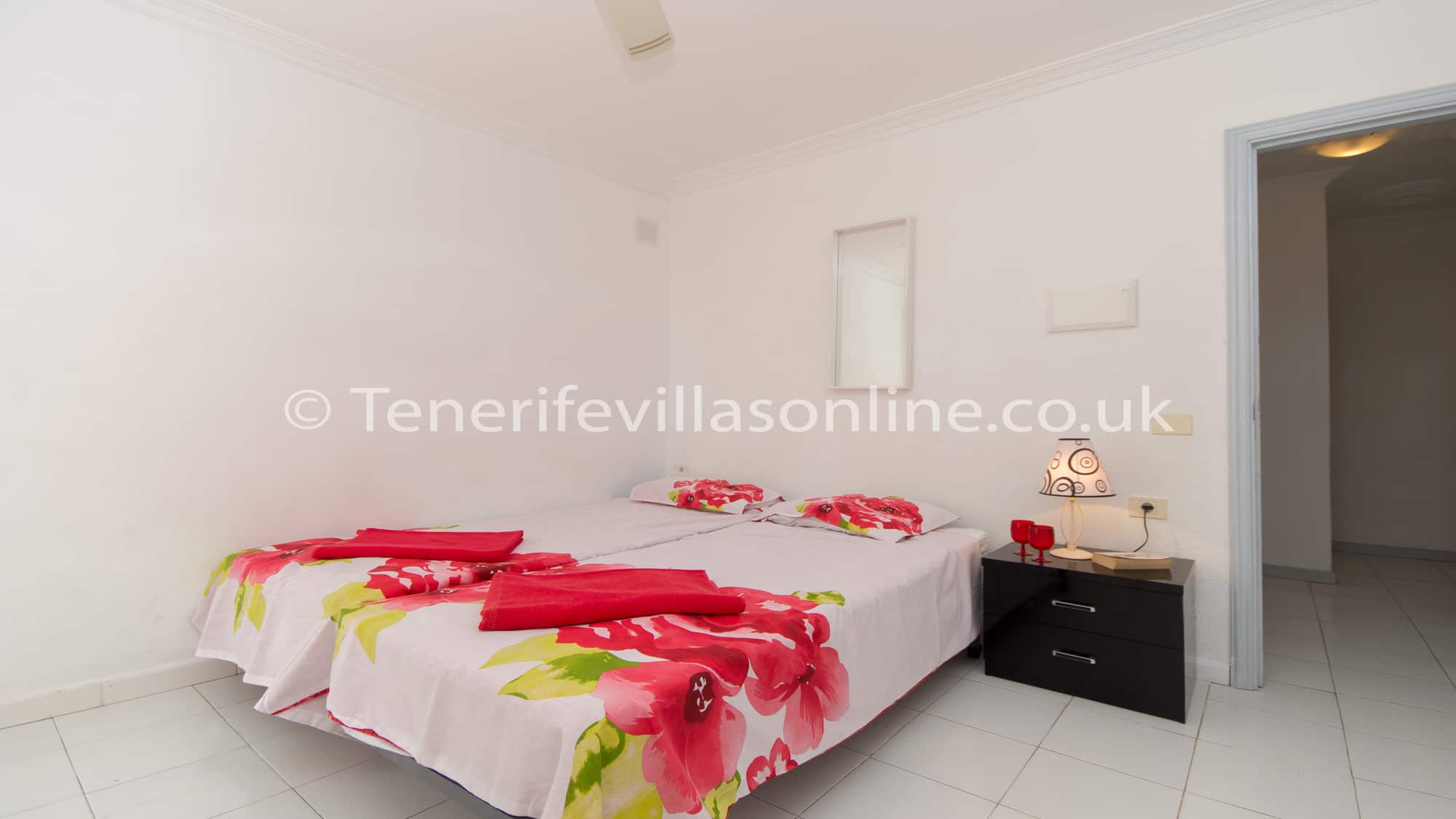 Bedroom 1: single beds (x2), large wardrobe space, ceiling fan, en suite, patio doors to pool terrace