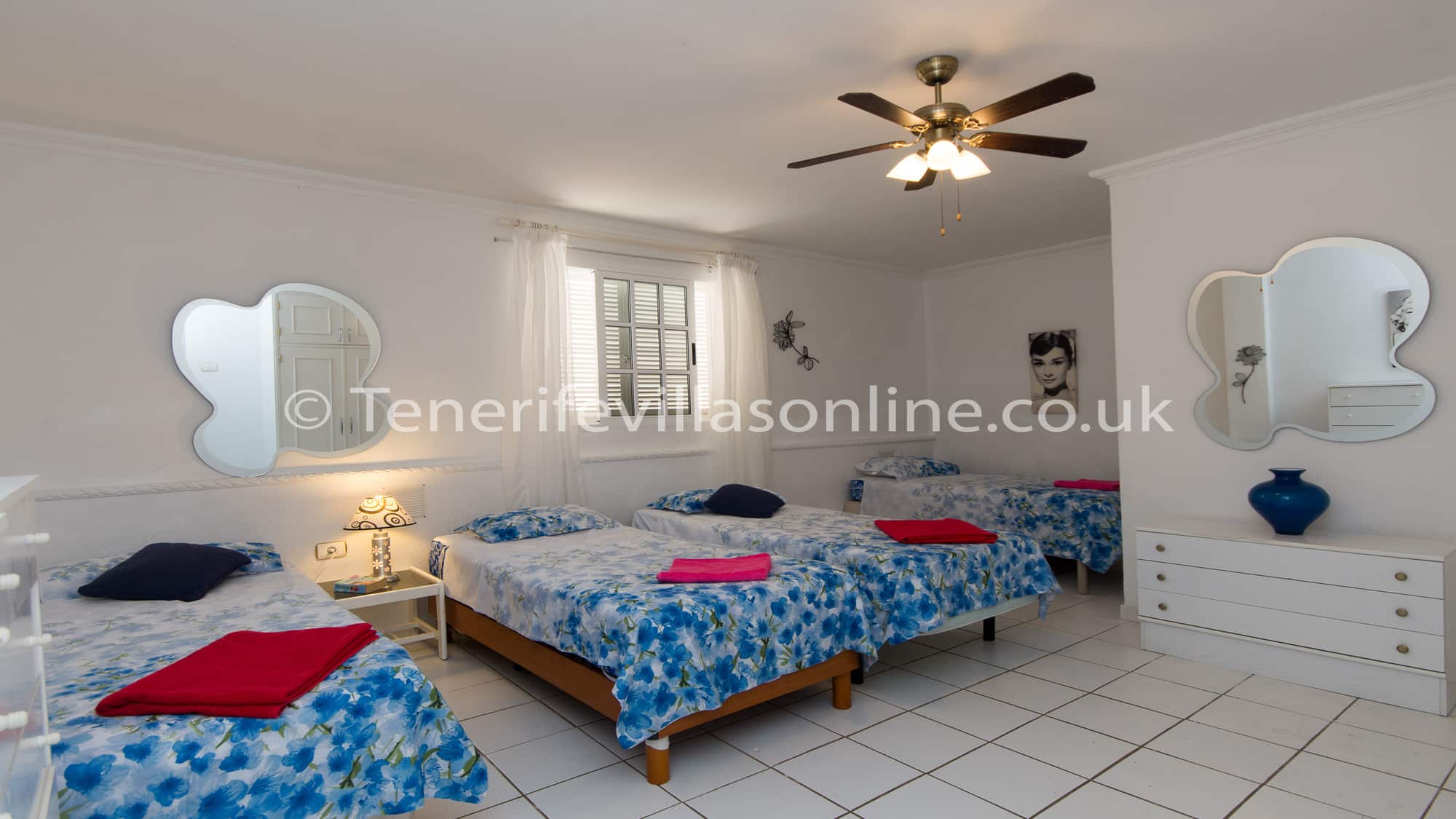 Bedroom 3: single beds (x2), wardrobe space, ceiling fan, patio doors to terrace