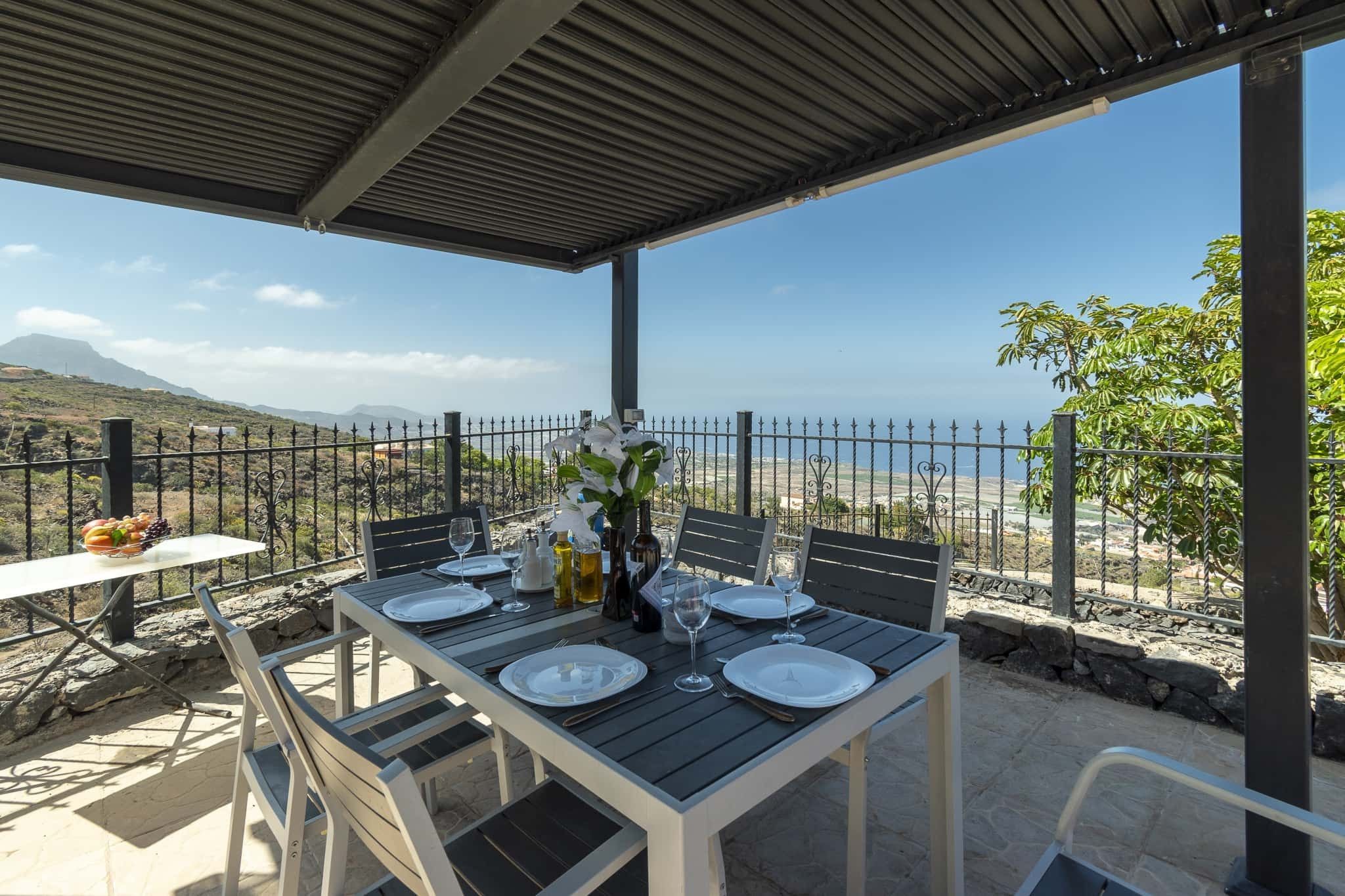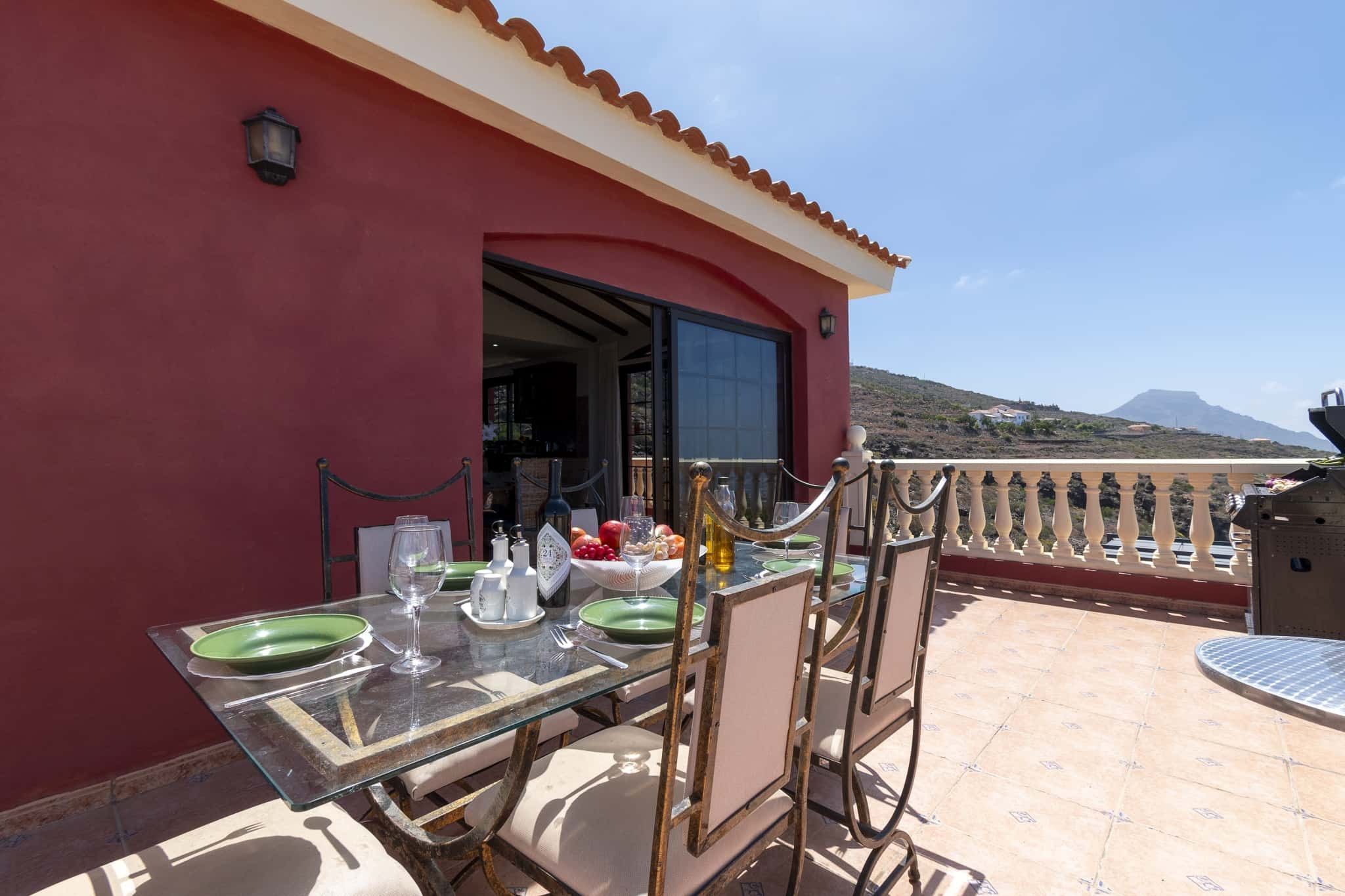 The large 10 x 4 metre private electric heated oval shaped pool is surrounded by its beautiful terrace with with several sets of patio furniture, sun loungers, outside shower. For your enjoyment there is a gas BBQ and separate bar with fridge and 4 stools to get you in the holiday mood. The outside of this villa is totally private and not overlooked, There is also a selection of other terraces and Canarian gardens one of which even has a cave. From all the terraces there are wonderful views of the Atlantic ocean and the south of Tenerife. This unique villa sleeps up to 8 people.