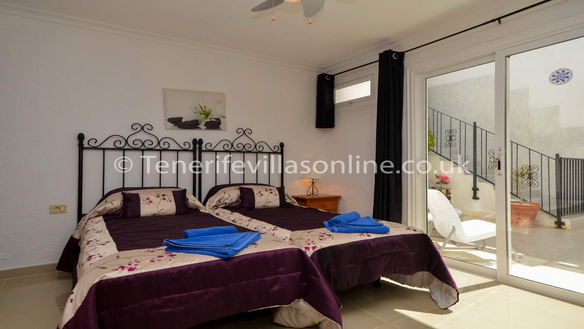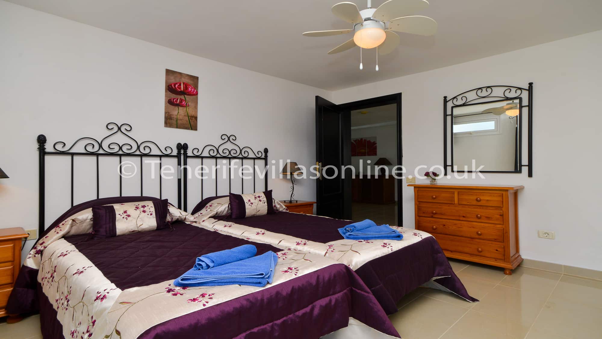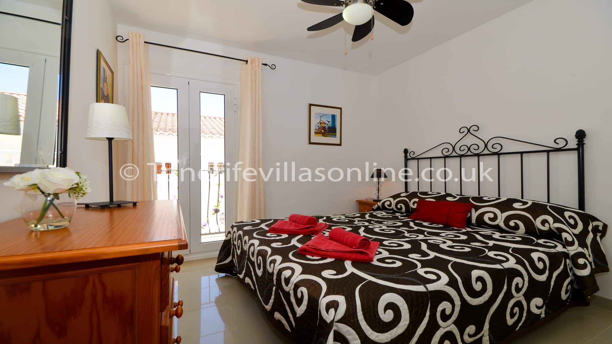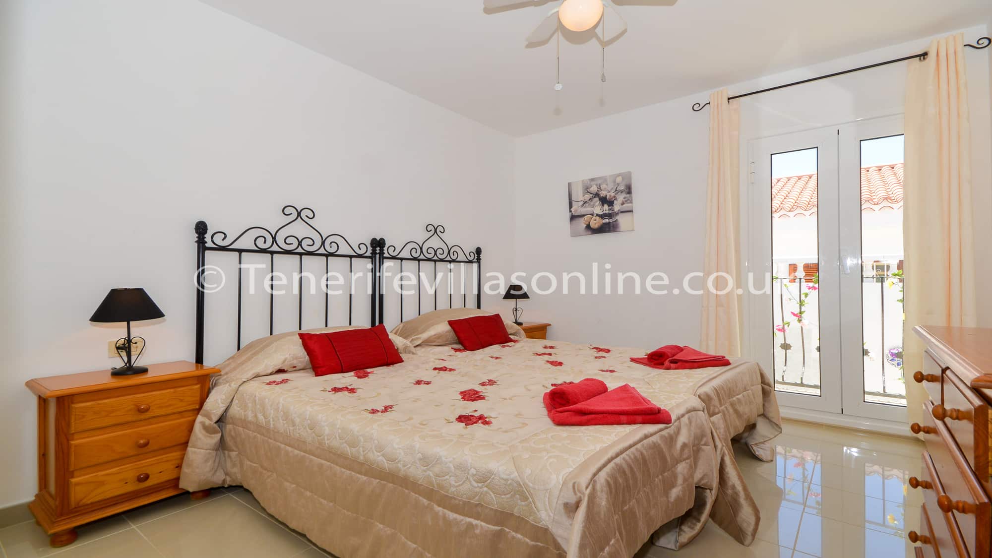 Bedroom 2: double beds, fitted wardrobes, ceiling fan, patio doors to balcony